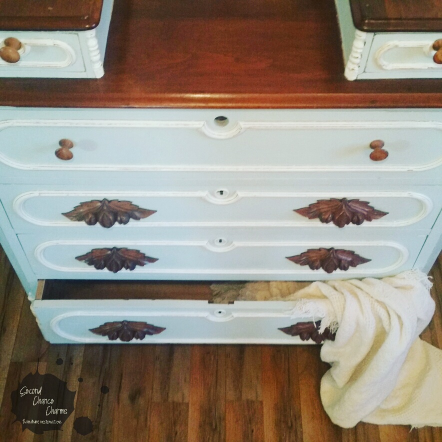 I refinished this dresser in a custom light blue color, mixing Sherwin-Williams colors Riverway and Snowbound together. I used Snowbound in the accents and lightly disressed in the same area. The walnut hardware is original and restained in chestnut. The top has been restained in chestnut as well. I really love the way this piece turned out. She is up for sale as well!
