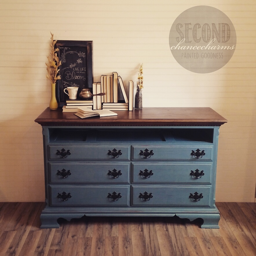 I had refinished a dresser and used it in my house for about a year. I had a client come by to pick up some pieces and she saw it and fell in love. She wanted a few minor adjustments. I removed the first row of drawers and replaced it with a shelf so she could put DVR’s and Cable boxes in there. As well as updated original hardware in bronze. This piece was refinished in Sherwin-Williams Riverway and the top stained in Early American.