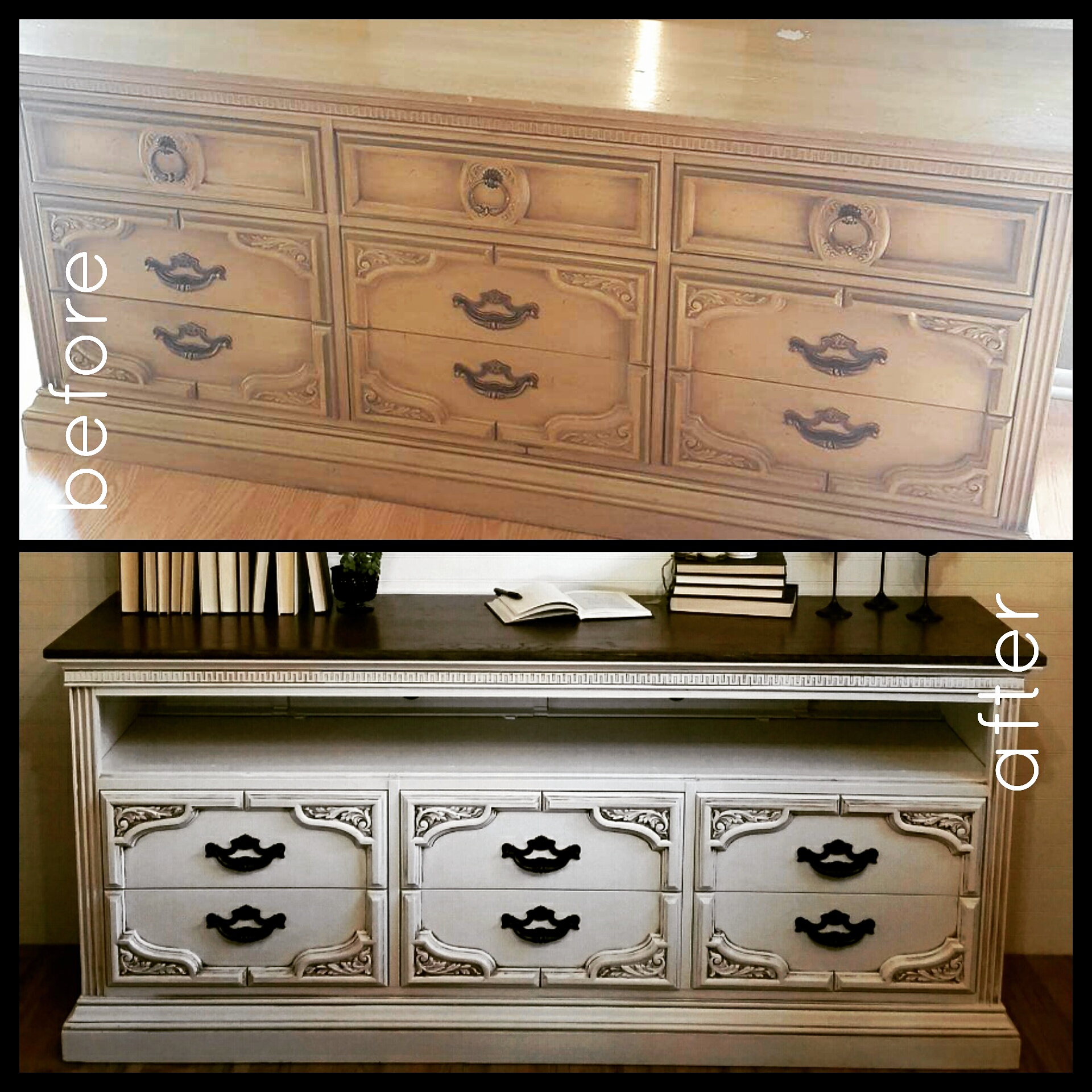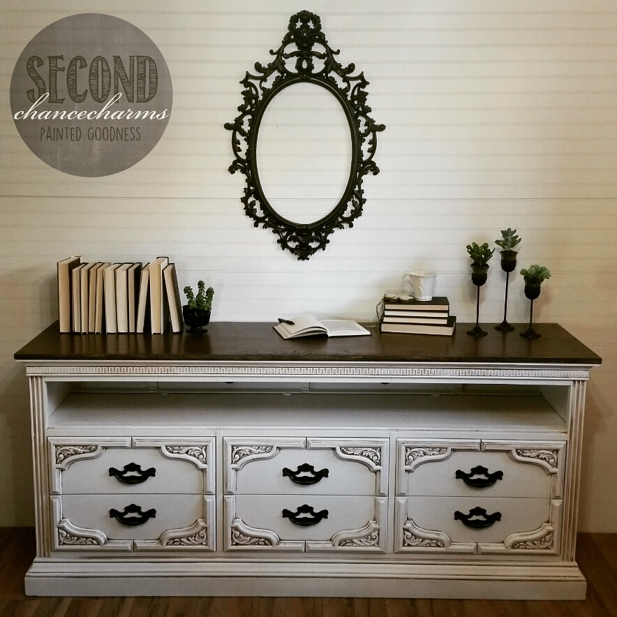 Dresser turned TV Console- One of the best things happening in the décor world today! Every home is unique because of this! My client found this dresser at an Estate sale. She wanted the top row of drawers taken out and replaced with a shelf for the DVR box and knick-knacks. This lovely piece was refinished in Sherwin-Williams Snowbound and glazed in brown. The original hardware pulls were updated in bronze. A rustic look top using white and Dark Oak stain.