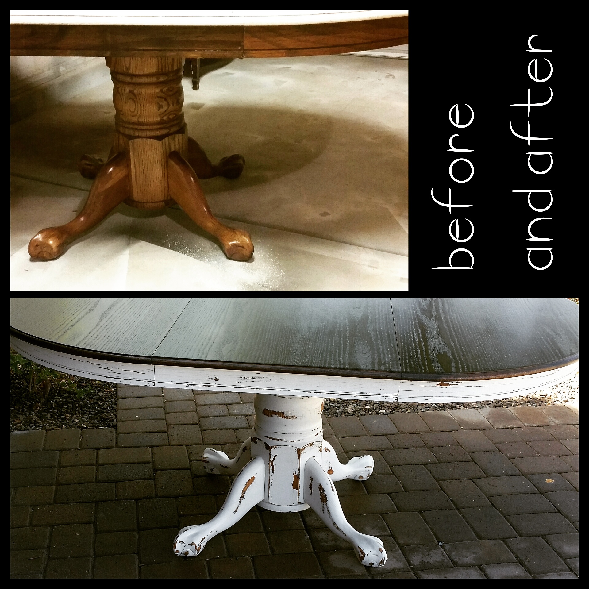 I love refinishing dining tables. This is the place for family discussion, togetherness and celebration. My client brought in her grandmothers old oak dining table, one that looks just like mine, which is from my mother! She wanted the same set up as me- Dark stained top and distressed bottom. Refinished in Sherwin-Williams Snowbound and stained in Dark Oak- Perfect for every farmhouse lover!