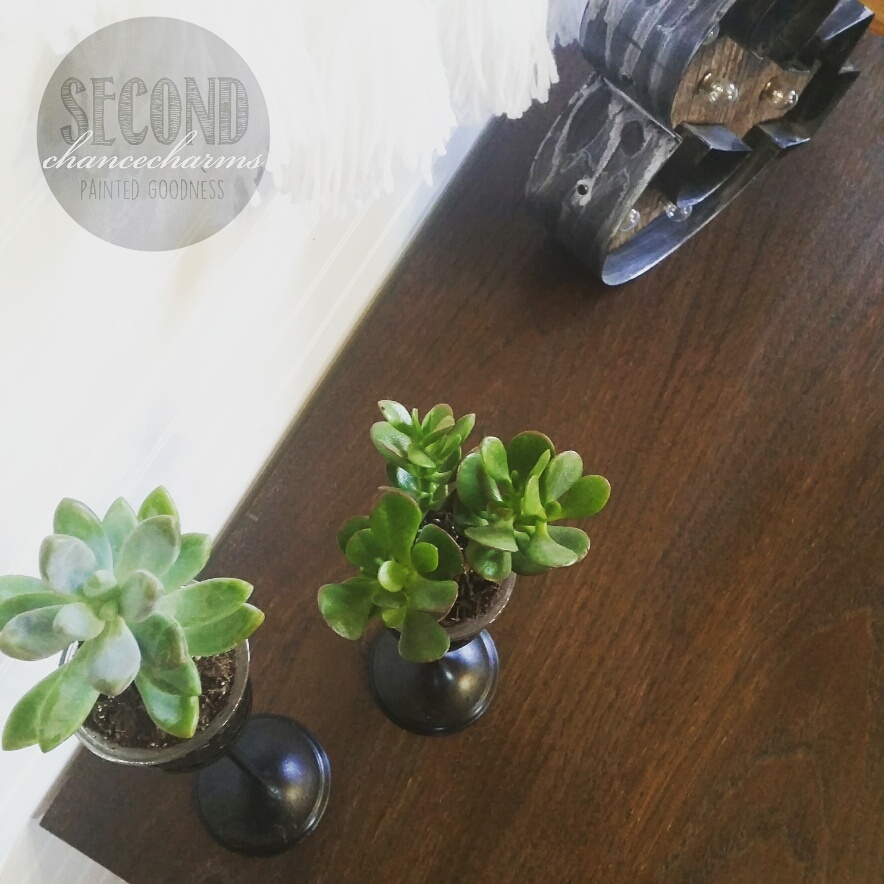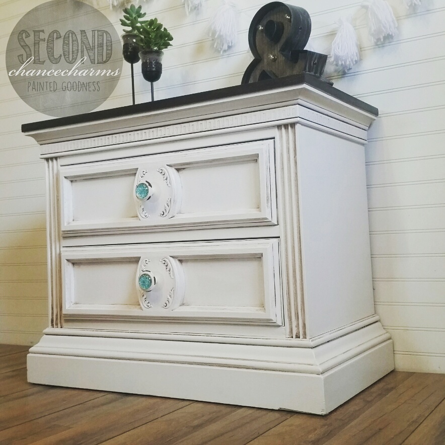 Remember the dresser turn TV console I recently refinished, my client had found it at an Estate sale!? It came with a nightstand and she wanted to use it as a end table in her family room near the TV console. Relocated the knob holes, and updated them with some very pretty knobs she found at Hobby Lobby. Refinished in Sherwin-Williams Snowbound, glaze in brown. Dark Oak stained top.