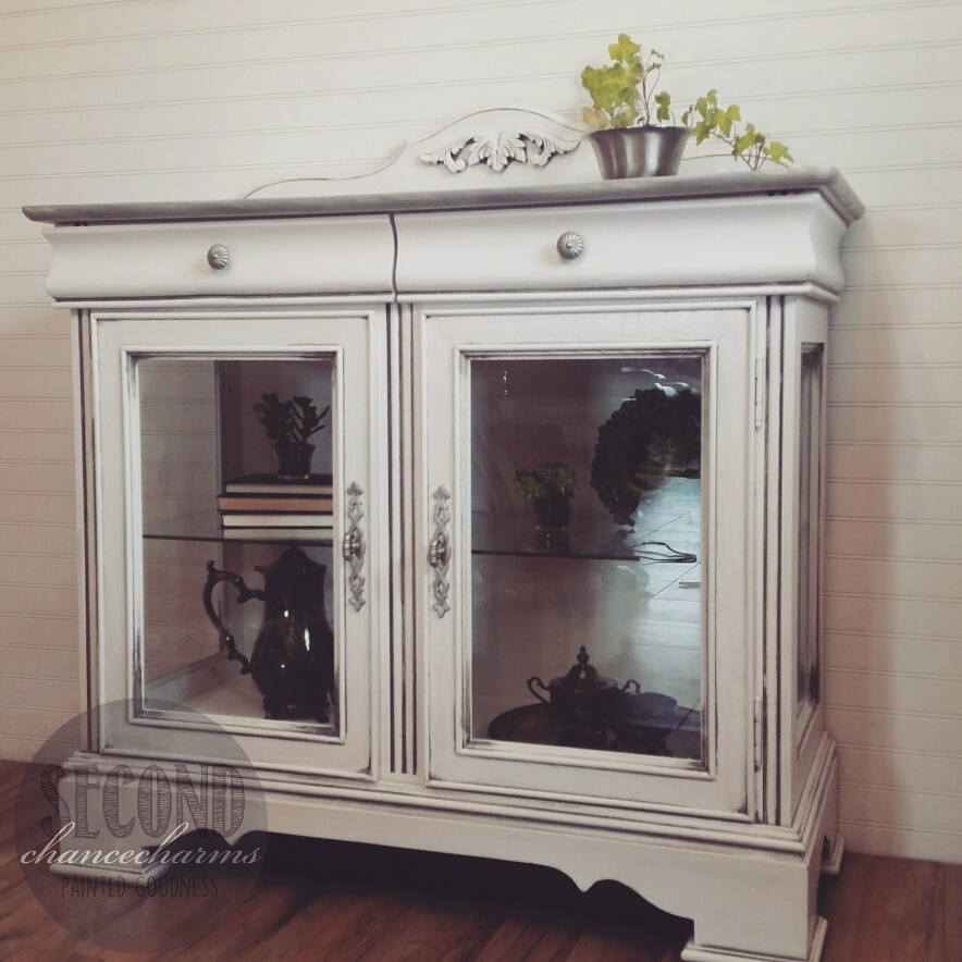 Refinished in Sherwin-Williams Snowbound and glazed in Grey. Replaced broke glass door with a solid glass door pane. Stained the top in a grey with white wash look. Original hardware updated in silver.