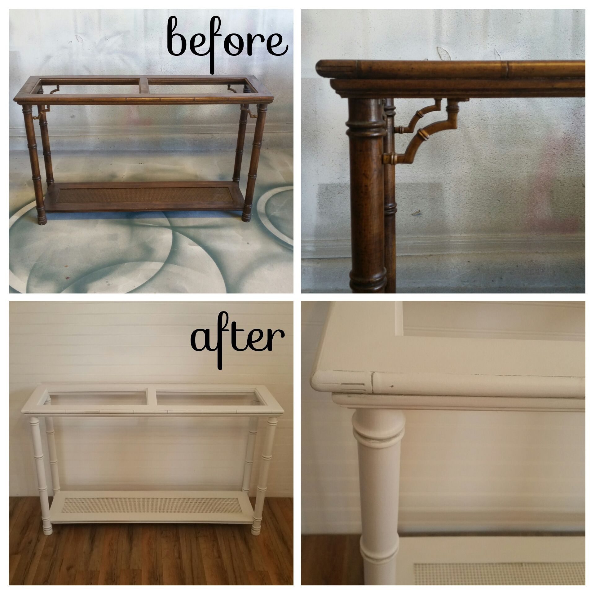 My client found this guy at a neightbors garage sale! She wanted to rid of the bambo look by removing the little angles that were underneath top, which were not supporting the piece so it worked out great!