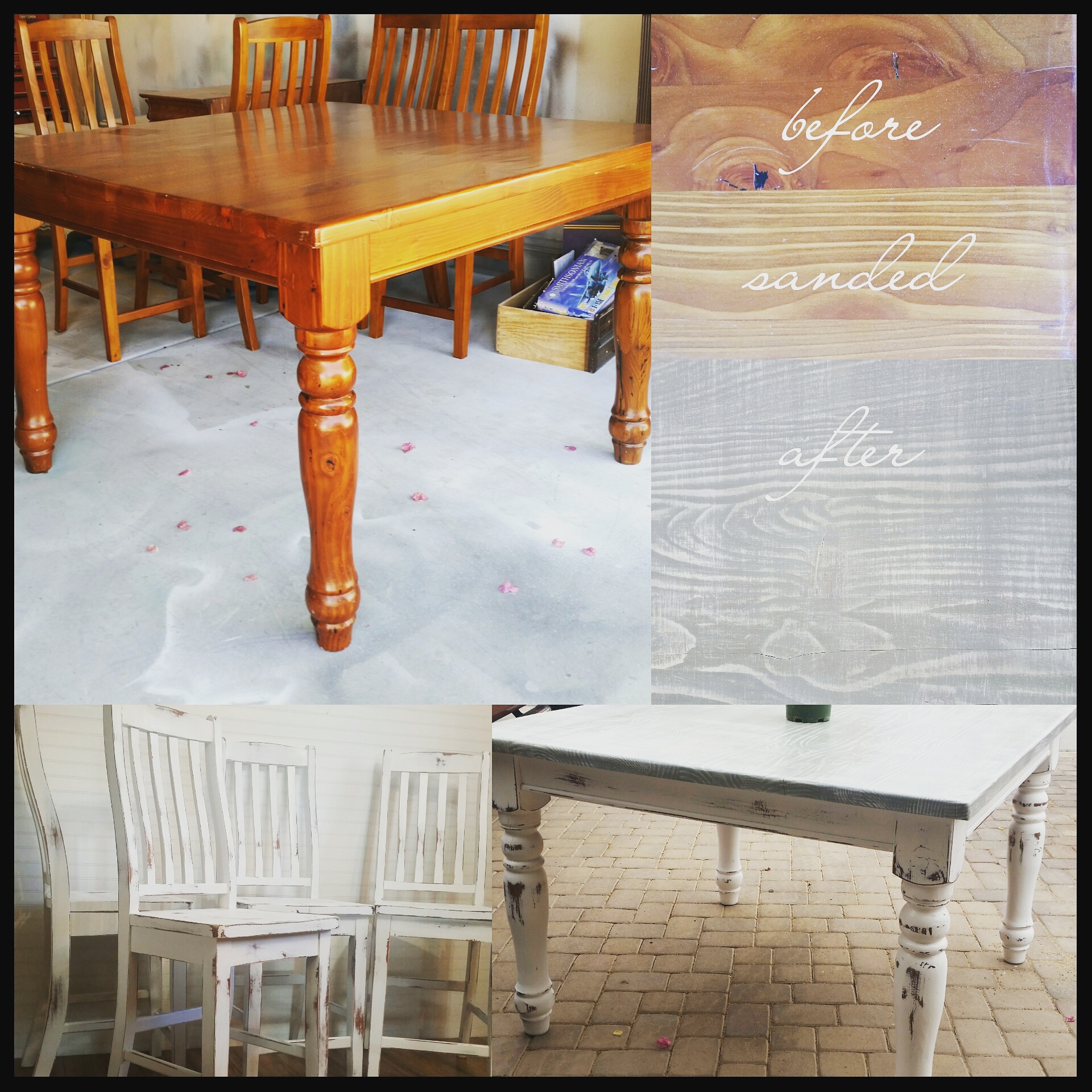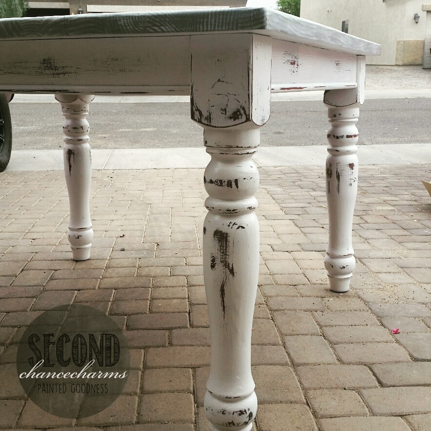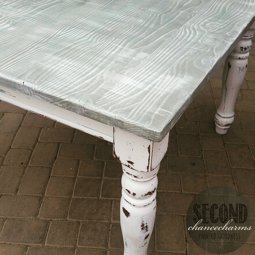 Dining Table Published on April 8, 2016April 25, 2016 by Second Chance CharmsLeave a comment Remember the bar stools I recently finished? Here is the table to finish the set. Top Stained in a grey and white wash. Base is distressed in Sherwin-Williams Snowbound.