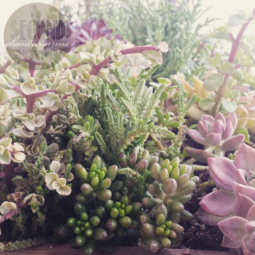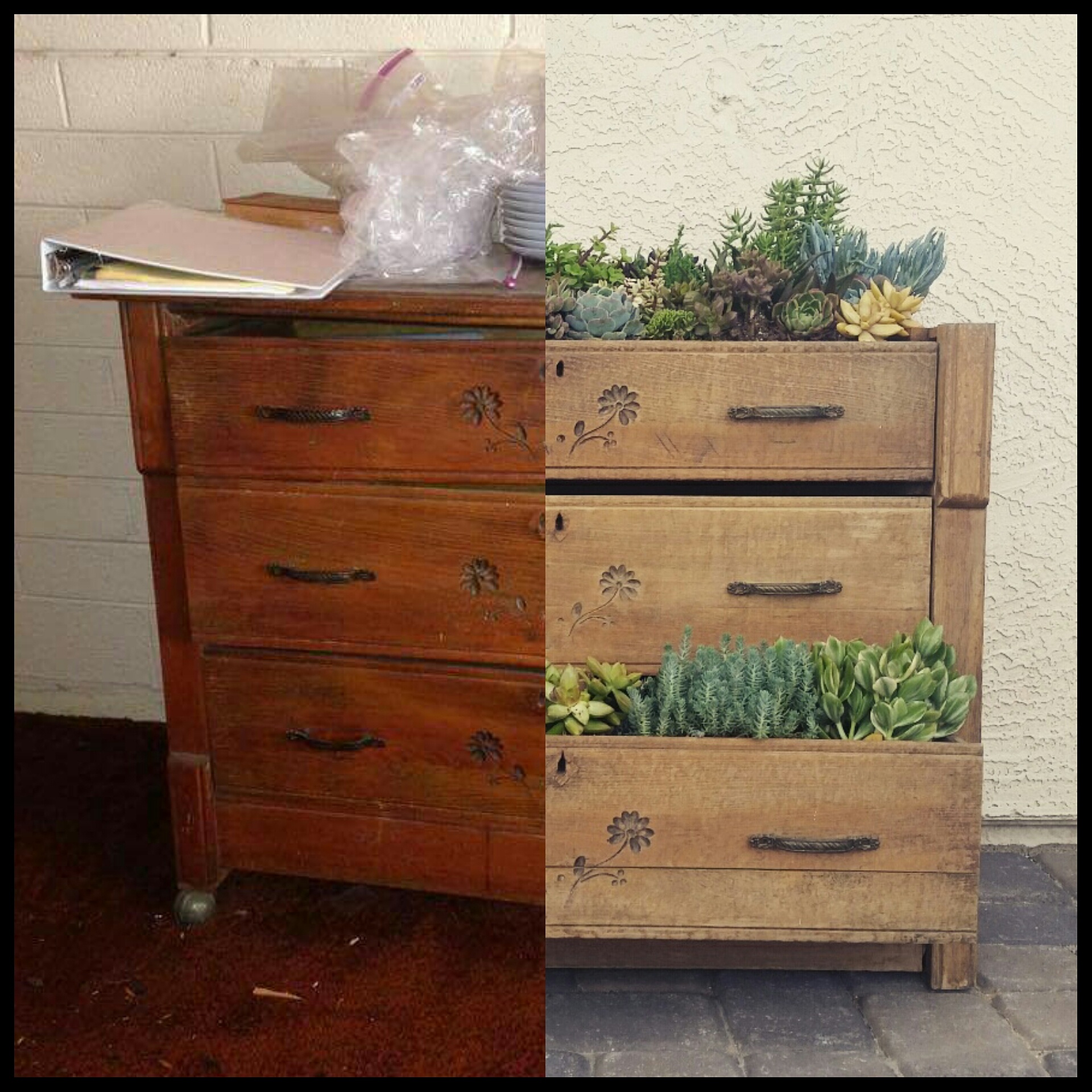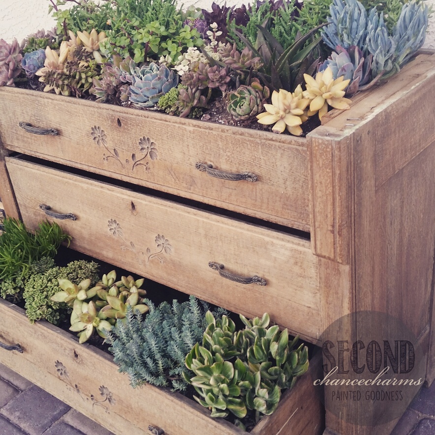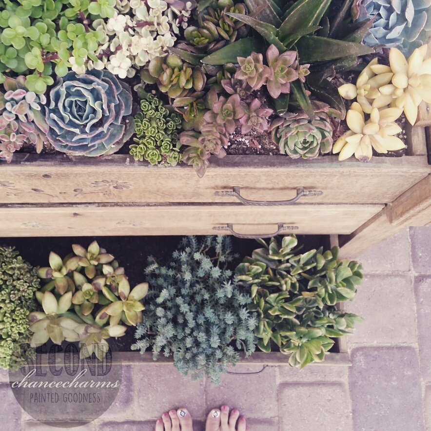I was given this old broken dresser by a client. She couldn’t remember his story but knew he was old and in bad shape. The drawers had no sliders. The bones of this piece were missing or broken causing him to lean to the left. Nothing was going smoothly for this guy. I had hopes of restoring this piece. I took the top off- due to it being cracked down the center and was going to replace it. As I was waiting for my wood glue to dry on the side slats connecting the main bone joints I was looking at him thinking, how will I refinish him once done. No top. Drawers were sticking out. BOOM. It hit me like a ton of bricks! DUH! Of course! Succulent Garden!!!!