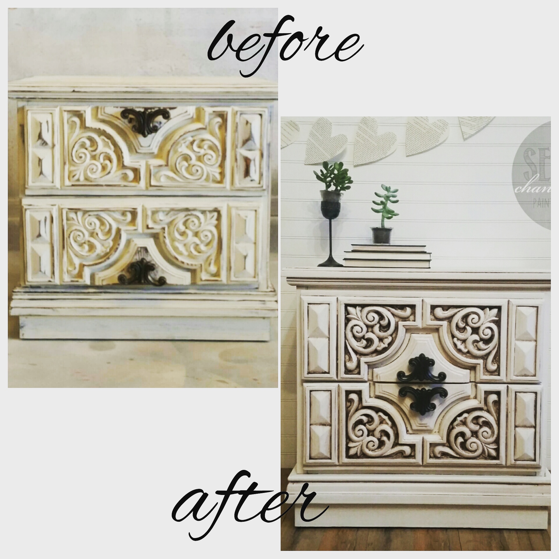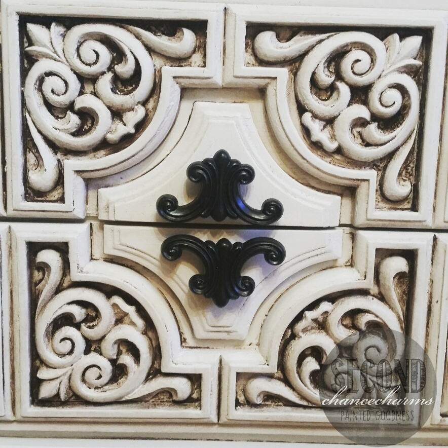 My client found this little distressed end table at a market. I rearranged the drawers to the correct placement. Refinished in Sherwin-Williams Snowbound and glazed in brown. Original Hardware updated in bronze. Can you see the difference between distressing and glazing?