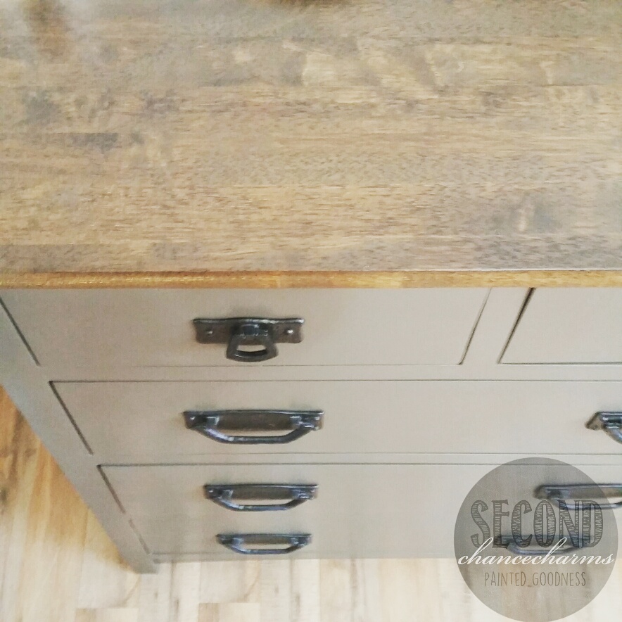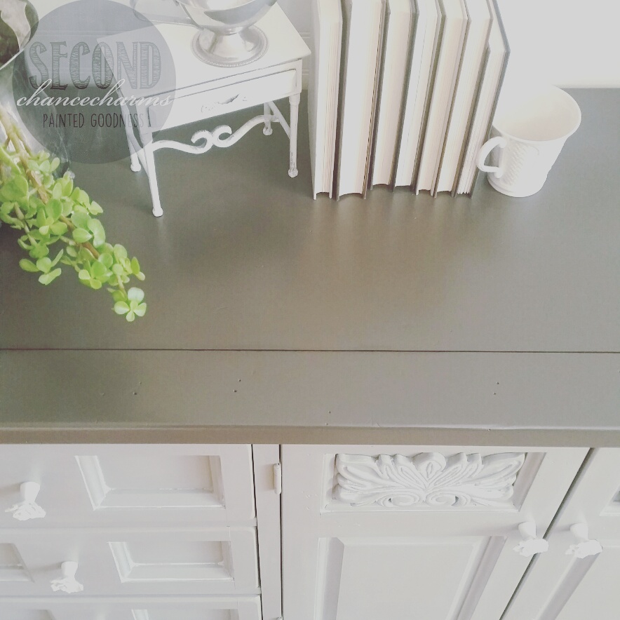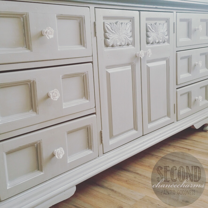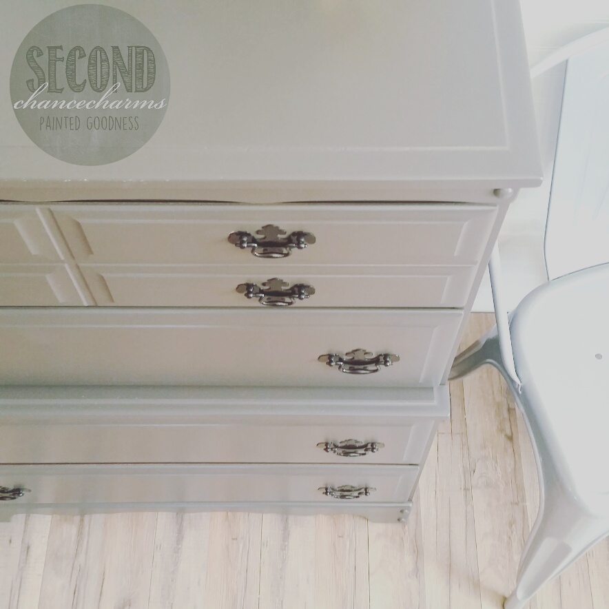Look familiar!? Refinishing my clients master bedroom one piece of furniture at a time! Nightstands have been completed, here is the dresser, armoire is next! Refinished in Sherwin-Williams Felt Wool and glazed in white. The top finished in Sherwin-Williams Black Fox. Replacement of the knob location and updated them with these gorgeous white flower porcelain ones my client found on Amazon.