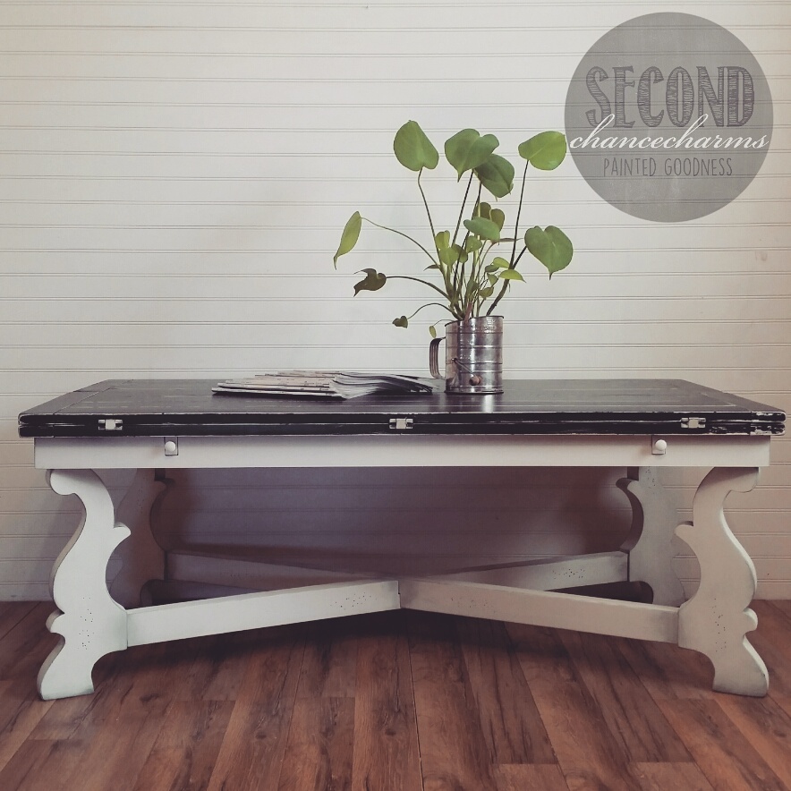This piece is pretty darn cool! The top of the coffee table folds open creating more space. My client chose Sherwin-Williams Tricorn Black for the top, distressed in the lines. The bottom we went with Sherwin-Williams Snowbound and glazed in black. Grandma’s prefect piece to expand open when the grandkids visit and need more drawing space!