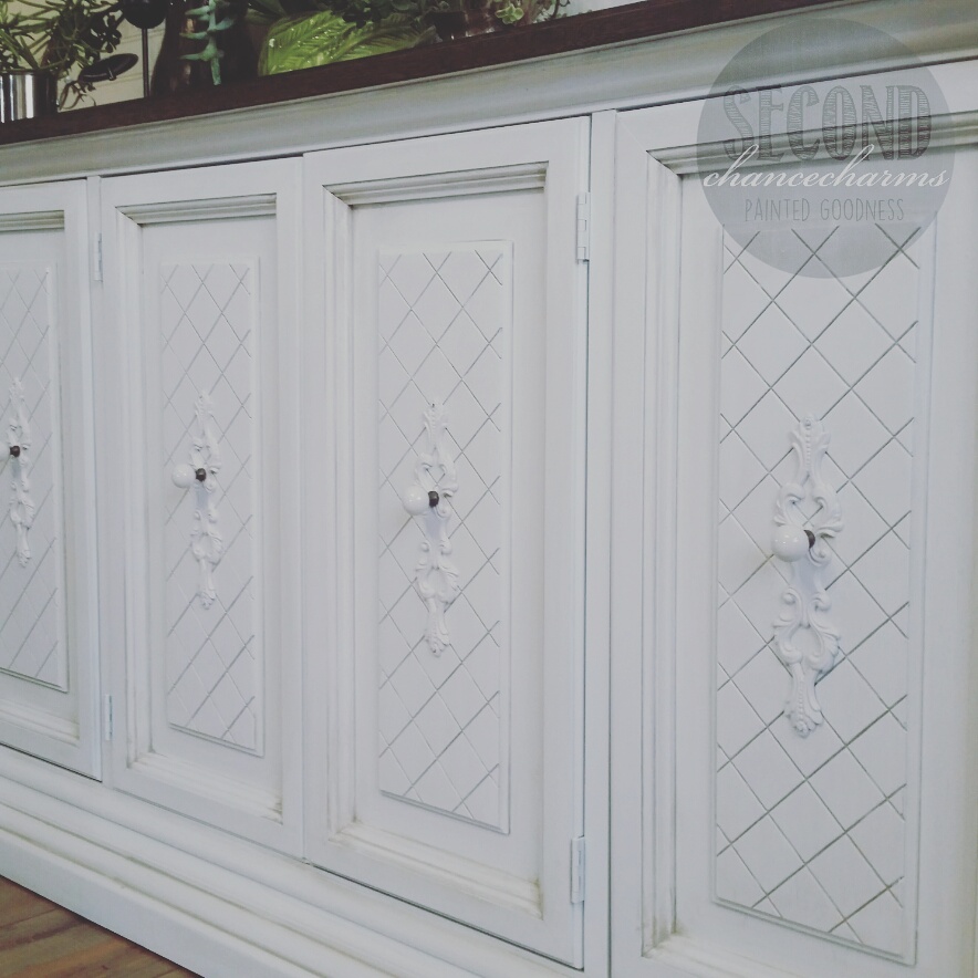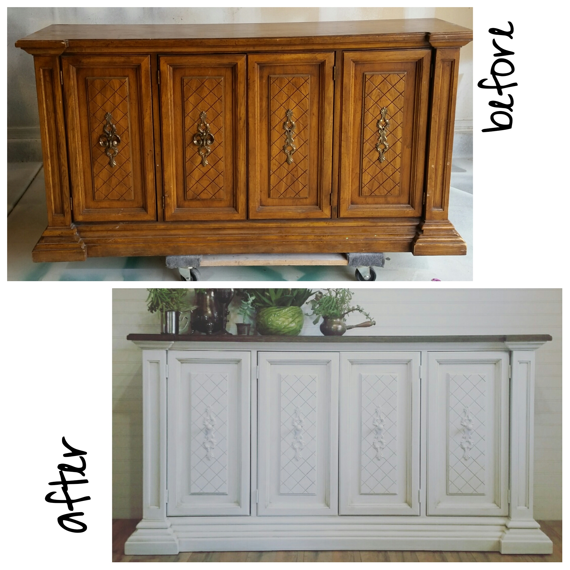 This gorgeous buffet was up to be customized and didn’t sit long; a client contacted me and wanted to use it for her TV console. After our color consultation, she chose for her piece to be refinished in Sherwin-Williams Pure White and glazed in grey. We kept the detailed original plates but updated them in white as well as added knobs my client found from Hobby Lobby. I stained the top in Dark Oak. For this piece to work the way my client had envisioned, I removed the one drawer that was located in the middle of the two opening doors. Replaced the drawer with a shelf and cut a hole in the back for a DVR cord. A perfect bright happy piece!