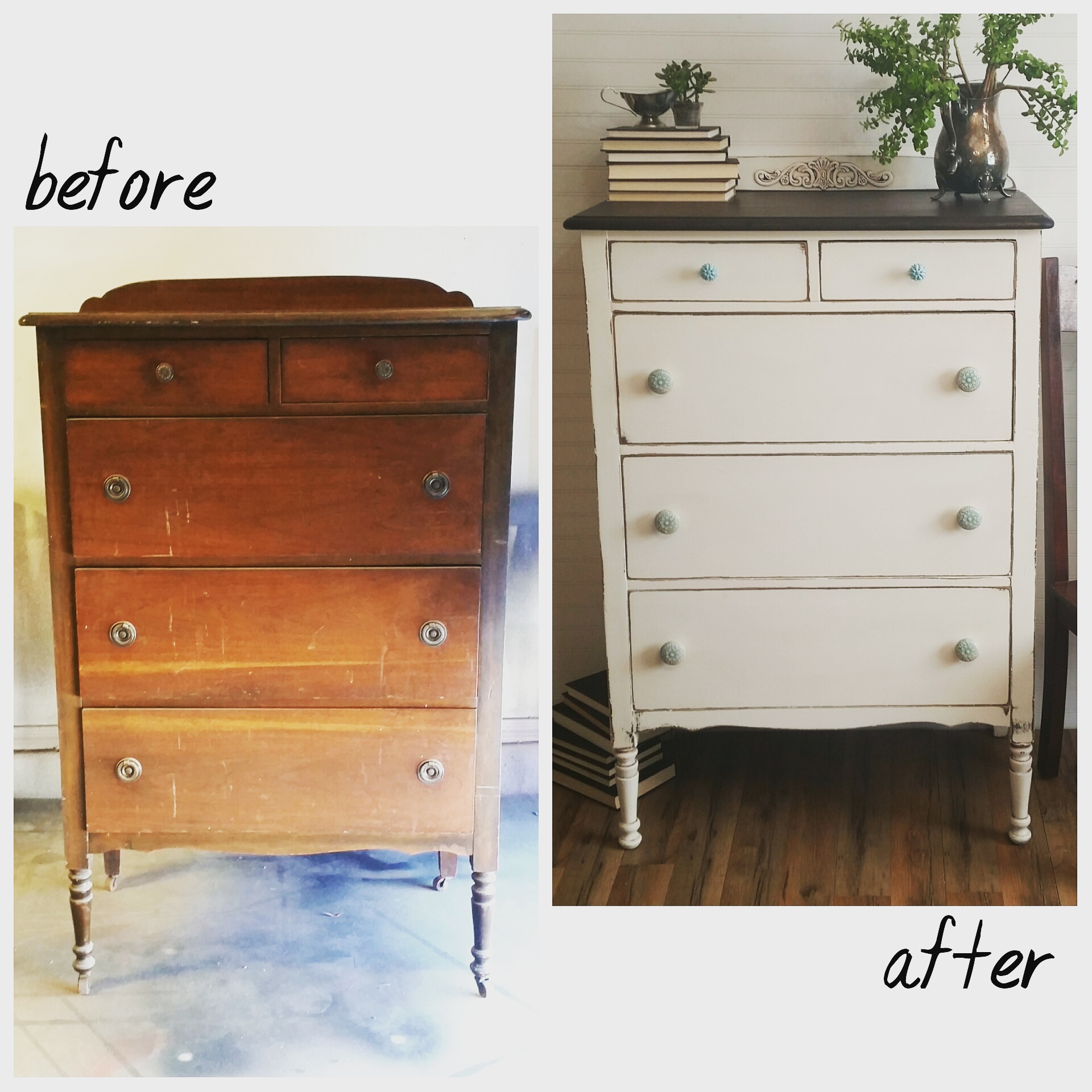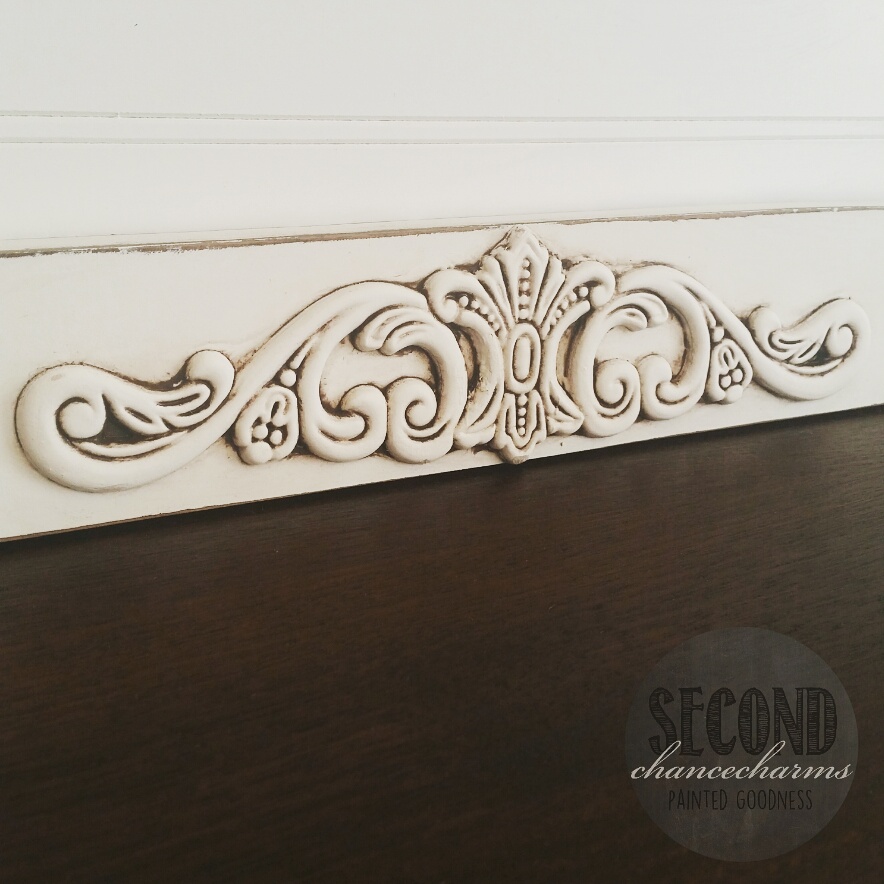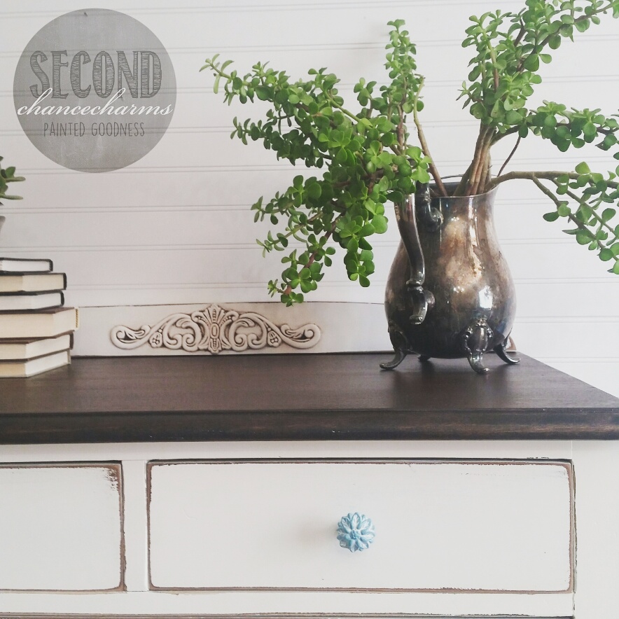 Another antique chest being past down the generations. This lovely gal gets to go live in Texas! My client chose Dover White, distressed. I added a detailed design on the top molding. Glazed the design and legs in a brown to highlight their curves. Stained the top in Dark Oak. Removed the casters; my client thought this was best since its going in her young daughters room, safety first! We added these knobs from Hobby Lobby, however the two top ones, were originally silver. I color matched the others that my client had picked out, the blue color, and updated them with white glaze to match. What a beautiful piece!