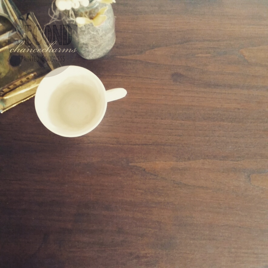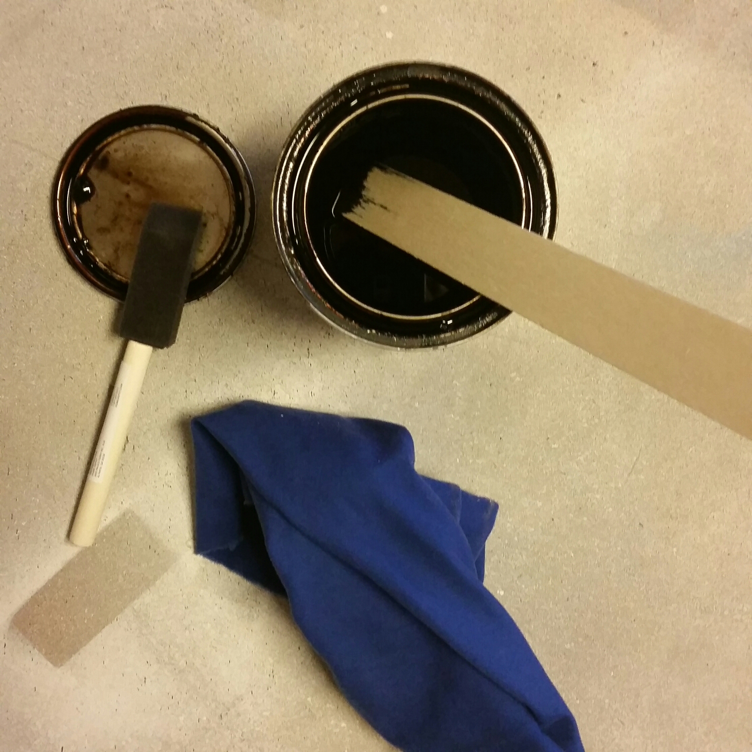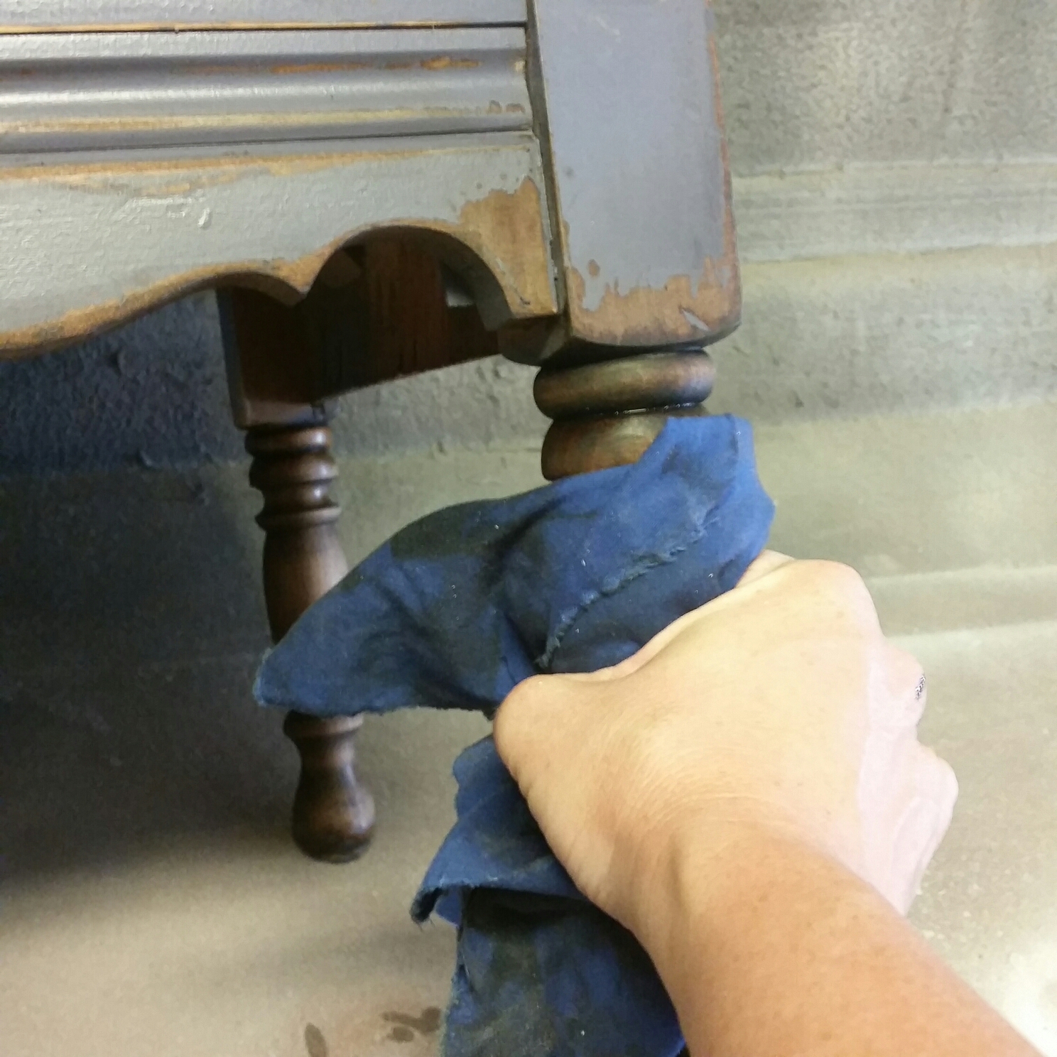 imageOnce all my legs were stained I moved to the top of the piece. Using the same technique; a wipe down using a clean rag, stained using a foam brush, allowing time for soaking in and then using a clean rag to wipe off extra stain. (Note: its really important to keep stirring your stain can to keep from the color separating.)