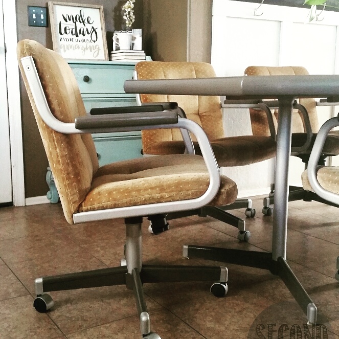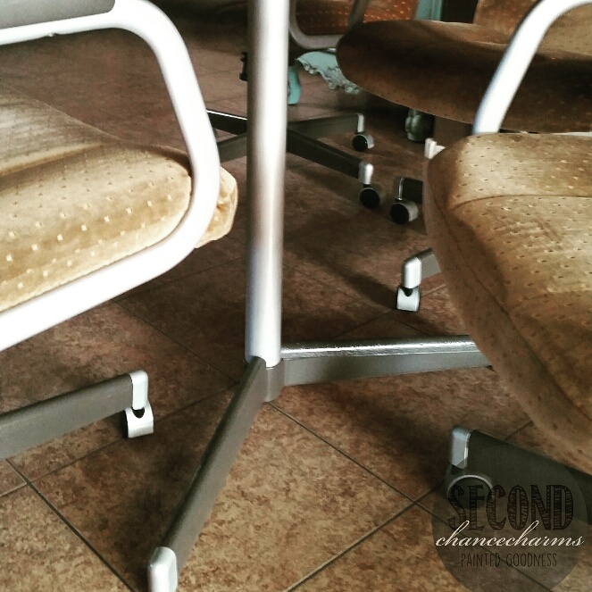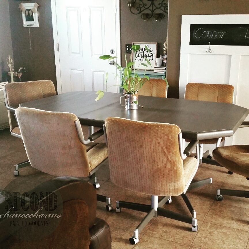Giving this dining set a Second Chance is a perfect touch for her space. All wood accents and table top were refinished in Sherwin-Williams Black Fox. All metal parts finished in nickel to coincide with her appliances and hardware in her kitchen.