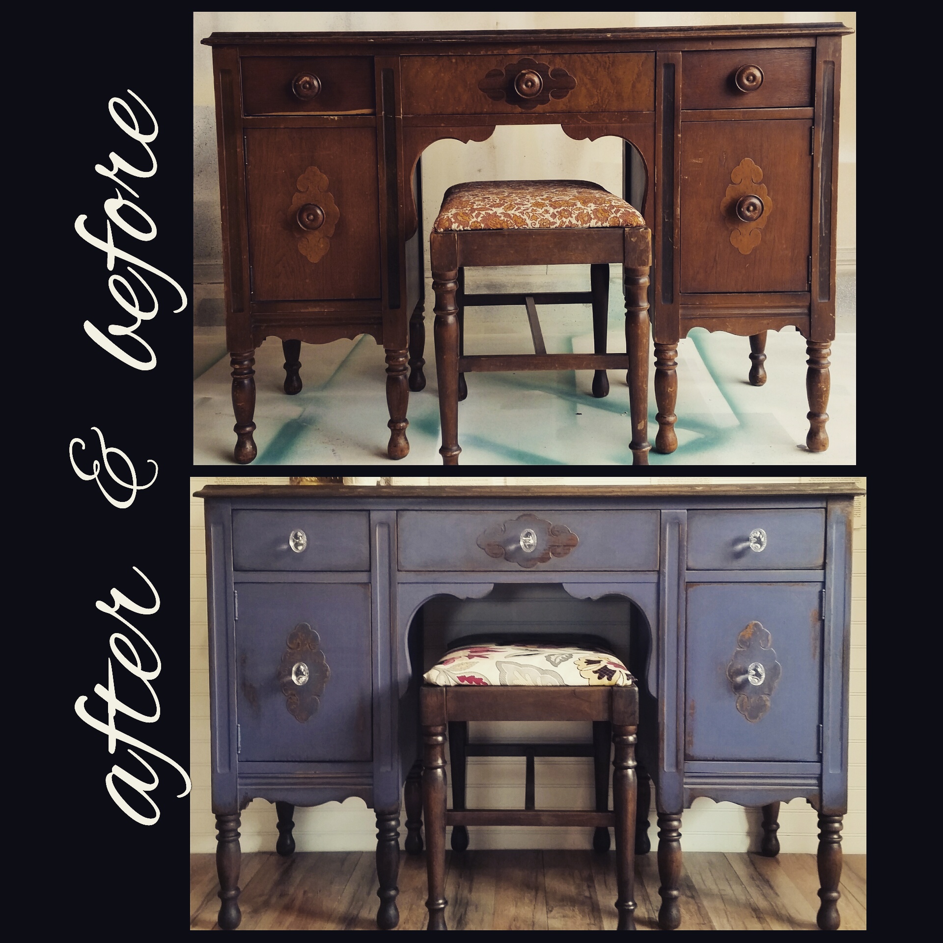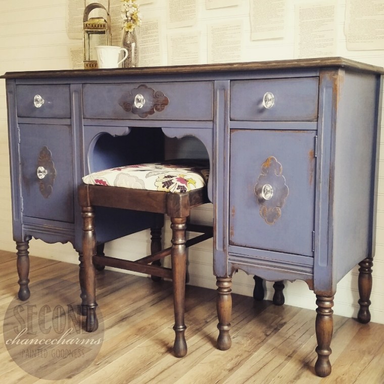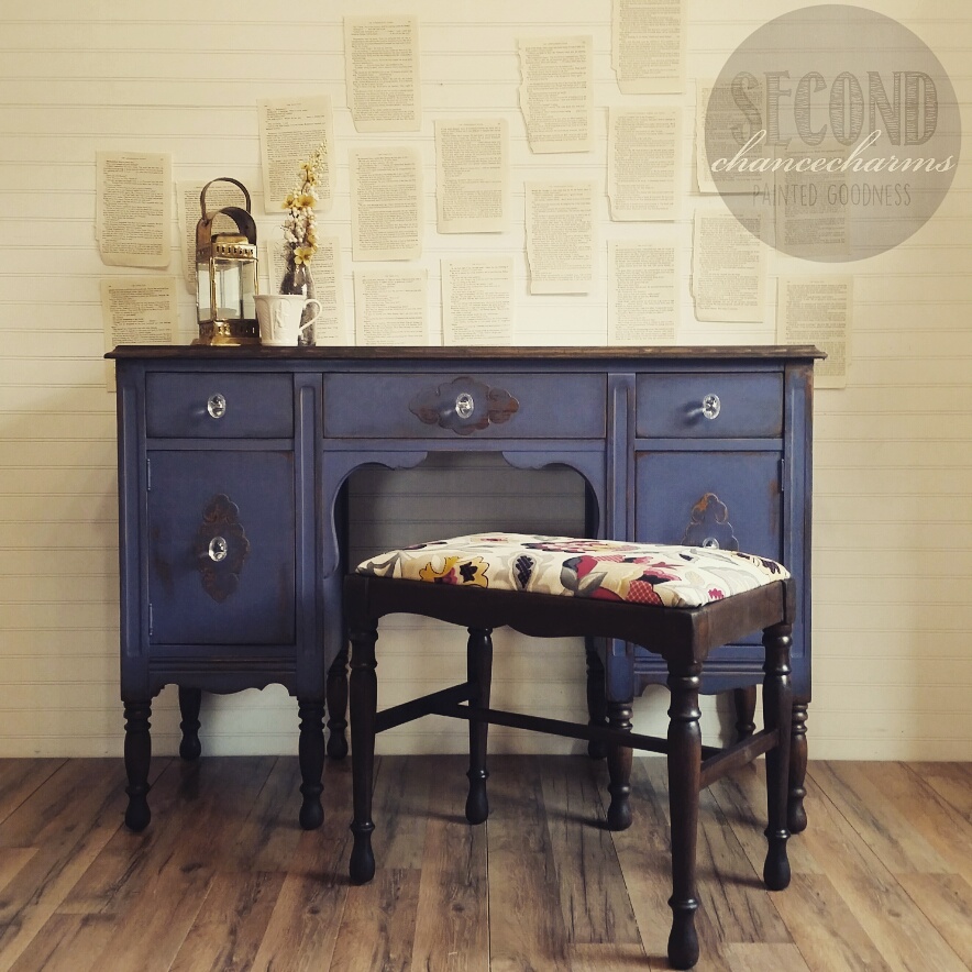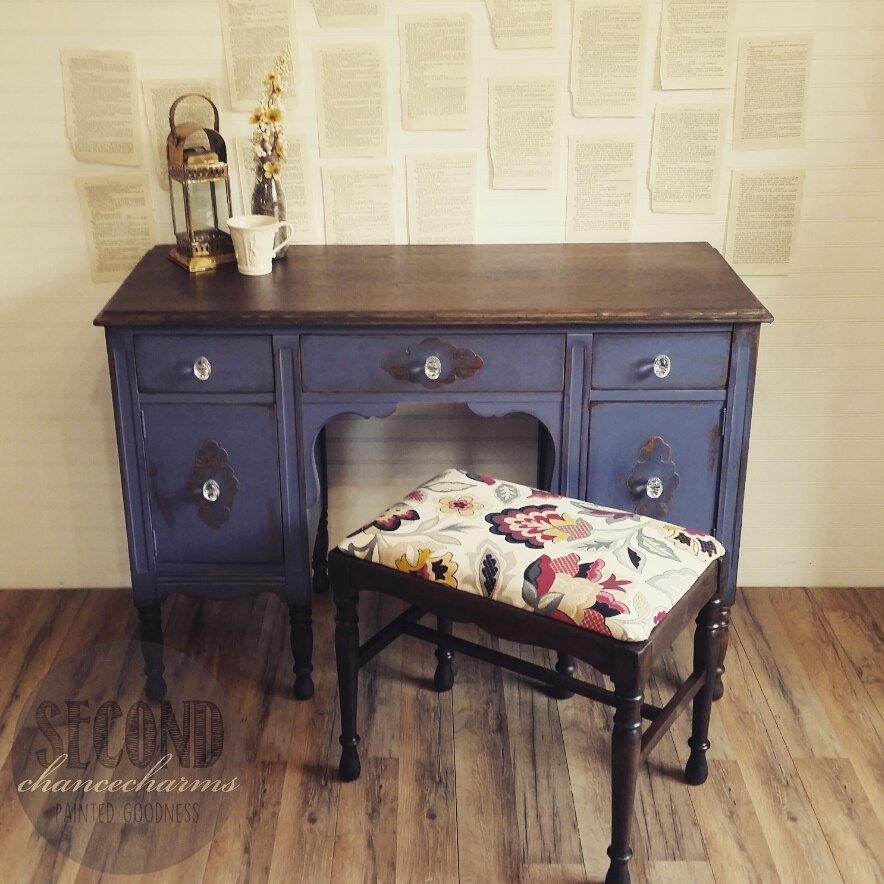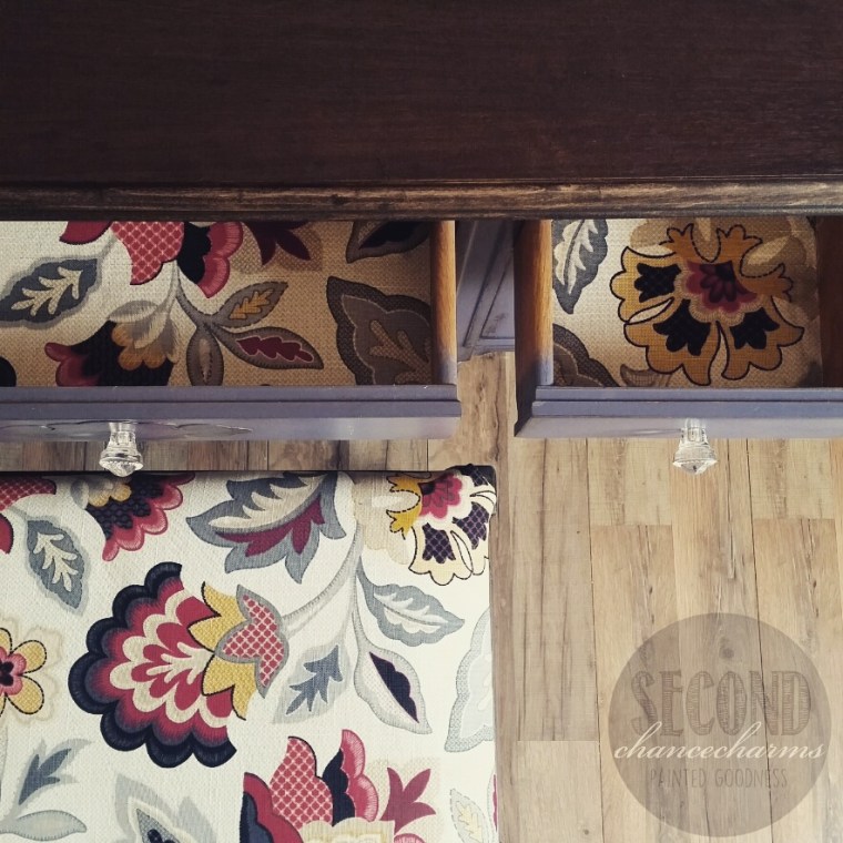 This antique vanity and stool is completely gorgeous! I found this piece during one of my runs on treasure hunting (it was a good day! I had found many pieces!! The treasure Hunting High is the best ever!!) She even came with her original mirror! I posted her In the Studio and she didn’t sit very long. My client chose to have her refinished in Sherwin- Williams Mineral Gray and distressed. The legs and top along with stool to be stained in Dark Oak. Of course the original fabric had to go. My client found a pattern she loved at Jo-Ann Fabric and Craft Store. She also chose glass Crystal knobs she found at Hobby Lobby.
