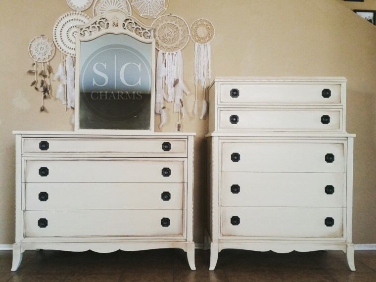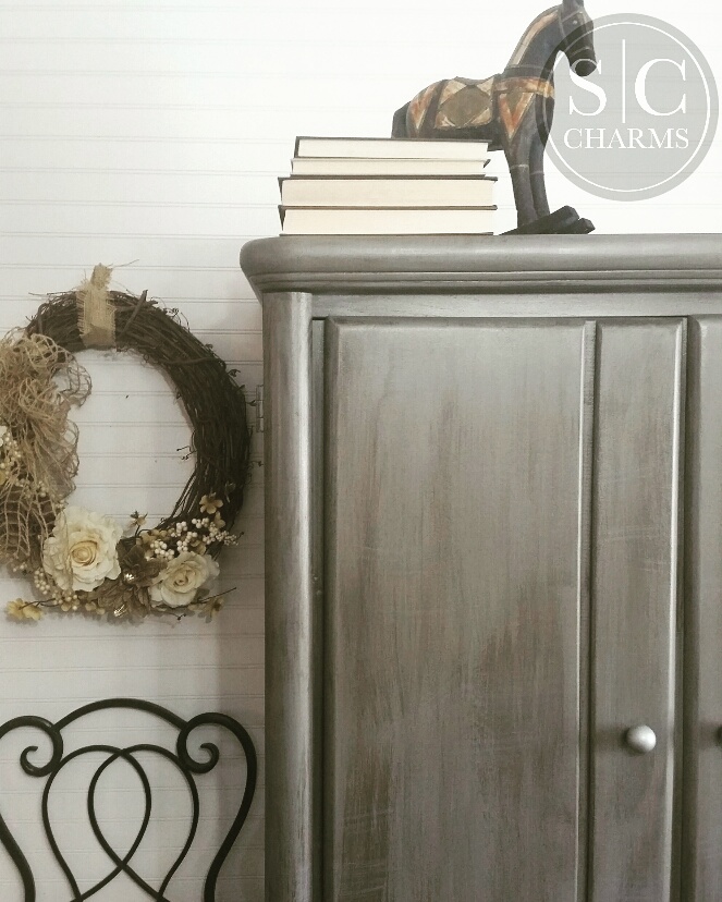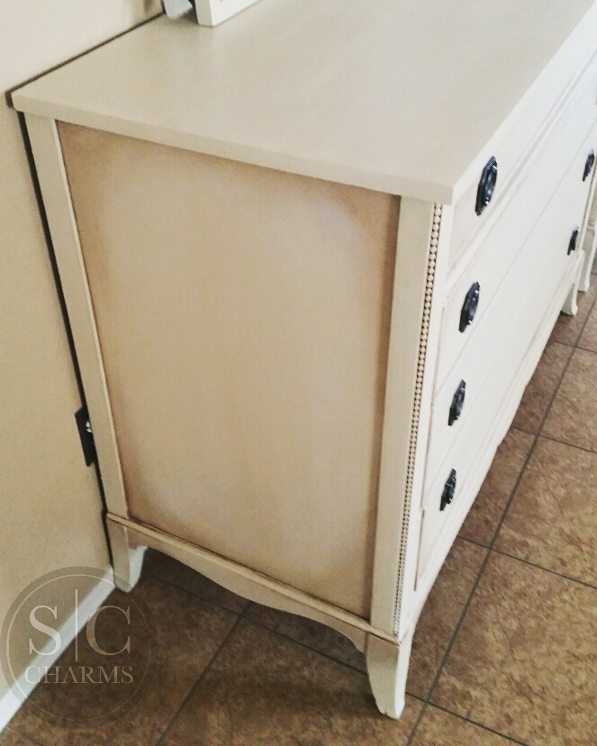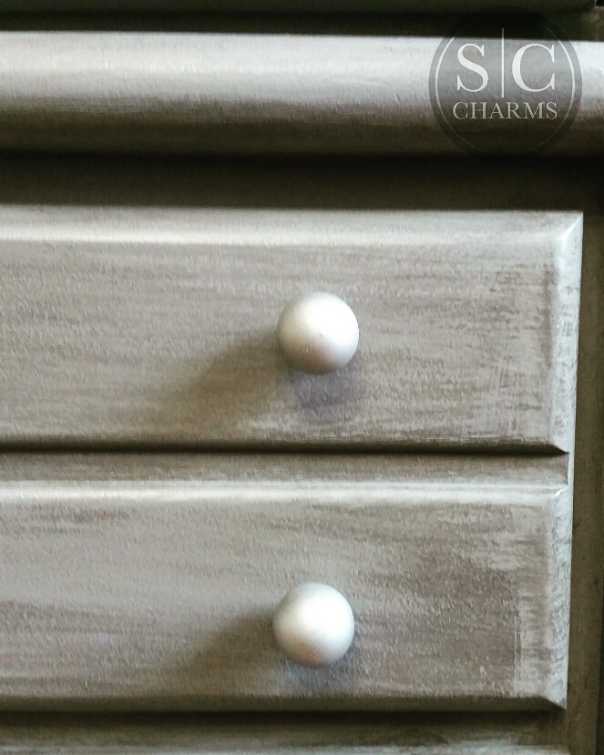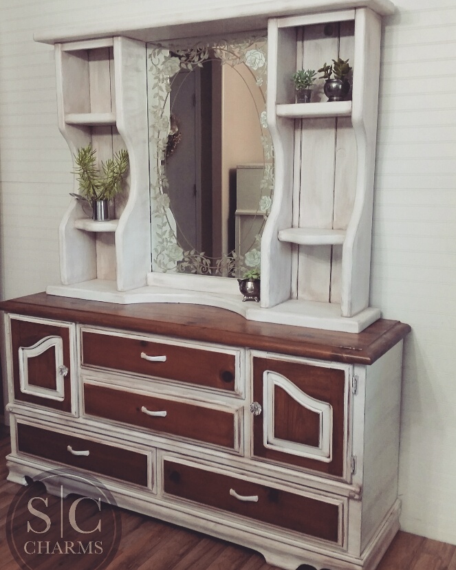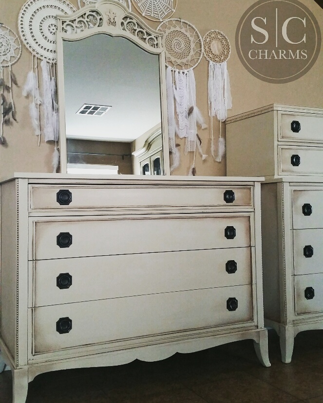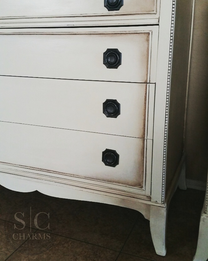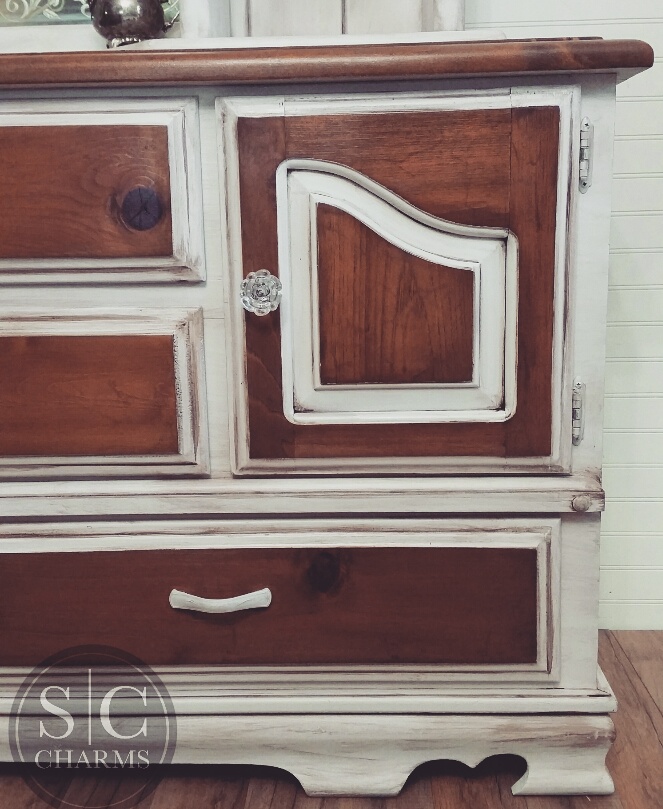 Refinished in Sherwin-Williams Snowbound and heavily glazed in brown. All stained areas are a custom stain that I created for my client. He brought a veneer sample to be matched with his pine pieces. Added new hardware, Crystal Flower knobs and pulls that I revamped in White and Brown Glaze. Matching nightstand and bed frame to follow.