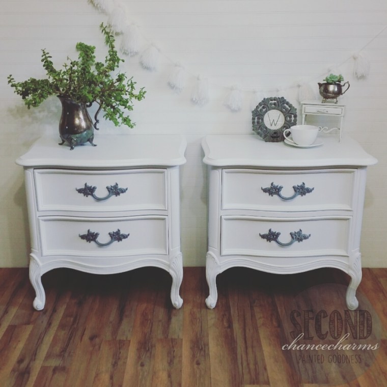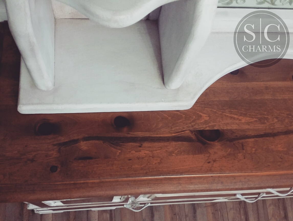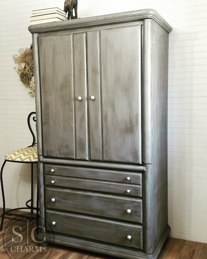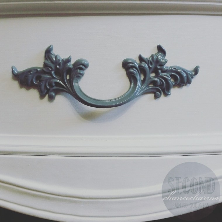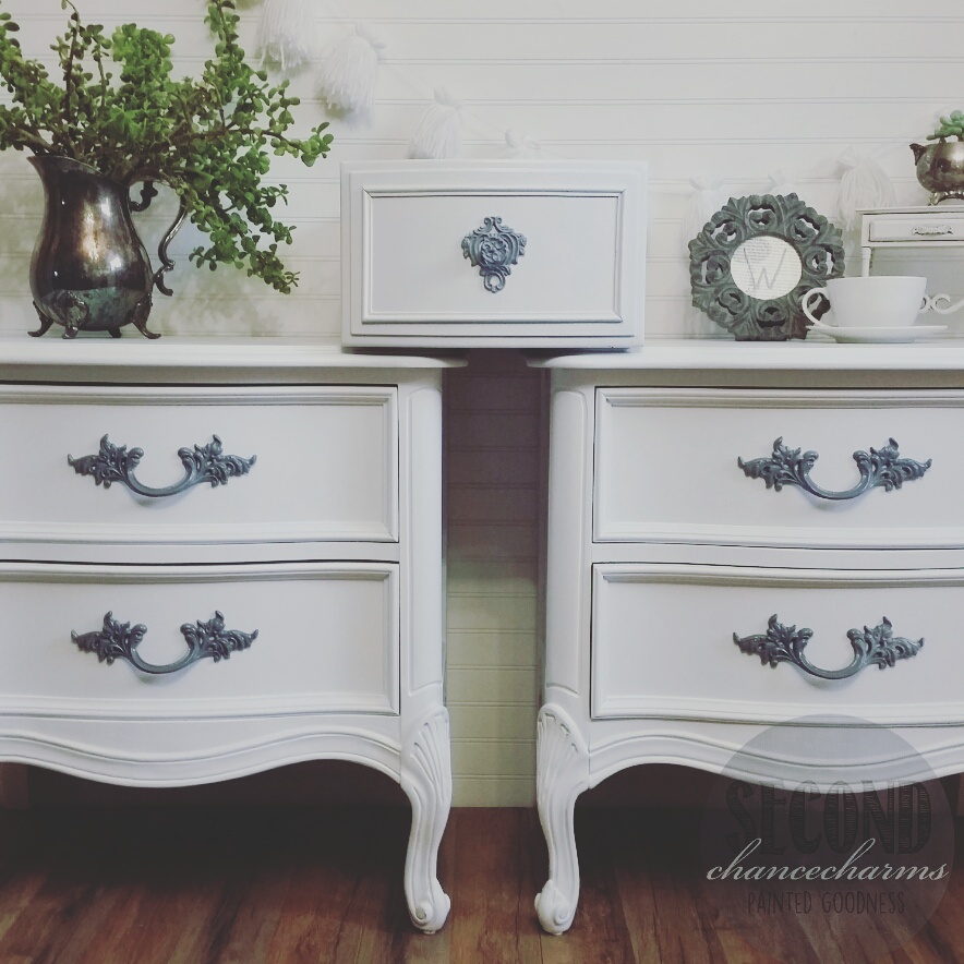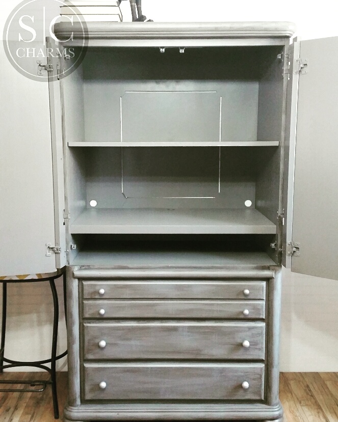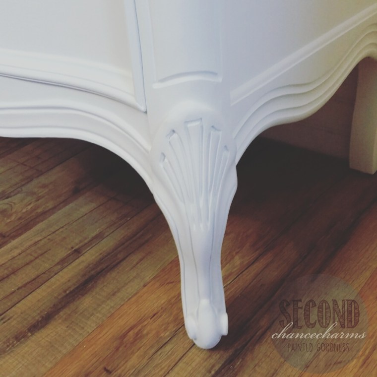 Refinished in Sherwin-Williams Snowbound and heavily glazed in brown. All stained areas are a custom stain that I created for my client. He brought a veneer sample to be matched with his pine pieces. Added new hardware, Crystal Flower knobs and pulls that I revamped in White and Brown Glaze. Matching nightstand and bed frame to follow.