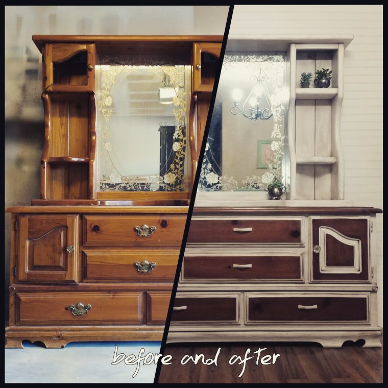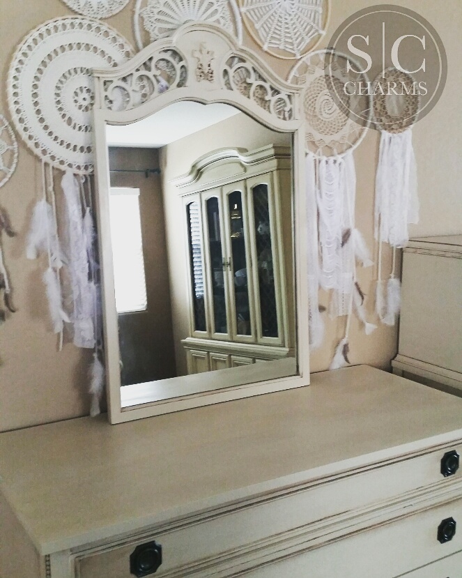 Gorgeous antique dresser and mirror refinished in Sherwin-Williams Sand Beach and glazed in brown. Original hardware updated in Bronze.