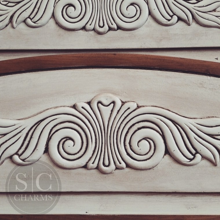 Refinished in Sherwin-Williams Snowbound and heavily glazed in brown. Custom stain created for my client. Love how the details pop out on this piece!