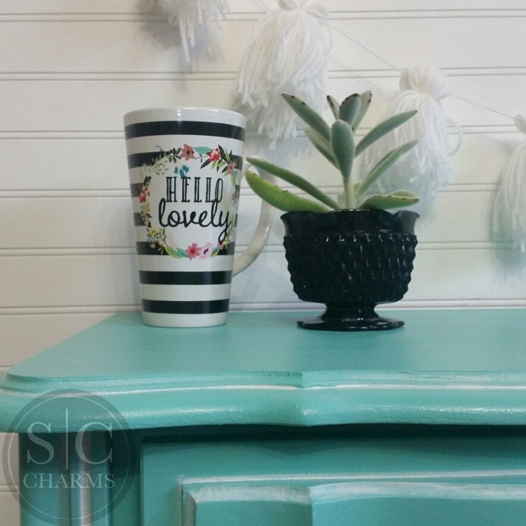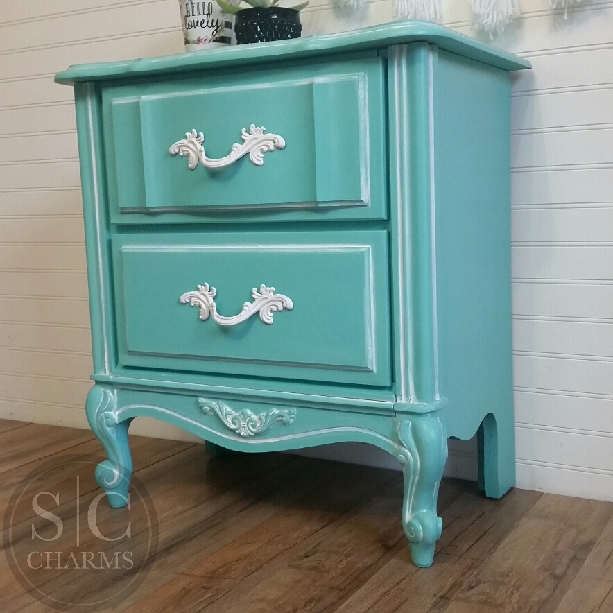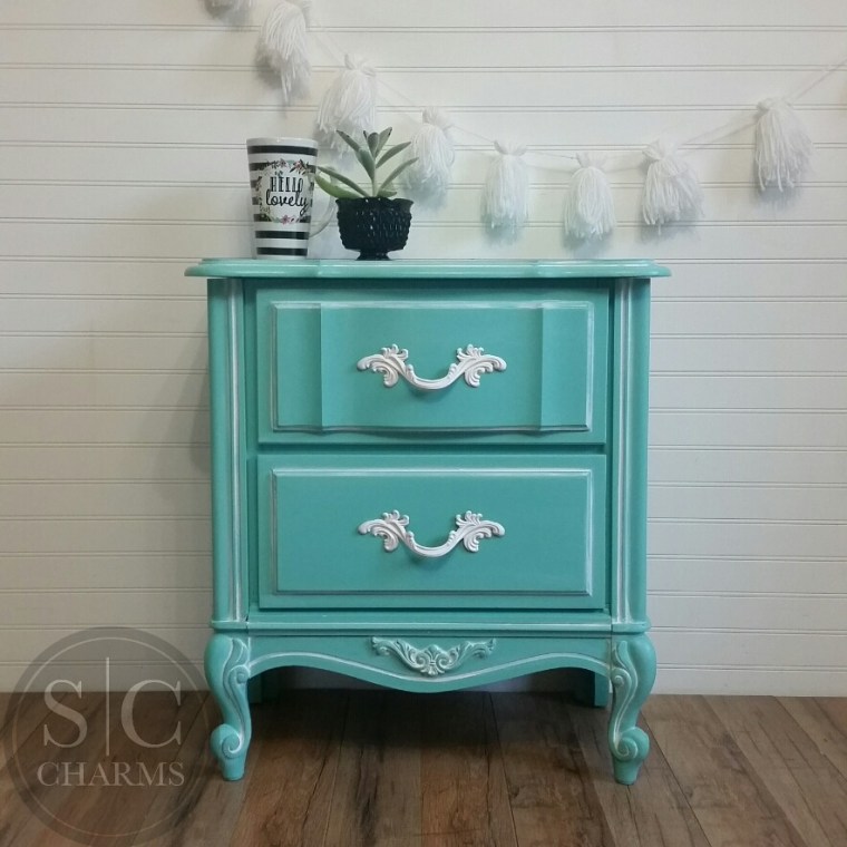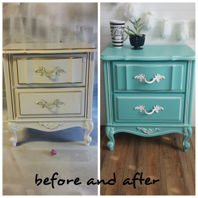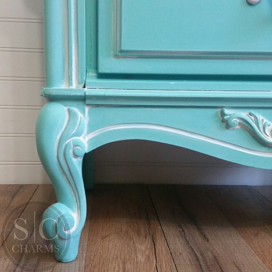 French provincial nightstand refinished in Sherwin-Williams Cooled Blue and glazed in White. Original pull handles revamped in White. Dresser and hutch coming up next.