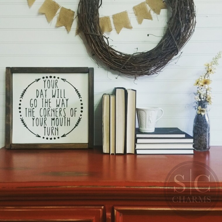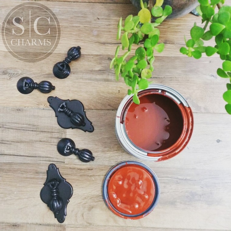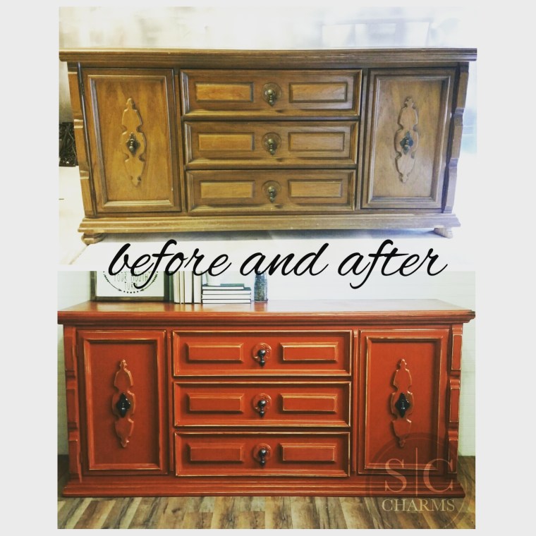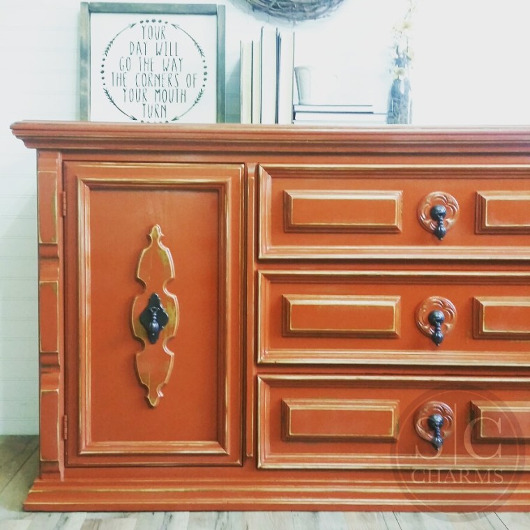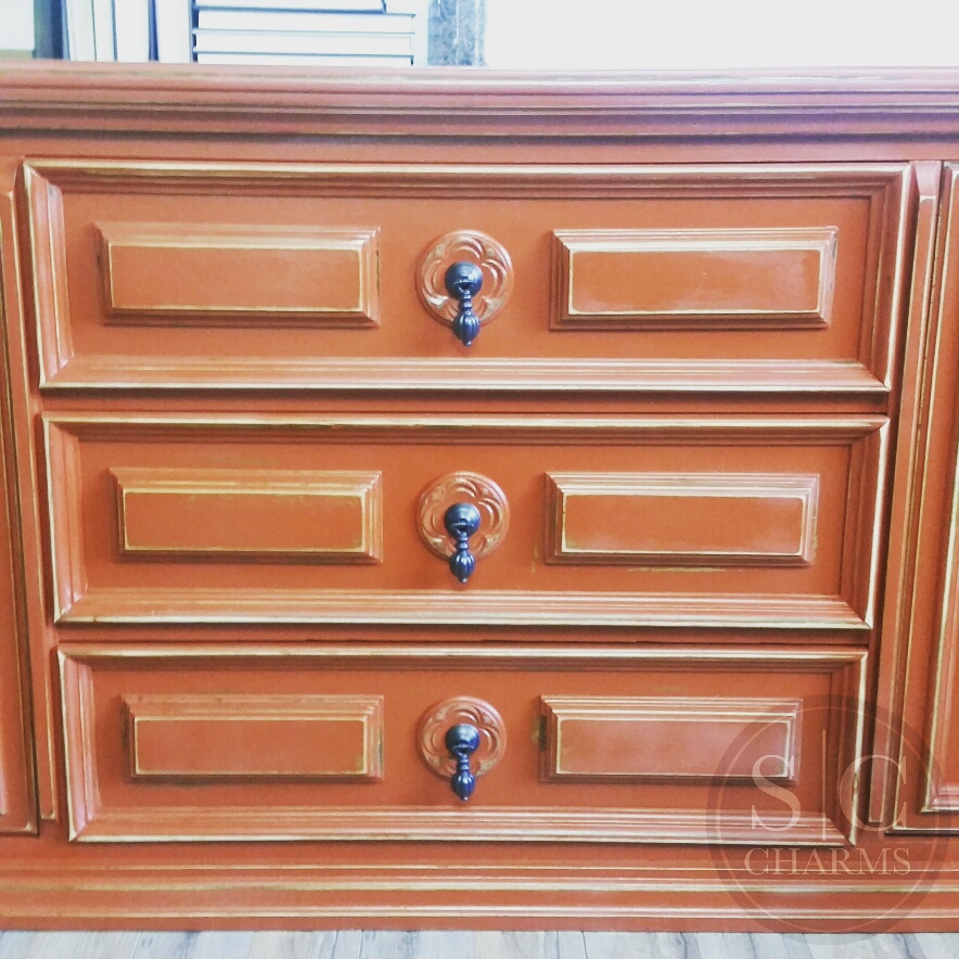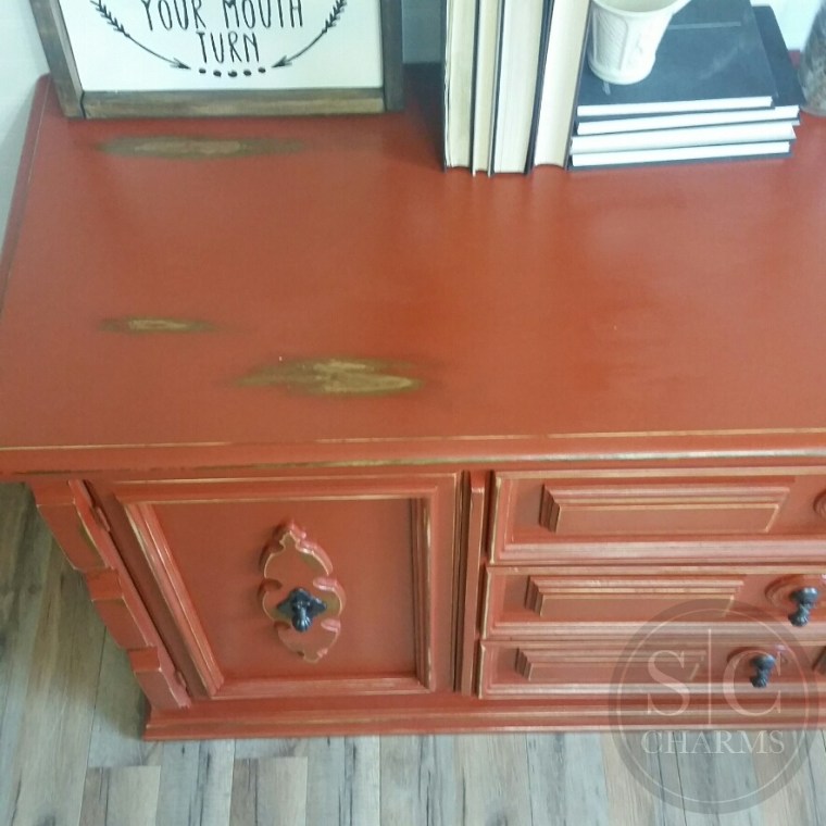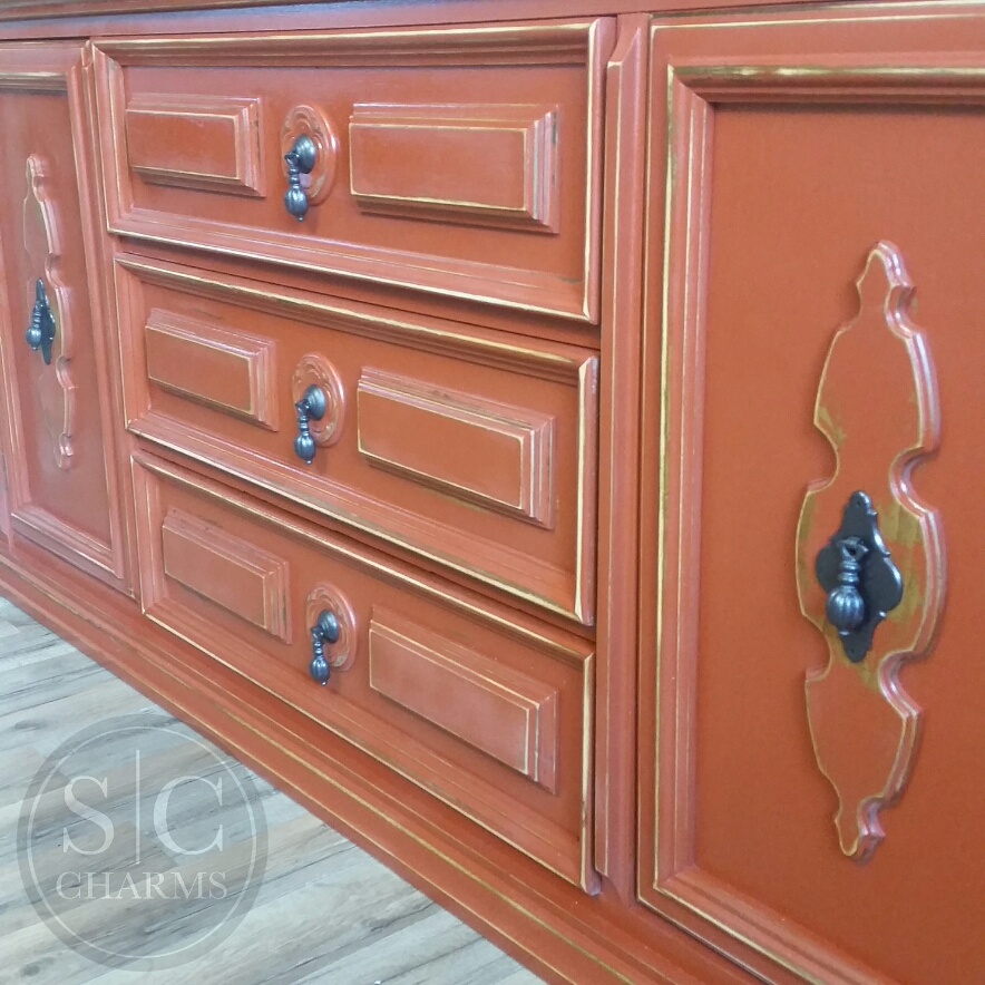 Refinished in Sherwin-Williams Fire Brick red. Distressed in the lines. Original hardware updated in Bronze. Removed the broken footers. Lovely sign created by Pearls and Power Tools.