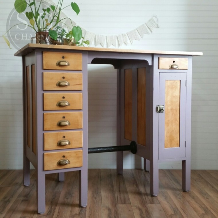 To add to her collection of Second Chance Charm furniture she found a desk at a yard sale and couldn’t pass her up. I agree, what an incredible find! Refinished in Sherwin-Williams Coquina. All panels, drawer faces and desk top have been sanded down and sealed for a natural look. Hardware kept as is. Love!