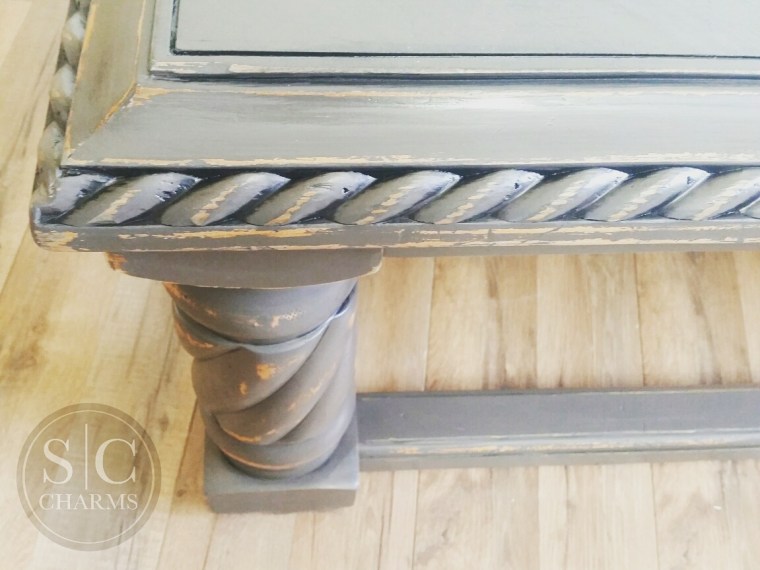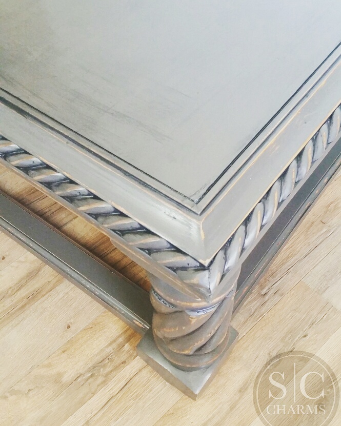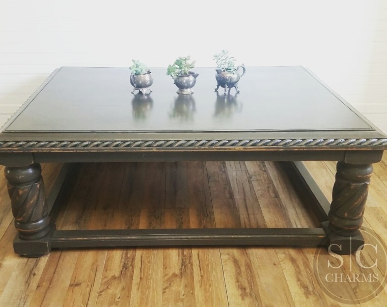 Coffee Table Published on December 10, 2016December 10, 2016 by Second Chance CharmsLeave a comment Custom coffee table refinished in Sherwin-Williams Black Fox. Lightly distressed to bring the natural wood through and glazed in Tricorn Black to enhance the details of this gorgeous piece.