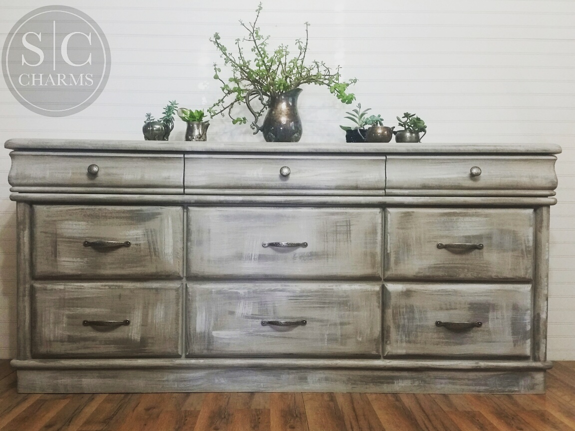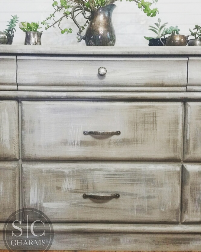 Refinished in Sherwin-Williams Dorian Gray for the base main color. I used a new technique for myself called dry brushing using Repose Gray and Gauntlet Gray in a crosshatch look. His matching Tall Chest of Drawers will follow shortly!