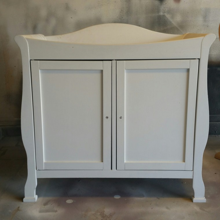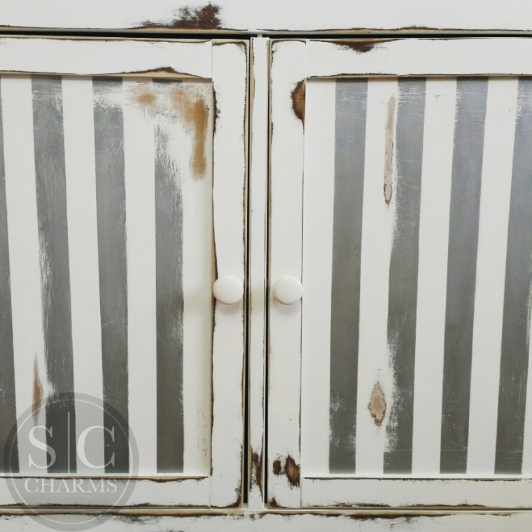 Baby Changer refinished in Sherwin-Williams Pure White and distressed. Hand painted silver stripes on both front door faces for something unique. I didn’t stop there, I also added a wooden embellishment glazed in silver and distressed. This gorgeous piece has 2 doors with one shelf on each side.