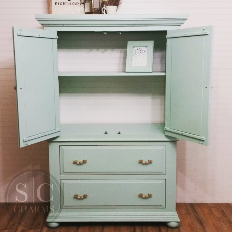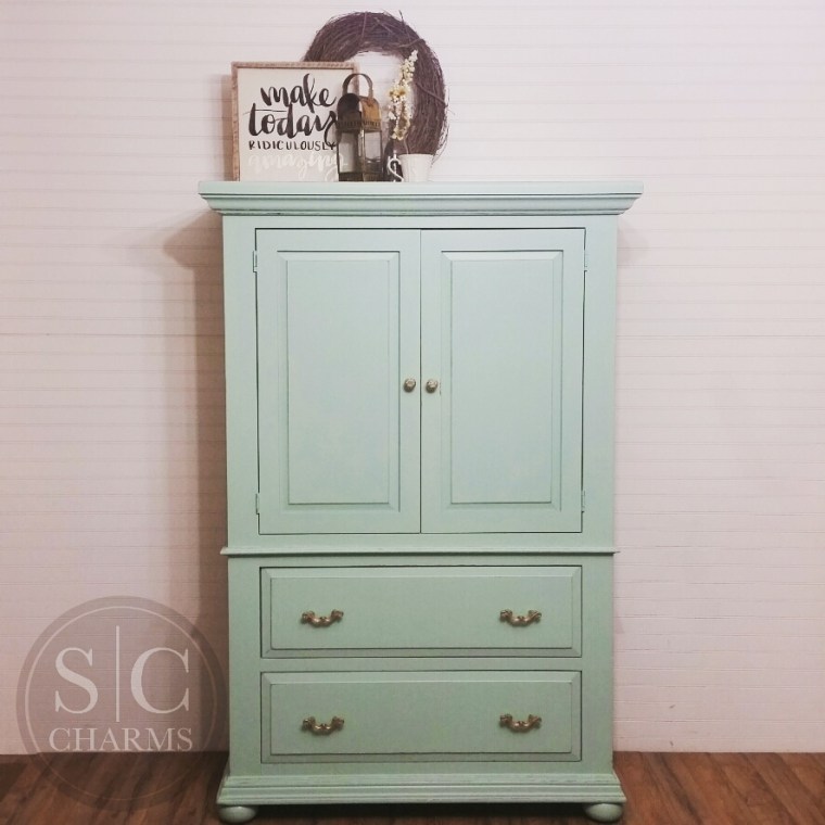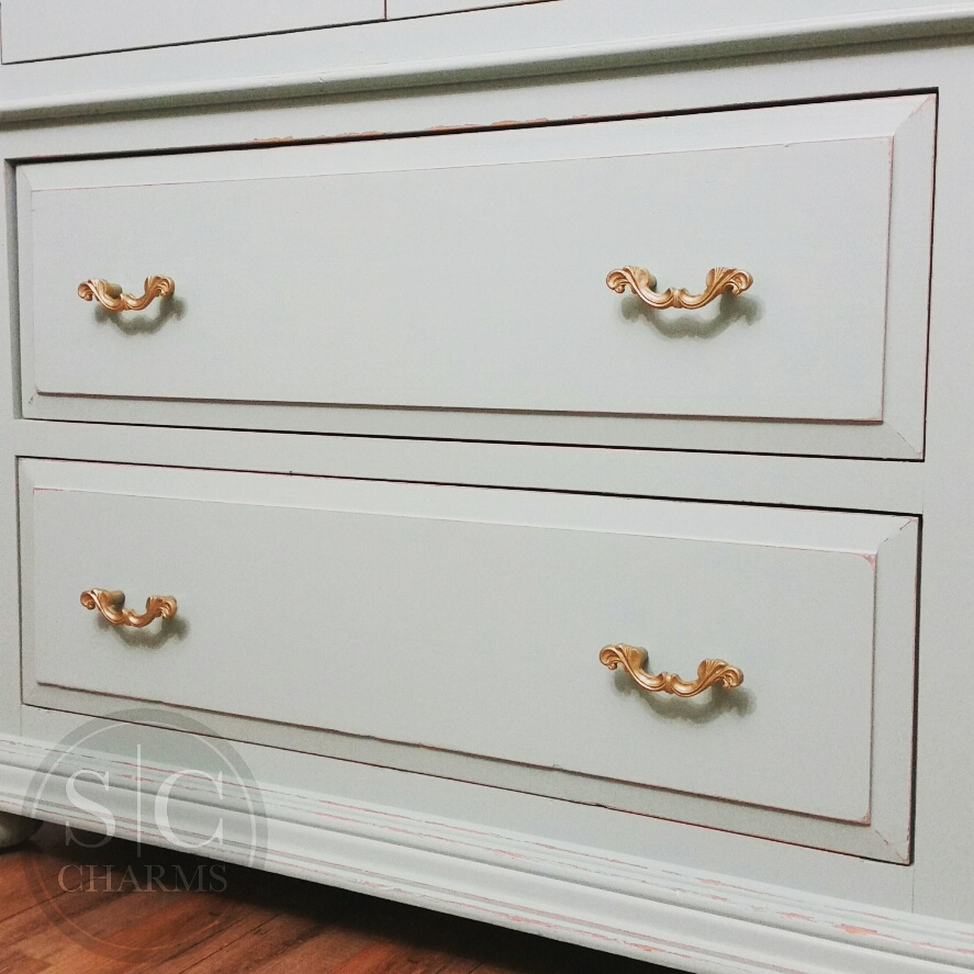 Nursery armoire refinished in Sherwin-Williams color Aloe matched up perfectly to my clients picture frame! The original hardware, plain knobs, had to go. I picked out pulls and knobs from Hobby Lobby and revamped them in Pure Gold. Distressed in the lines only.