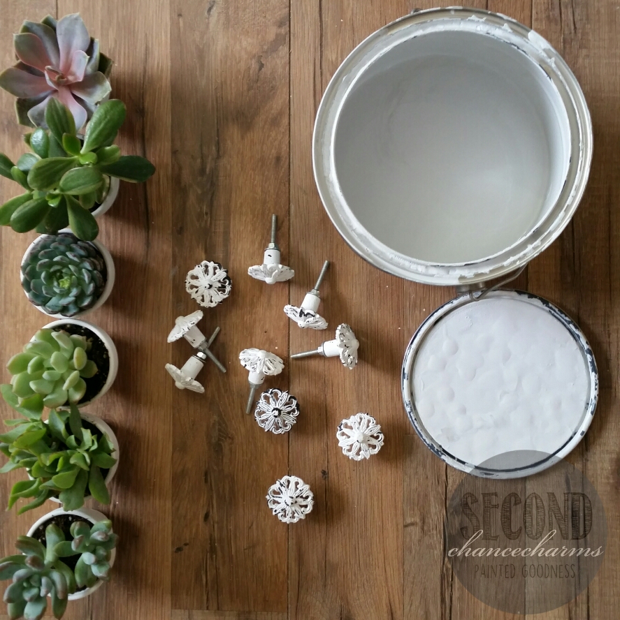 Refinished in Sherwin-Williams Reflection with a light distressed finish. Added new white chippy knobs from Hobby Lobby. These gals are officially farmhouse chic!