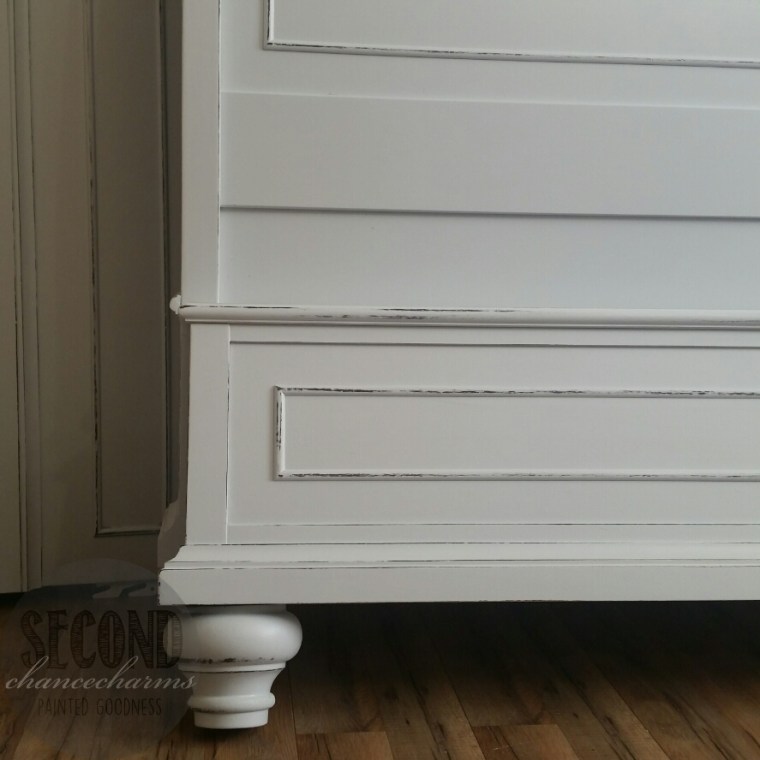Refinished in Sherwin Williams Reflection and lightly distressed. Replaced knobs with some very adorable white distressed knobs and pulls from Hobby Lobby that my clients picked out.