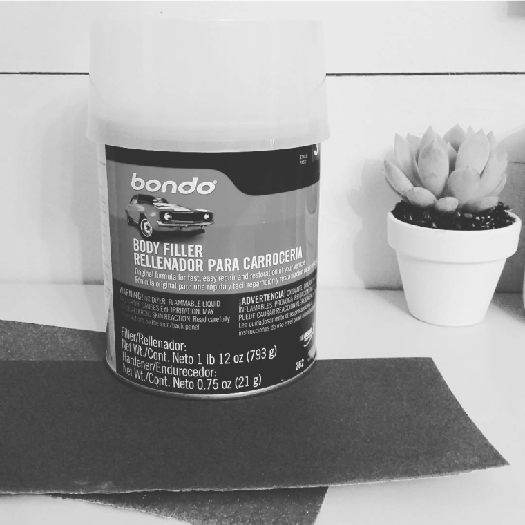 Believe it or not, I love using Body Filler for cars bondo. Crazy right!? This stuff sticks, drys fast and sands down great for a smooth even finish. Of course use a high grit sanding paper like 80 grit at first and work your way down for a soft finish using 150 grit. I continued the sanding on the entire piece to remove chips, gauges and scratches. A light sanding is perfect- you don’t need to get down to bare wood (unless you were staining.)