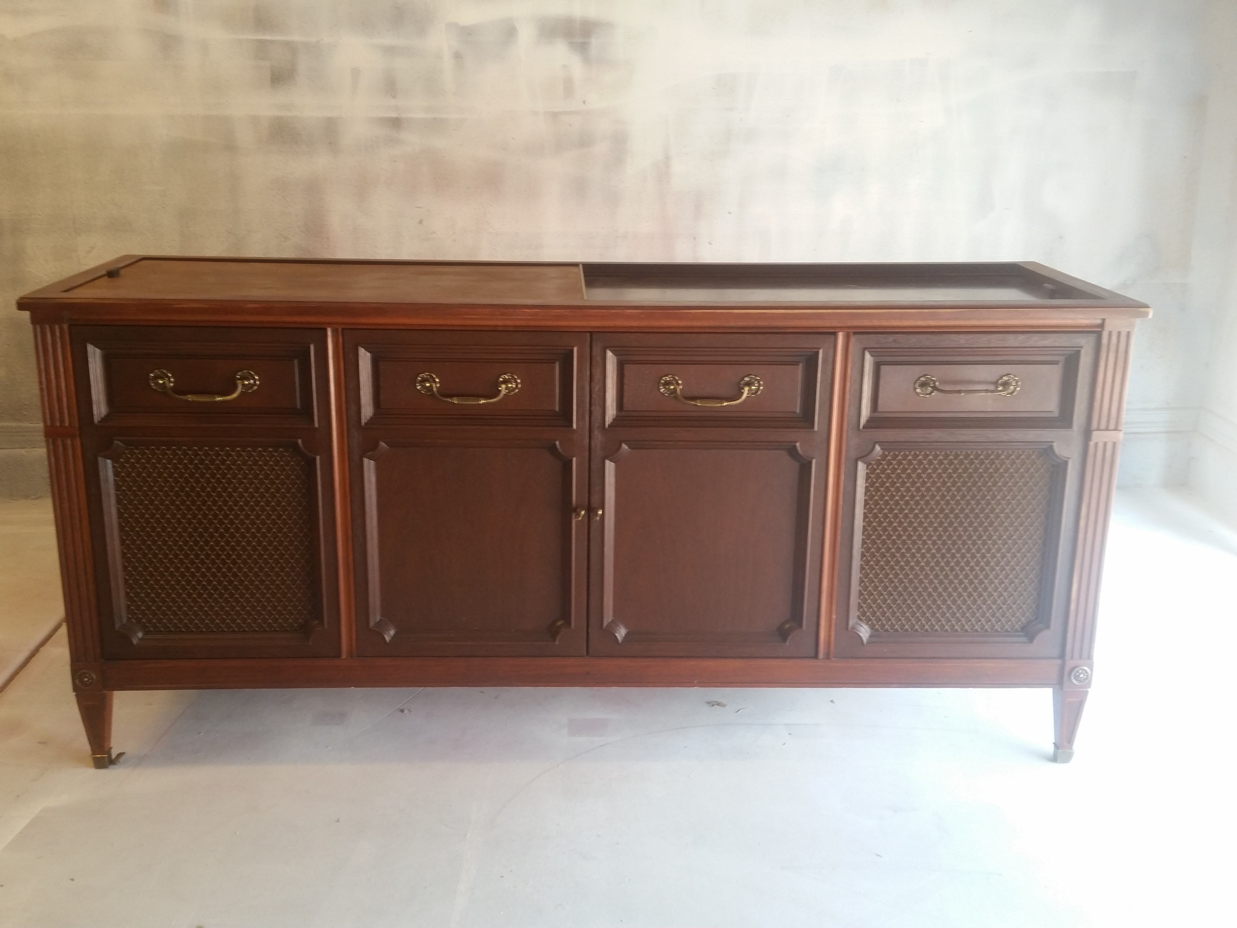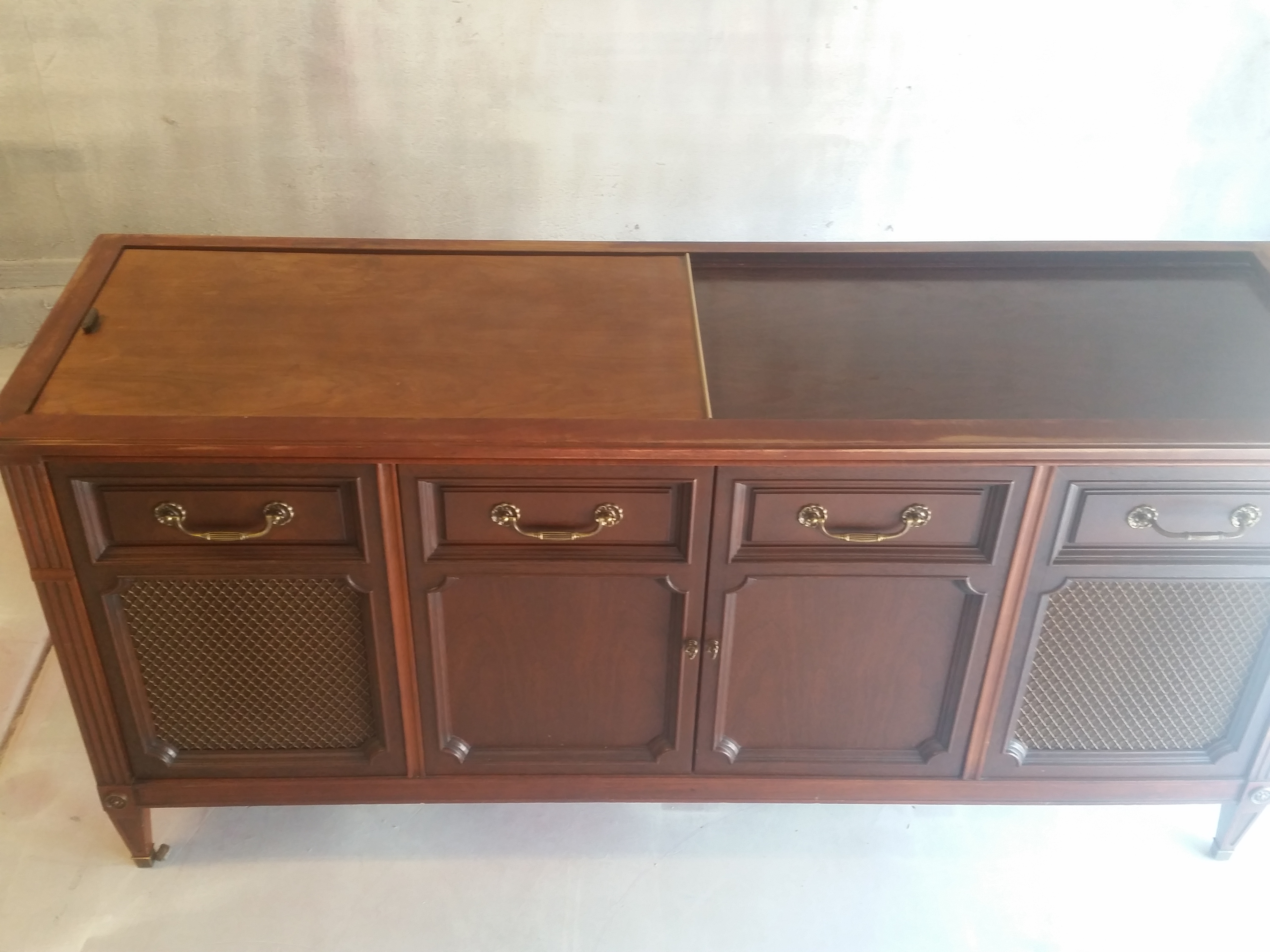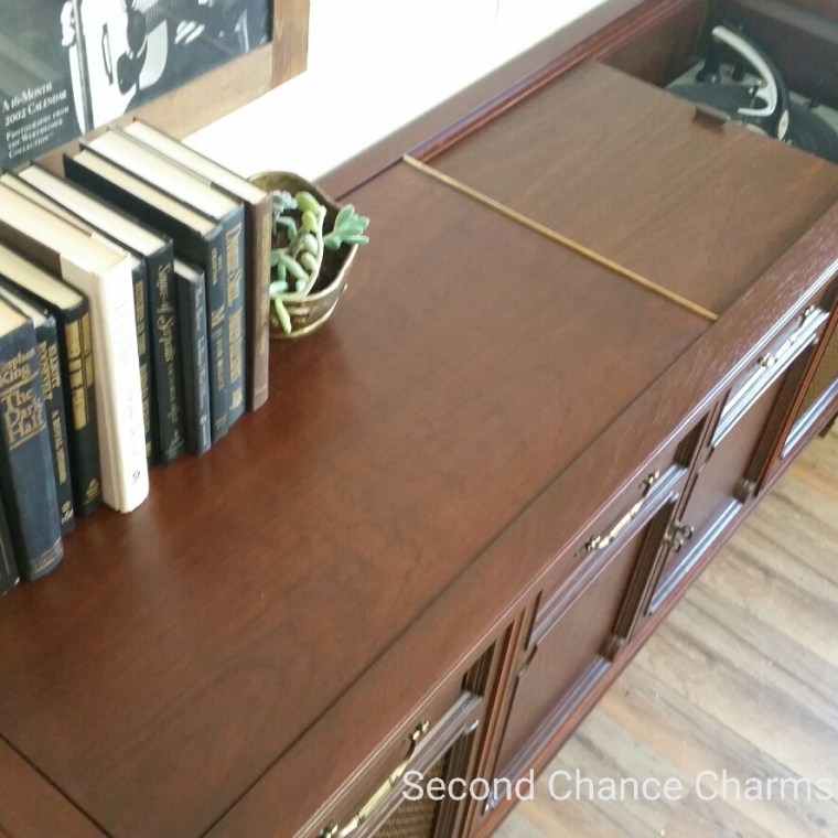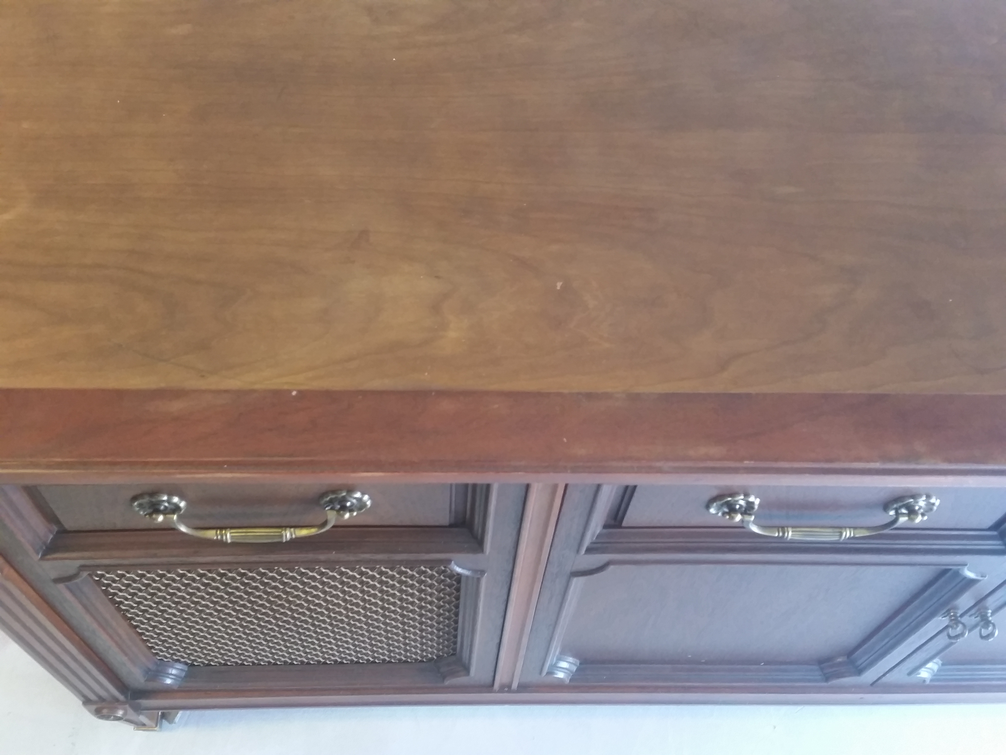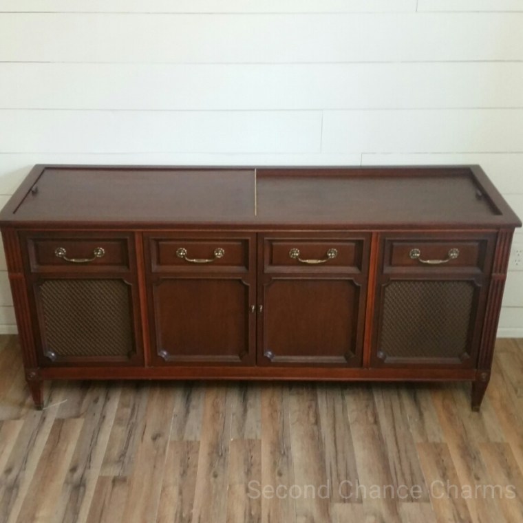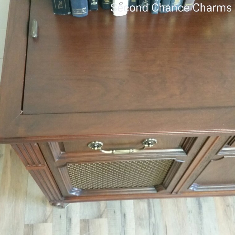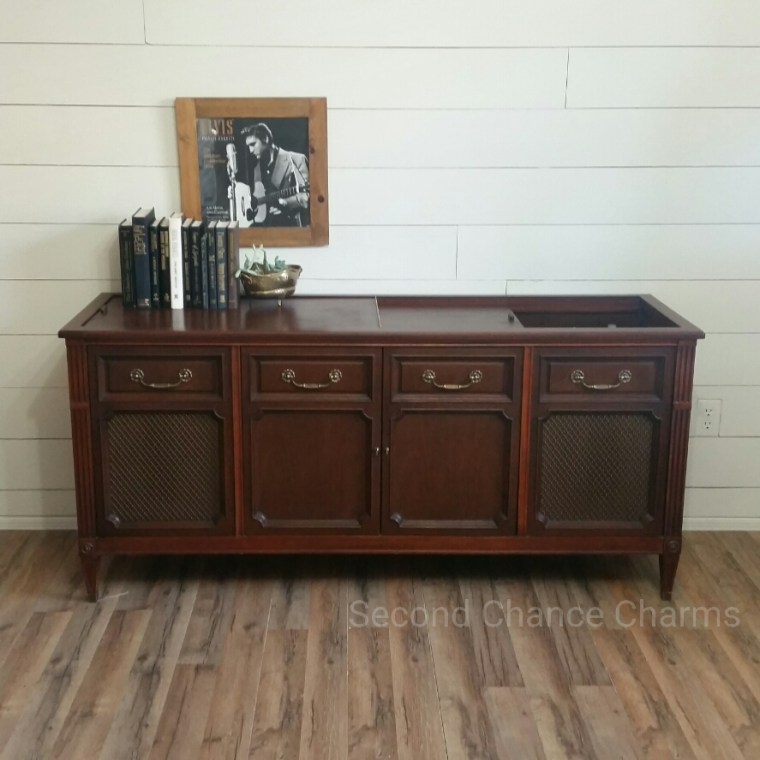 This was an exciting piece to be apart of, it didn’t involve refinishing but a nice restoration. My client bought this from her neighbor who bought it from a garage sale. Restoring this ol gal to her glory days involved sanding down the top and re-staining it in a custom Chestnut stain to match. The rest of this girl needed a nice deep clean to bring her back to life. I was told all her record parts work beautifully and now she too can sing a new tune with her Second Chance restoration!