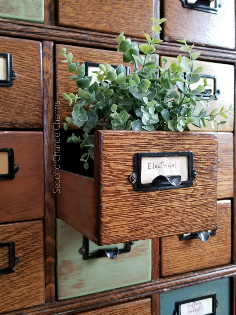 Worth the wait, wouldn’t you agree!? My first piece to the new year! Meeep!!! I want to start off by saying, I believe that every furniture refinisher out there wants to be able to say they refinished or restored an antique library card catalog storage cabinet, at least once. Secondly, I think it’s safe to assume that everybody wishes they owned one! I can check off one of those things! I completely swooned when I got my hands on this old fellow. He belonged to my great-grandfather and it was used to store his nick knacks and small tools in his garage. I am not sure how he encountered such a piece but let me just say- he used it for all its possibilities. After his passing in 2011 my mother held on to this lovely old gem, stored away in her garage, waiting for a Second Chance.