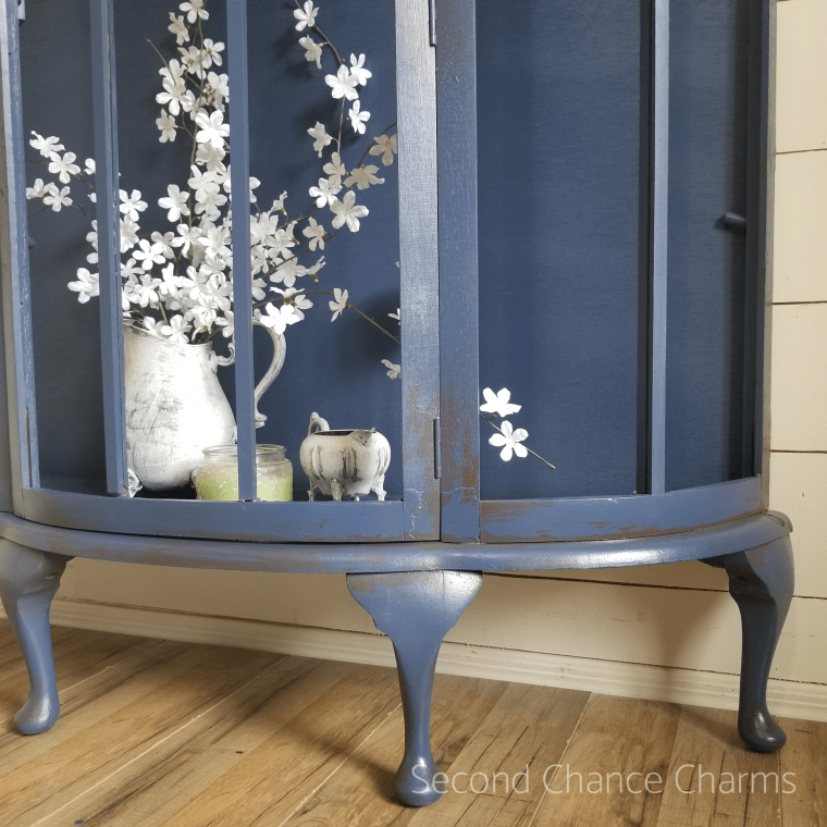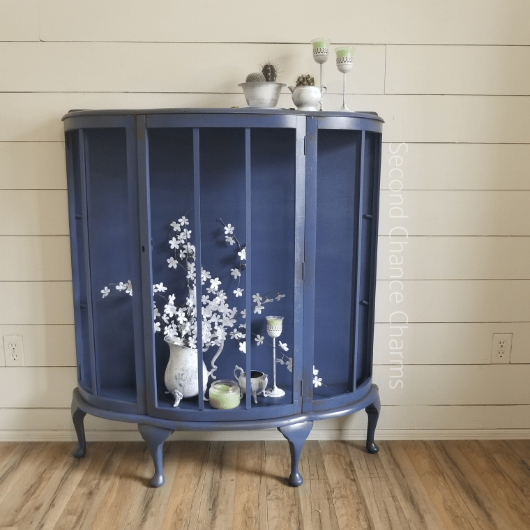 Taking off the fabric backdrop and old veneer was a start! Refinished in Sherwin-Williams Indigo Batik and glazed in brown. My client has the glass door fronts at home as well as the glass shelves. I can’t wait to see what it looks like in her space!