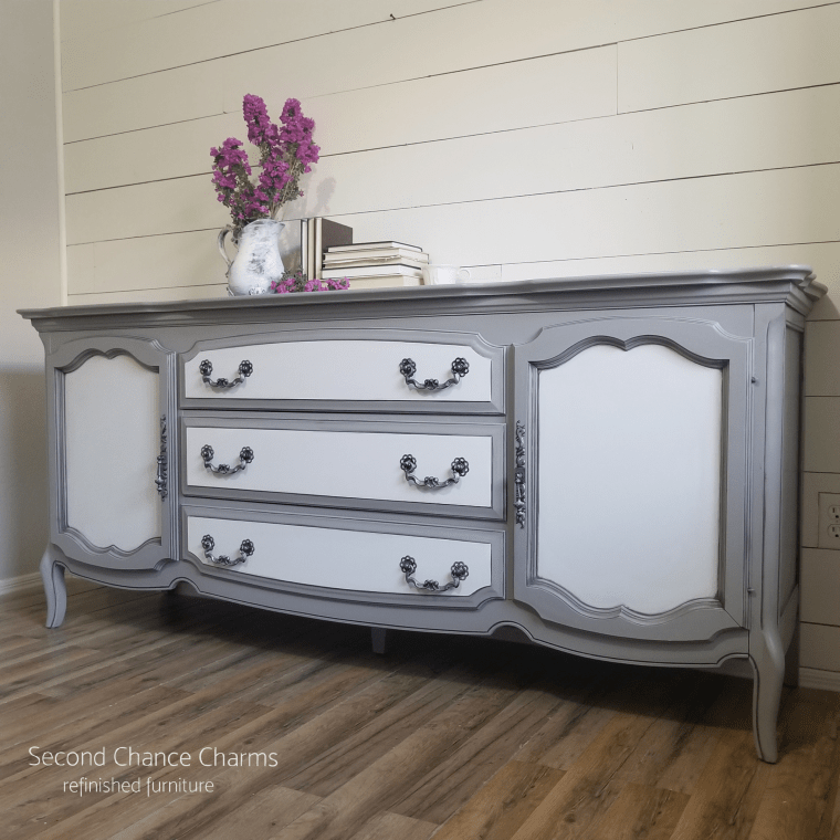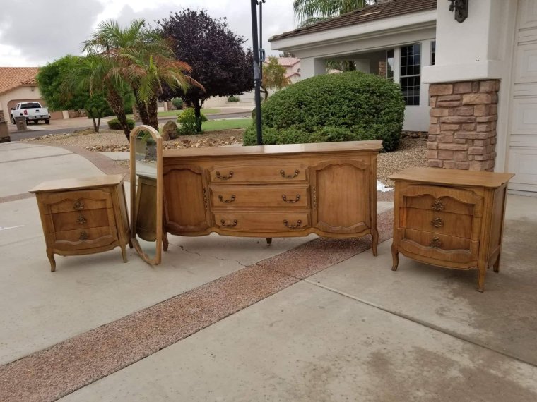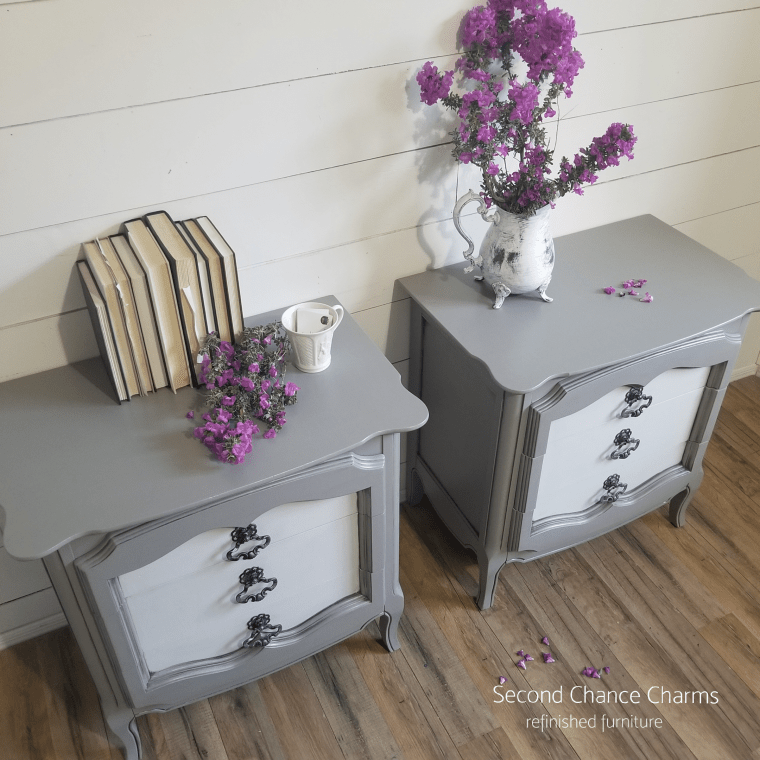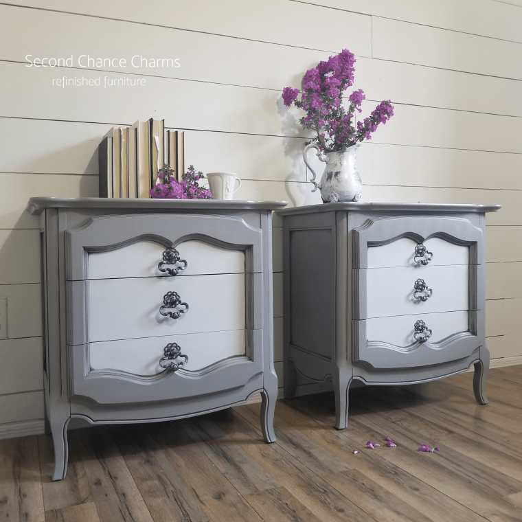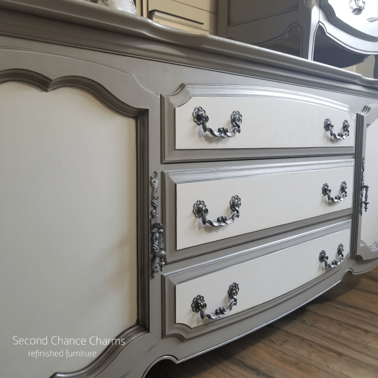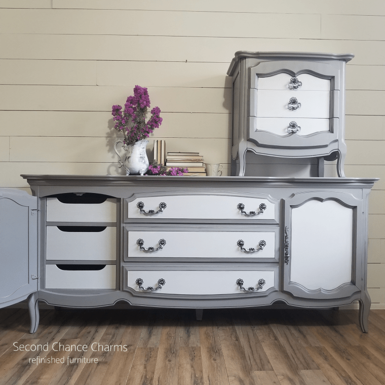 French provincial style bedroom set perfect for any room! This set includes a dresser, mirror and two nightstands. Refinished in a two tone look with glazed. The main base color is Sherwin-Williams Dovetail Gray and the lighter gray color is Reposed Gray. Glazed in Black Fox (which is a darker gray color). Original hardware revamped in Nickel and glazed in Black for an added POP of beauty!
