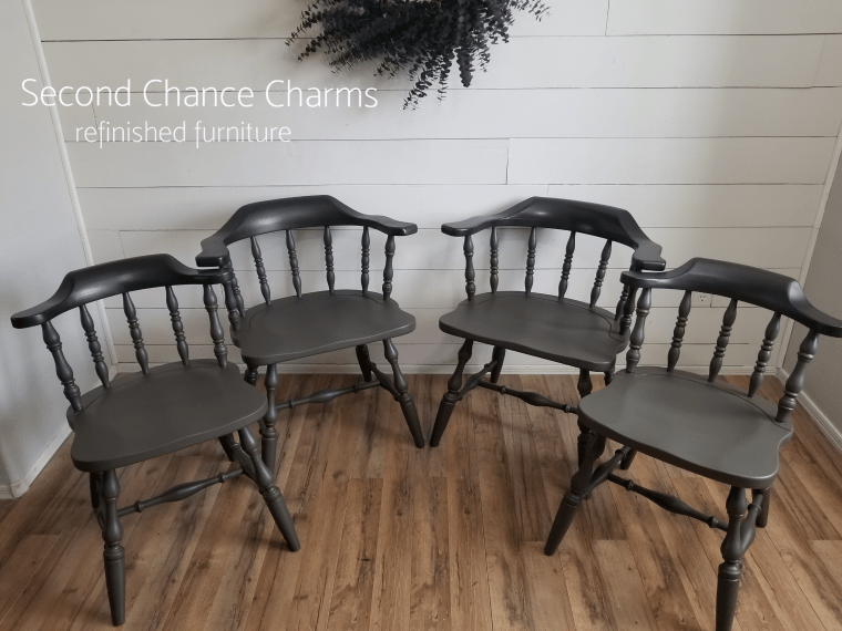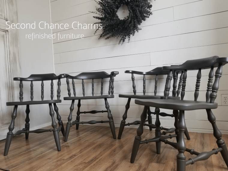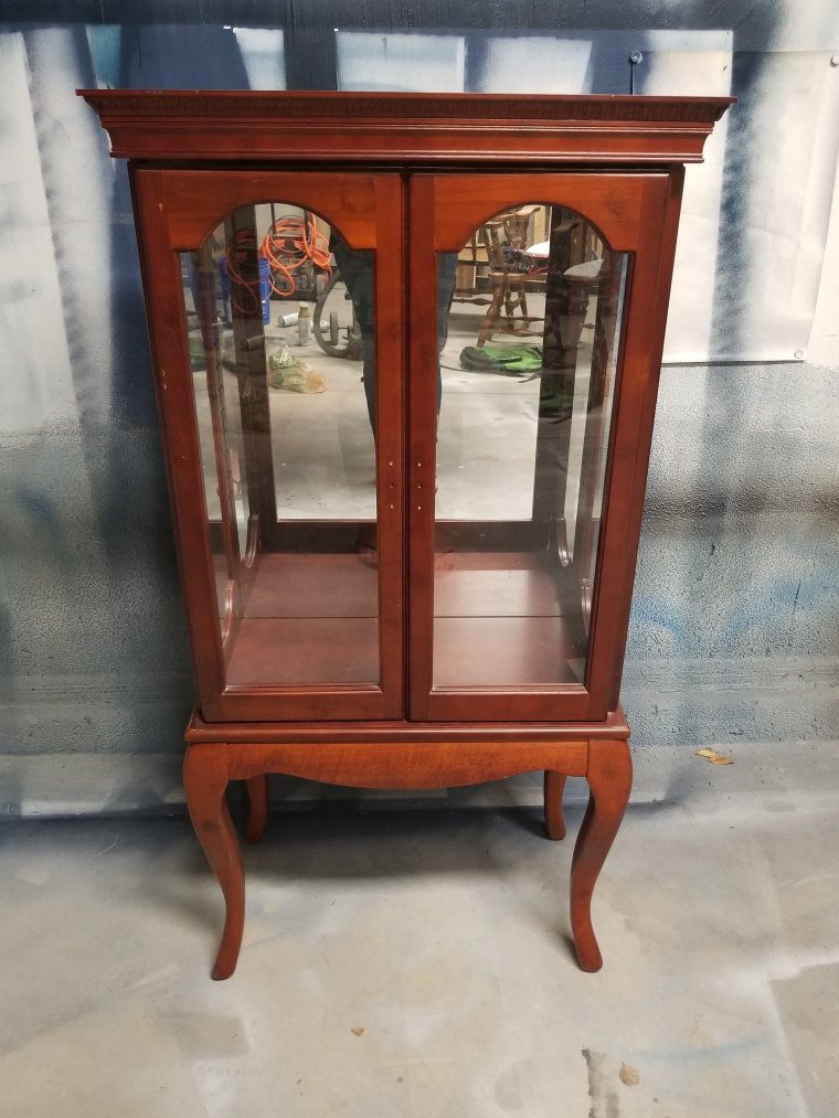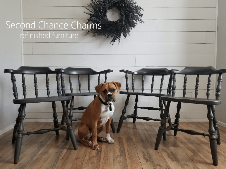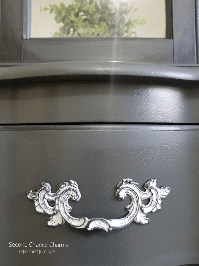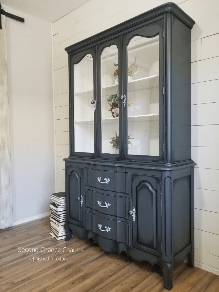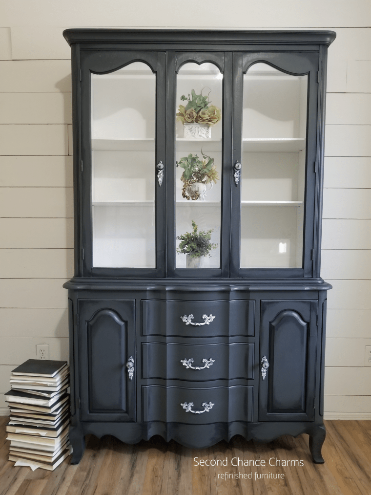After scrapping off her veneer, filling in all areas with wood filler, adding a new top, sanding and proper prep this beauty is ready to showcase her new look! A French provincial style hutch refinished in a dark gray using Sherwin-Williams Rock Bottom. Heavily glazed in Tricorn Black. Inside, backing and shelves are refinished in Snowbound White. Hardware revamped in Black and heavily antiqued in White for an added pop!