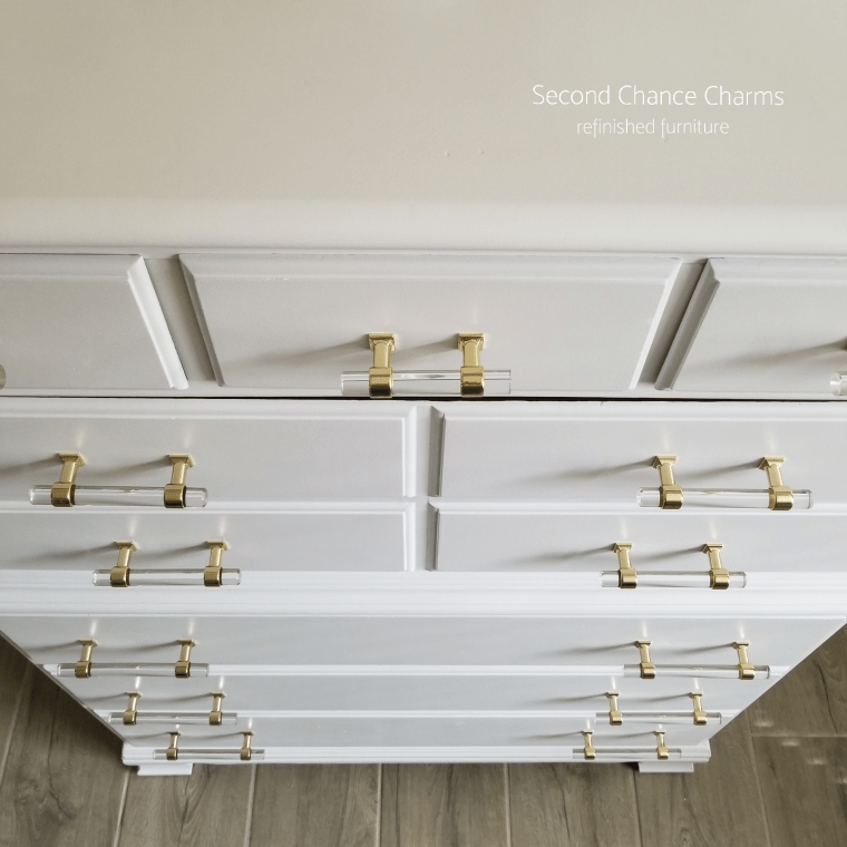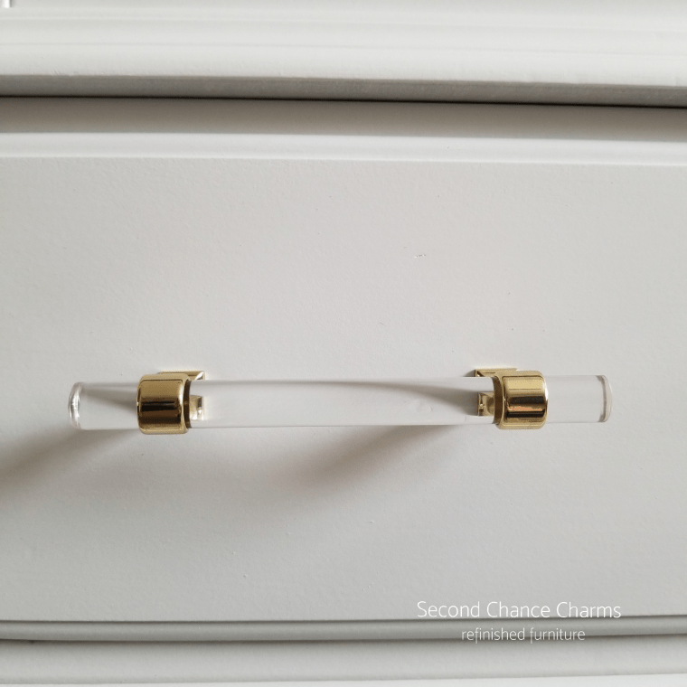 Refinished in a solid look using Sherwin-Williams High Hide White. New Glass and Gold pulls added. Meep!