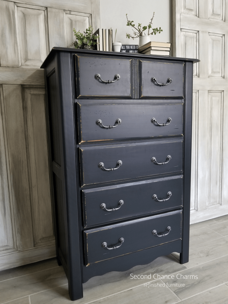 Chest of Drawers Published on March 25, 2019 by Second Chance Charms The final piece to my clients master bedroom makeover! Refinished in Sherwin-Williams Tricorn black. Distressed lightly in all the right places. Original hardware cleaned. Before: Share this: Click to share on Pinterest (Opens in new window) Pinterest Click to share on Facebook (Opens in new window) Facebook Click to email a link to a friend (Opens in new window) Email Click to share on X (Opens in new window) X Like Loading...