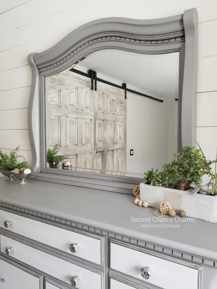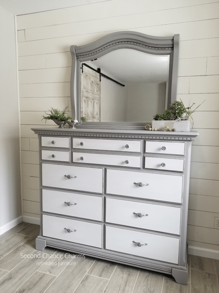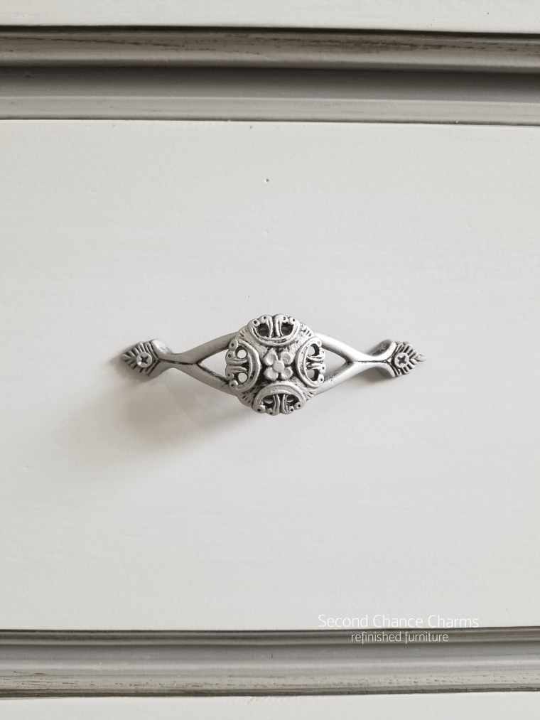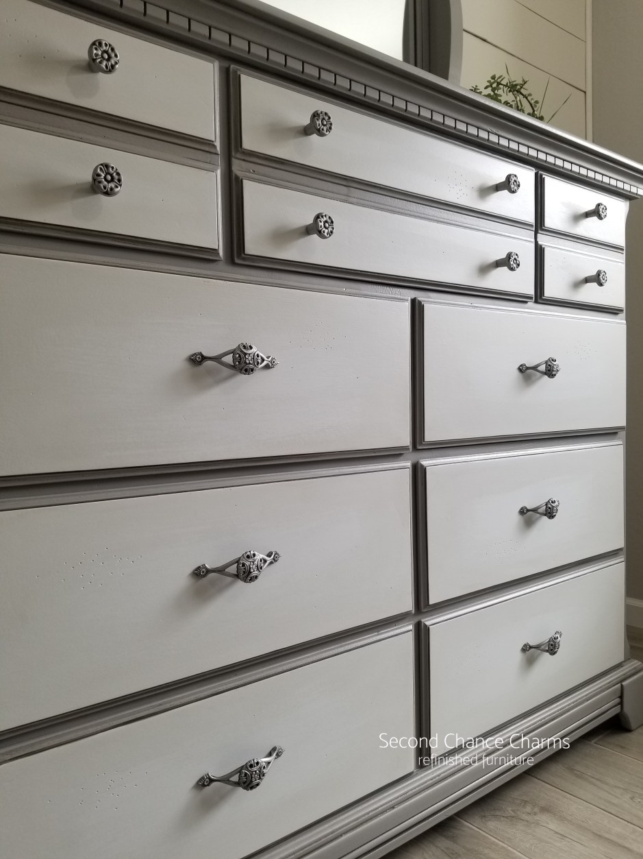 Refinished in Sherwin-Williams Dovetail and Reposed Gray. Glazed using Black Fox. New hardware purchase from Hobby Lobby and revamped in nickel and black glaze for an added bling.