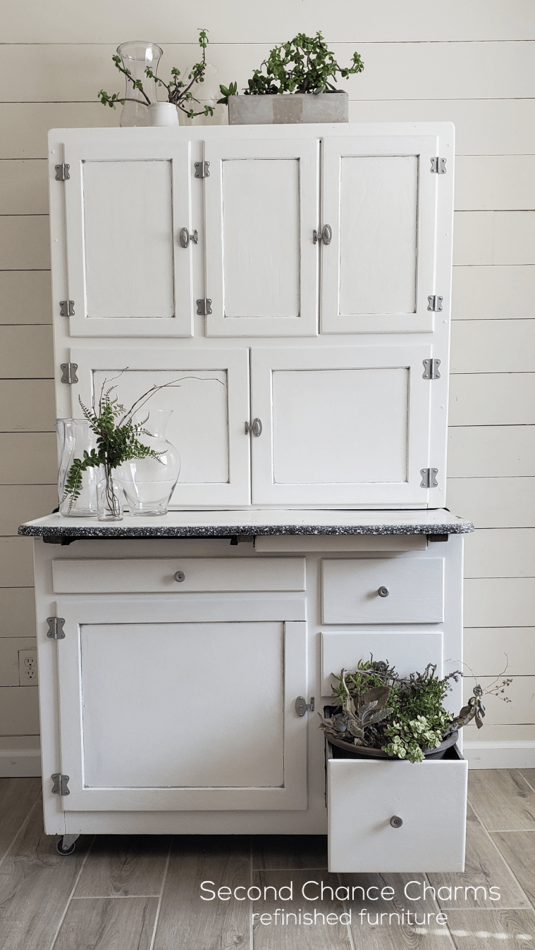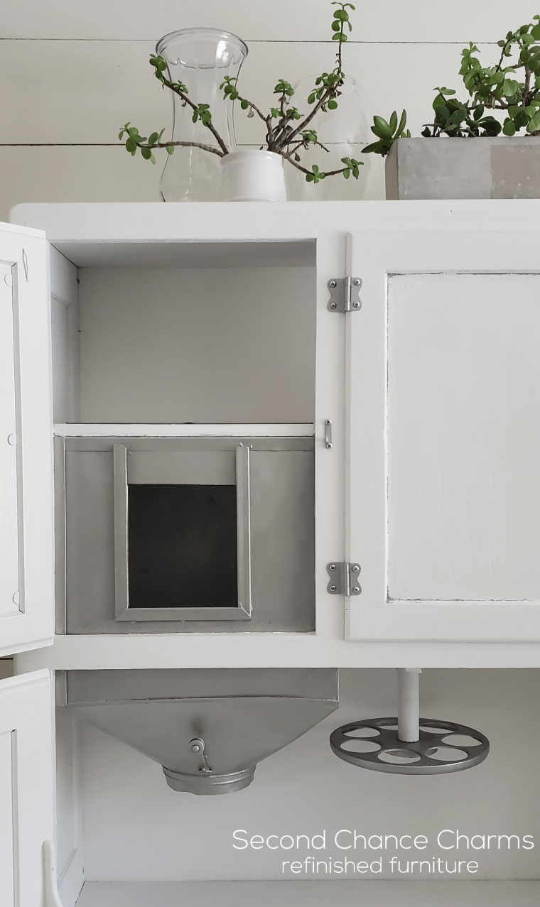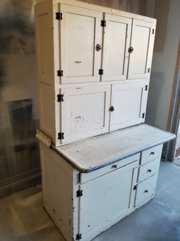 This 1914 White Beauty Hoosier Cabinet has been in my clients family for over 100 years and has seen better days. They wanted this antique beauty to have some parts restored, like the flour sifter, hardware, metal spice holder, and side metal mounts. The original wood body to be refinished in white.