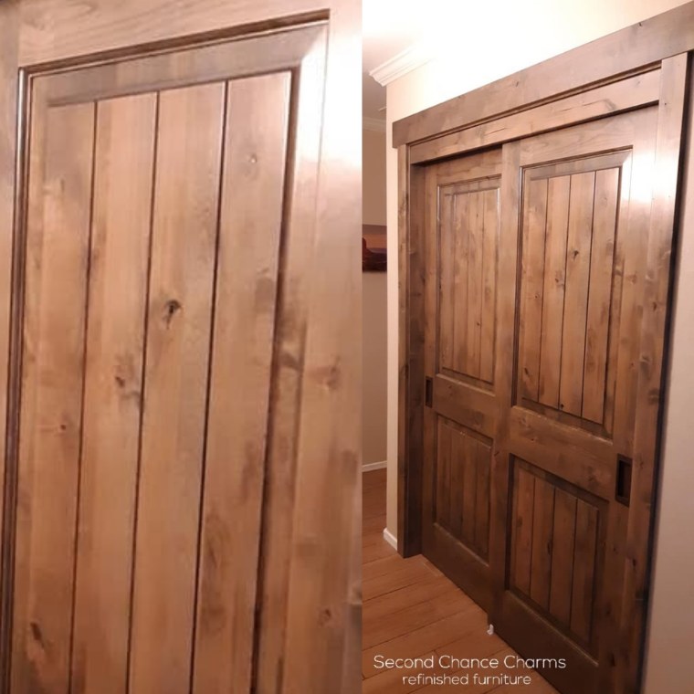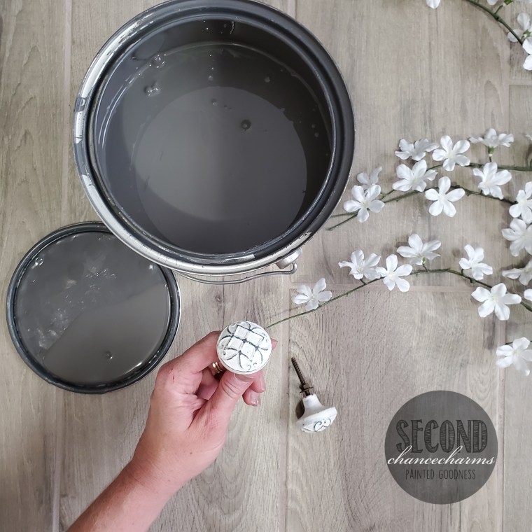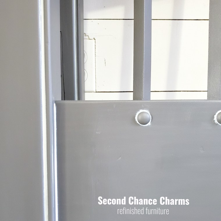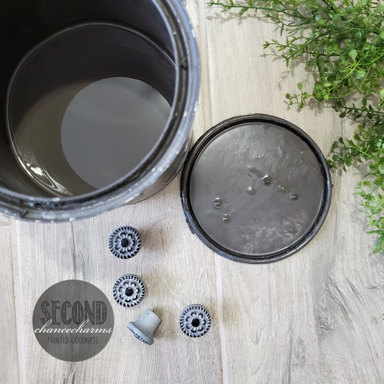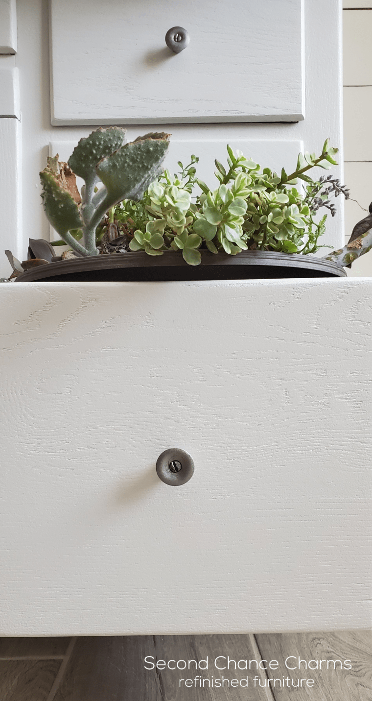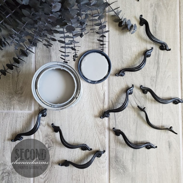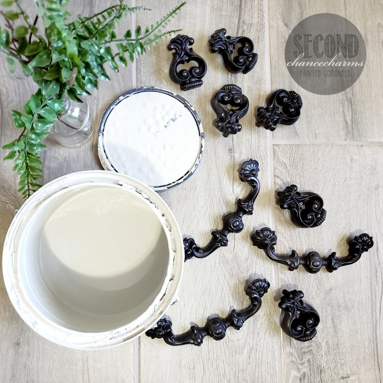 The hardware was black and grimy, but once stripped, soaked and clean I found engraving marker’s and the original color to be nickel! The hinges and knobs were stained from time so I revamped them in nickel to give it a new fresh look.