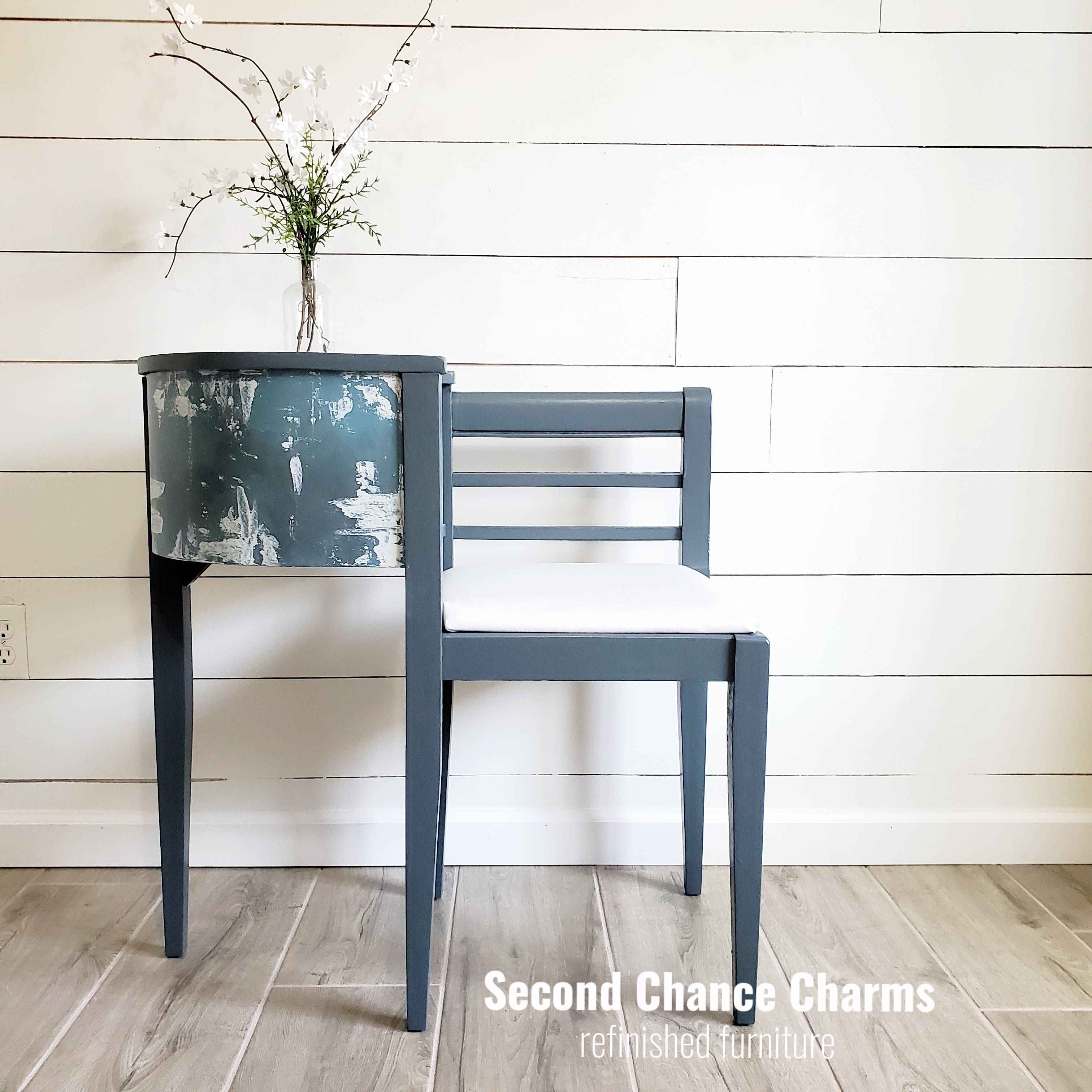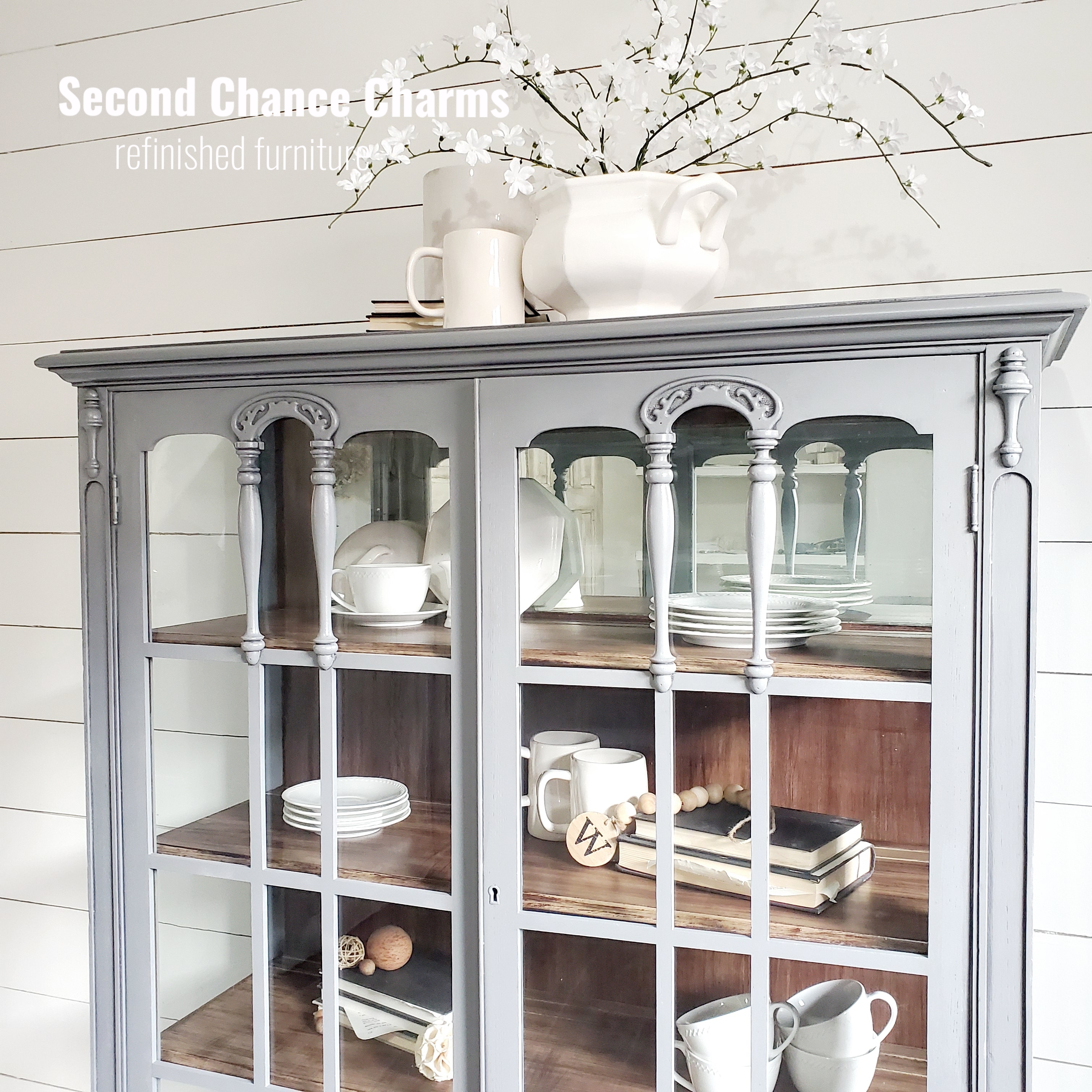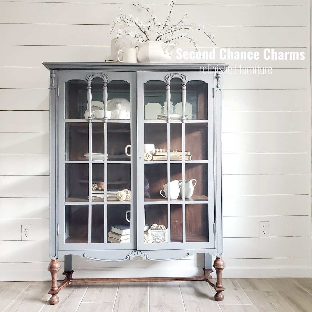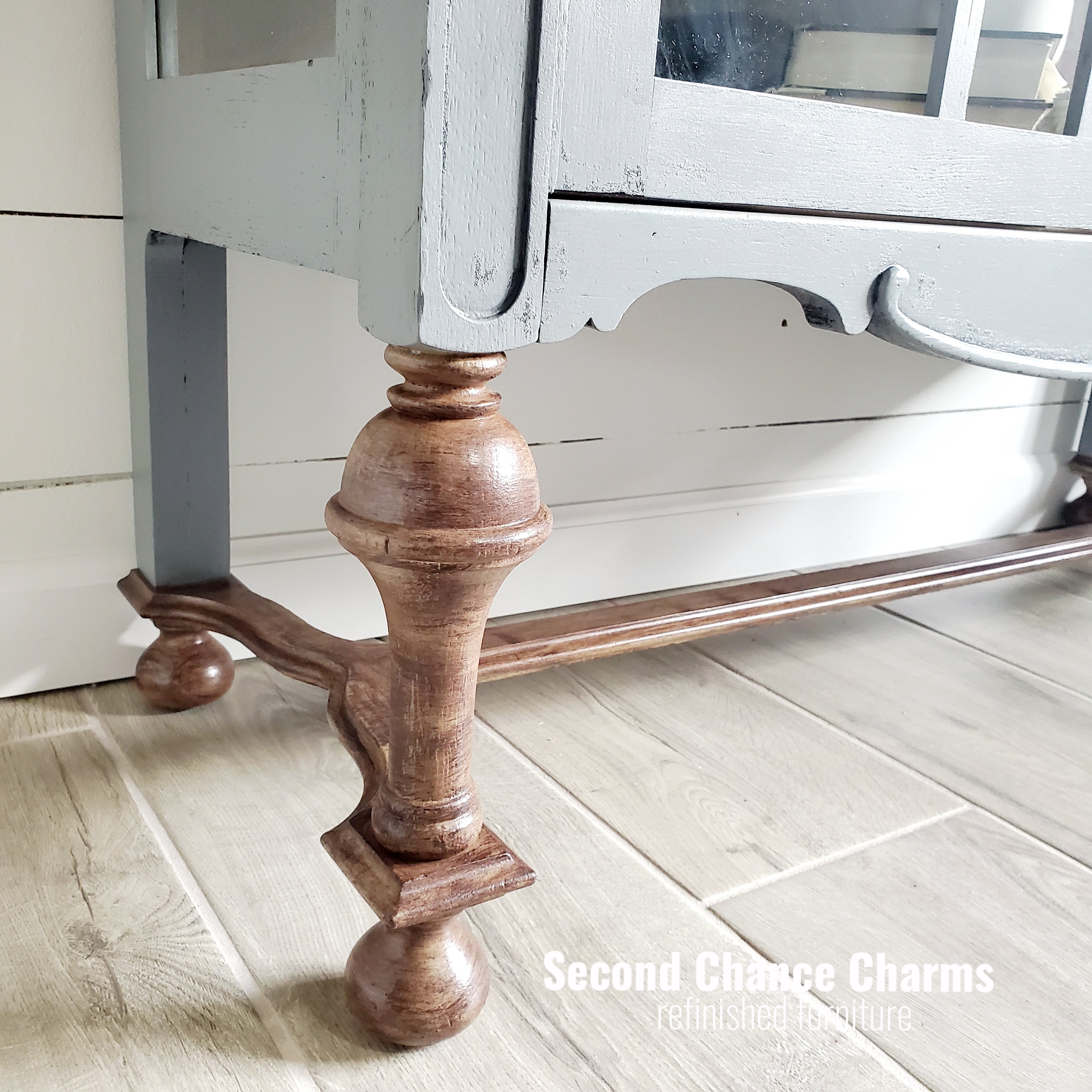 Refinished in Sherwin-Williams Cityscape. Glazed in Pepercorn. The inside and gorgeous legs have been stained in General Finishes Java.