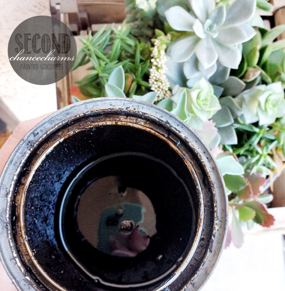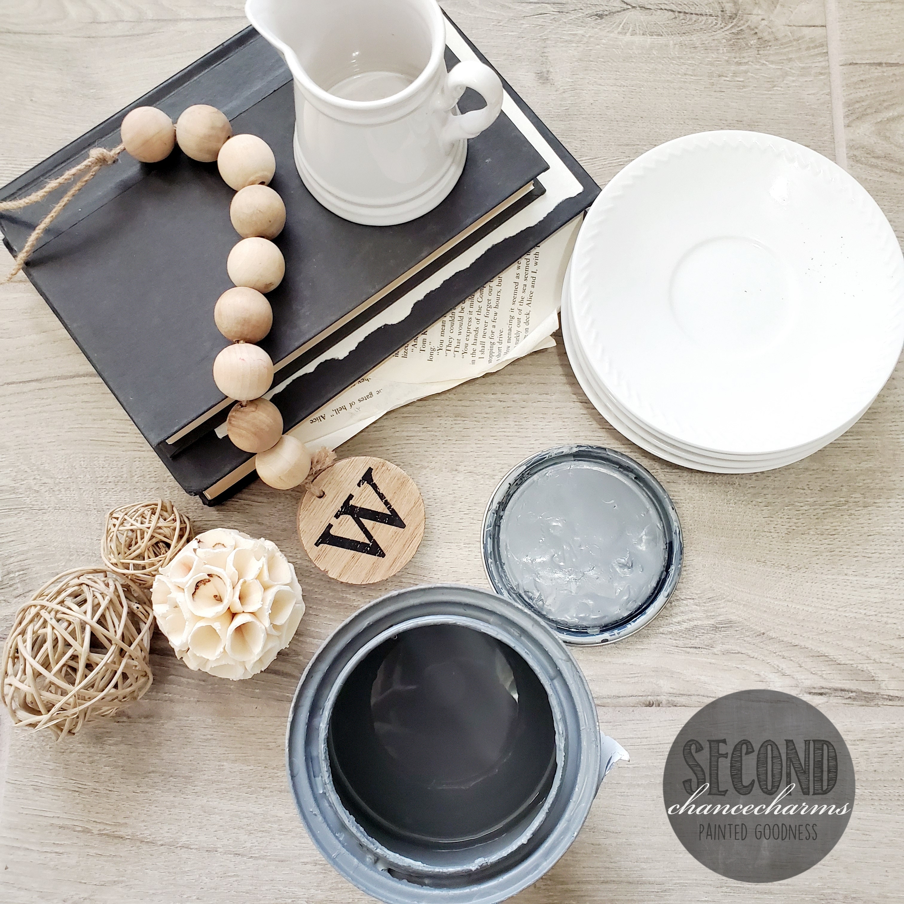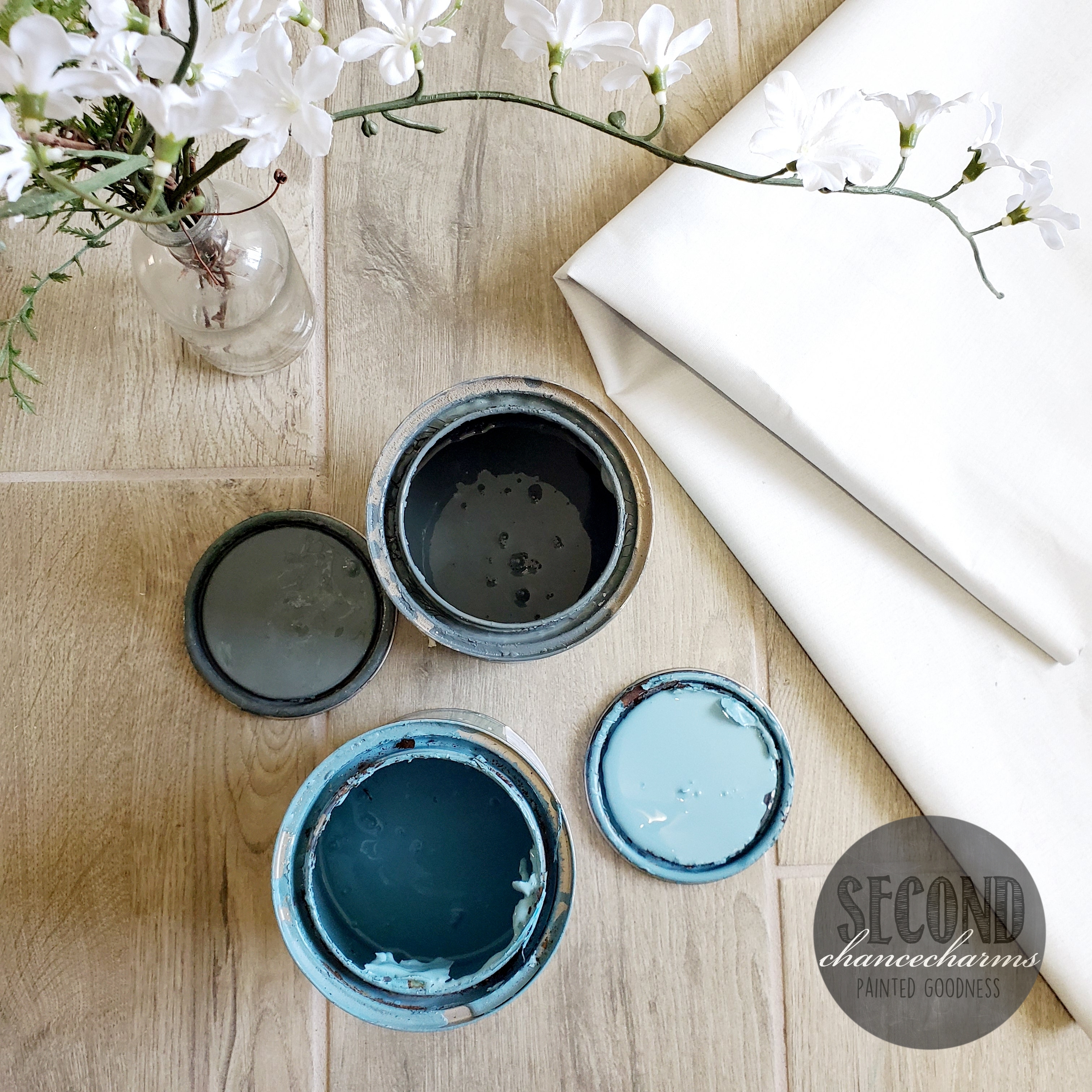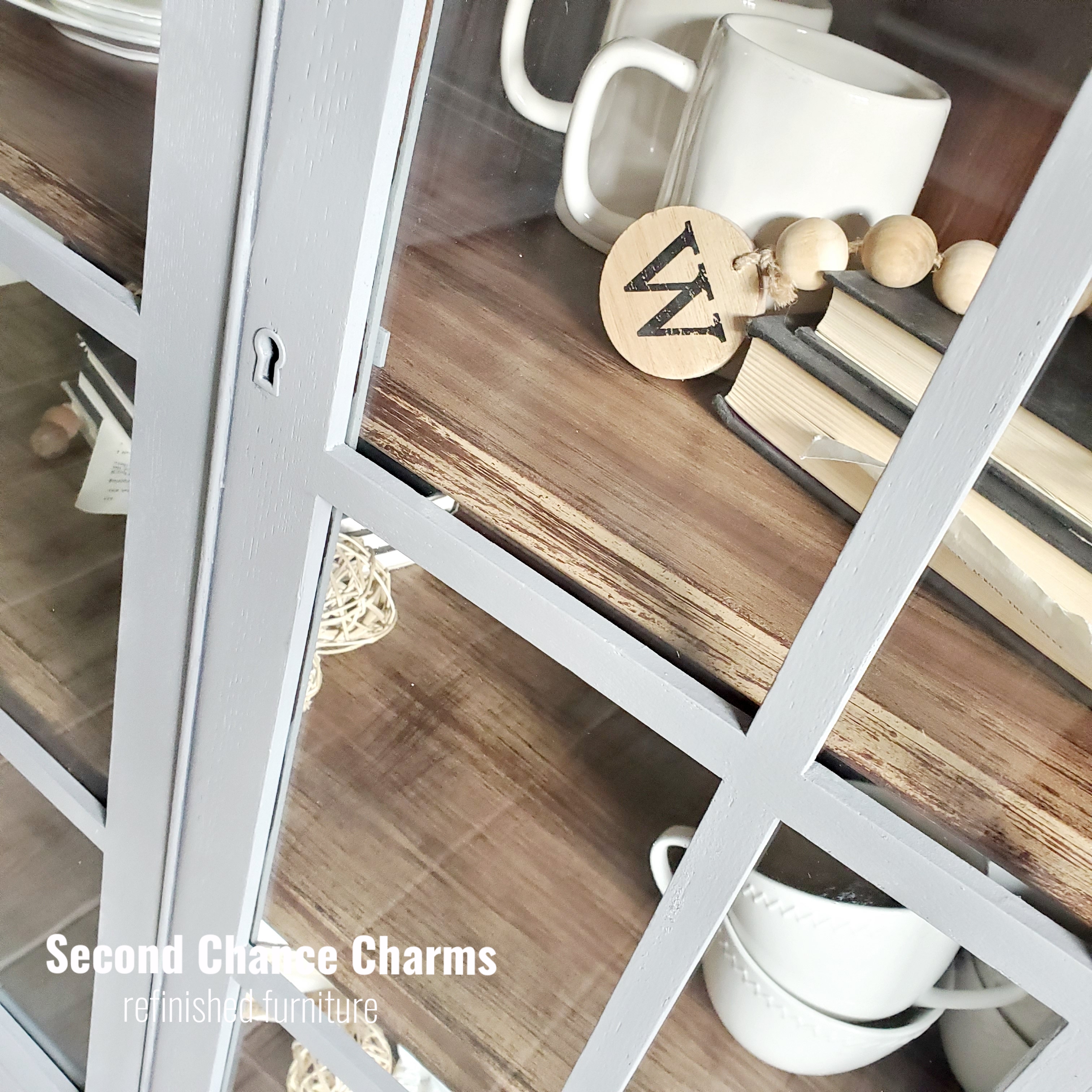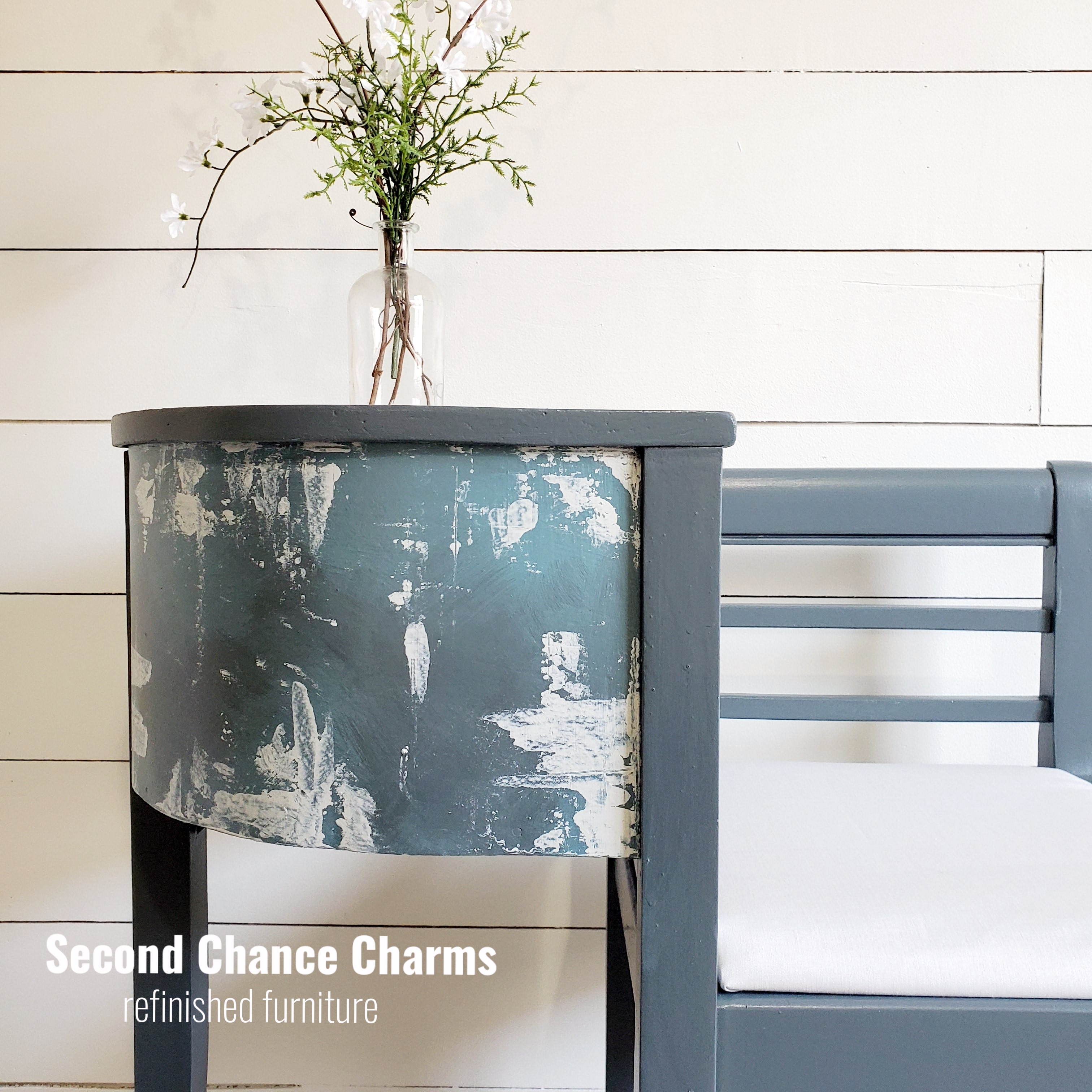 Refinished in Sherwin-Williams Cityscape. Glazed in Pepercorn. The inside and gorgeous legs have been stained in General Finishes Java.