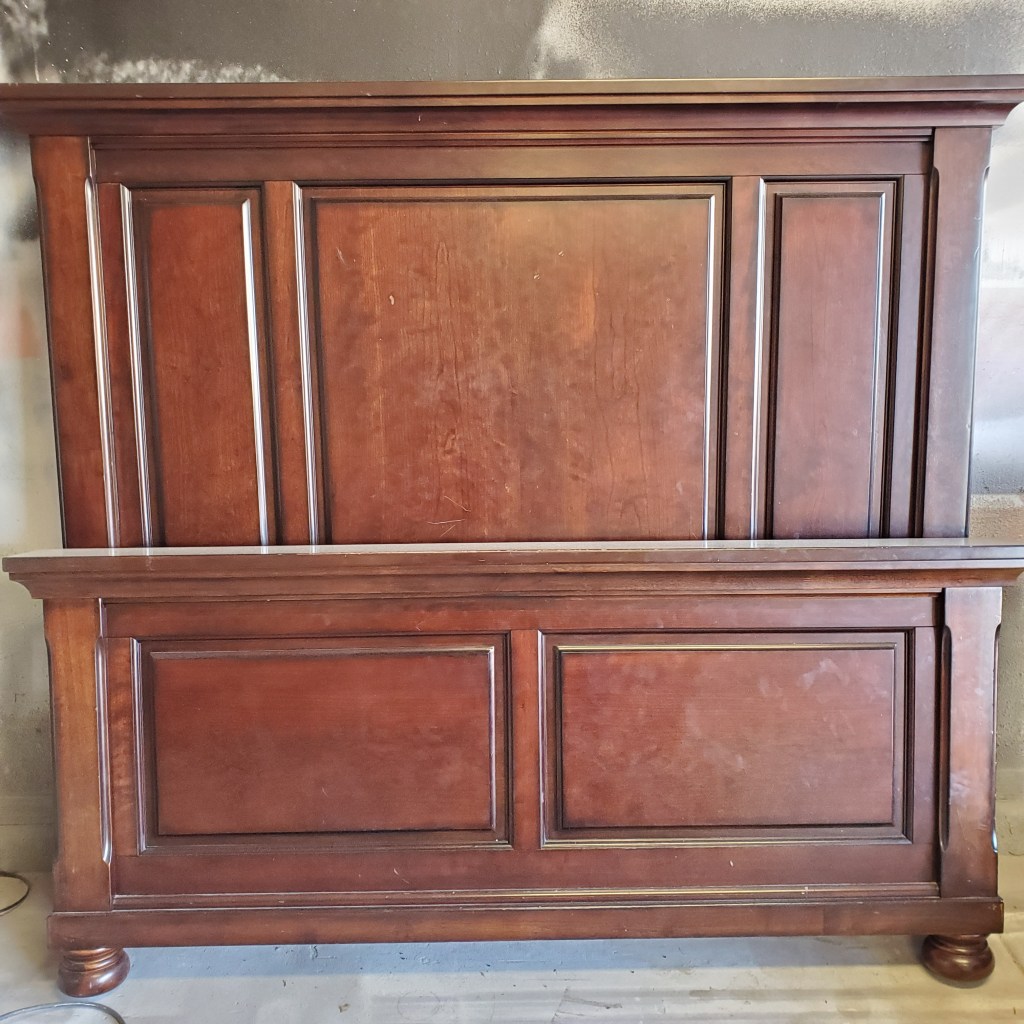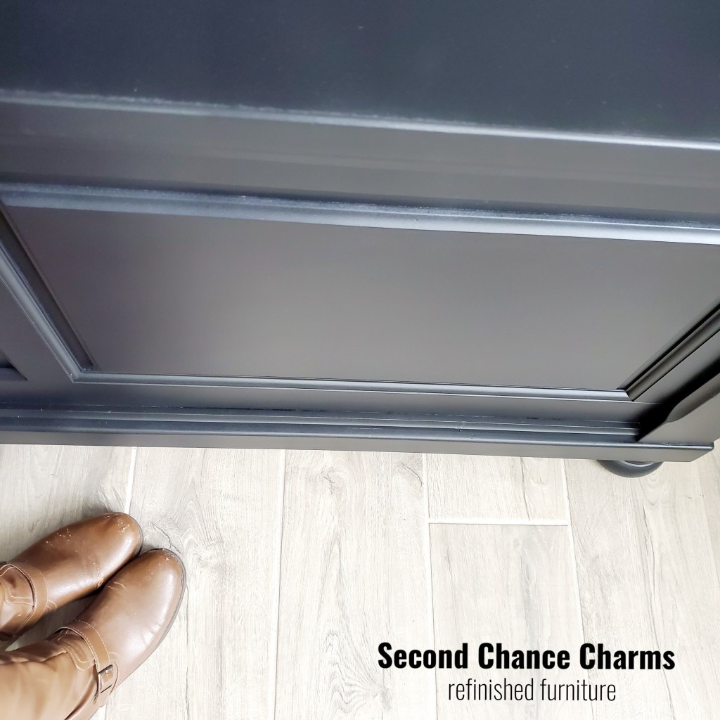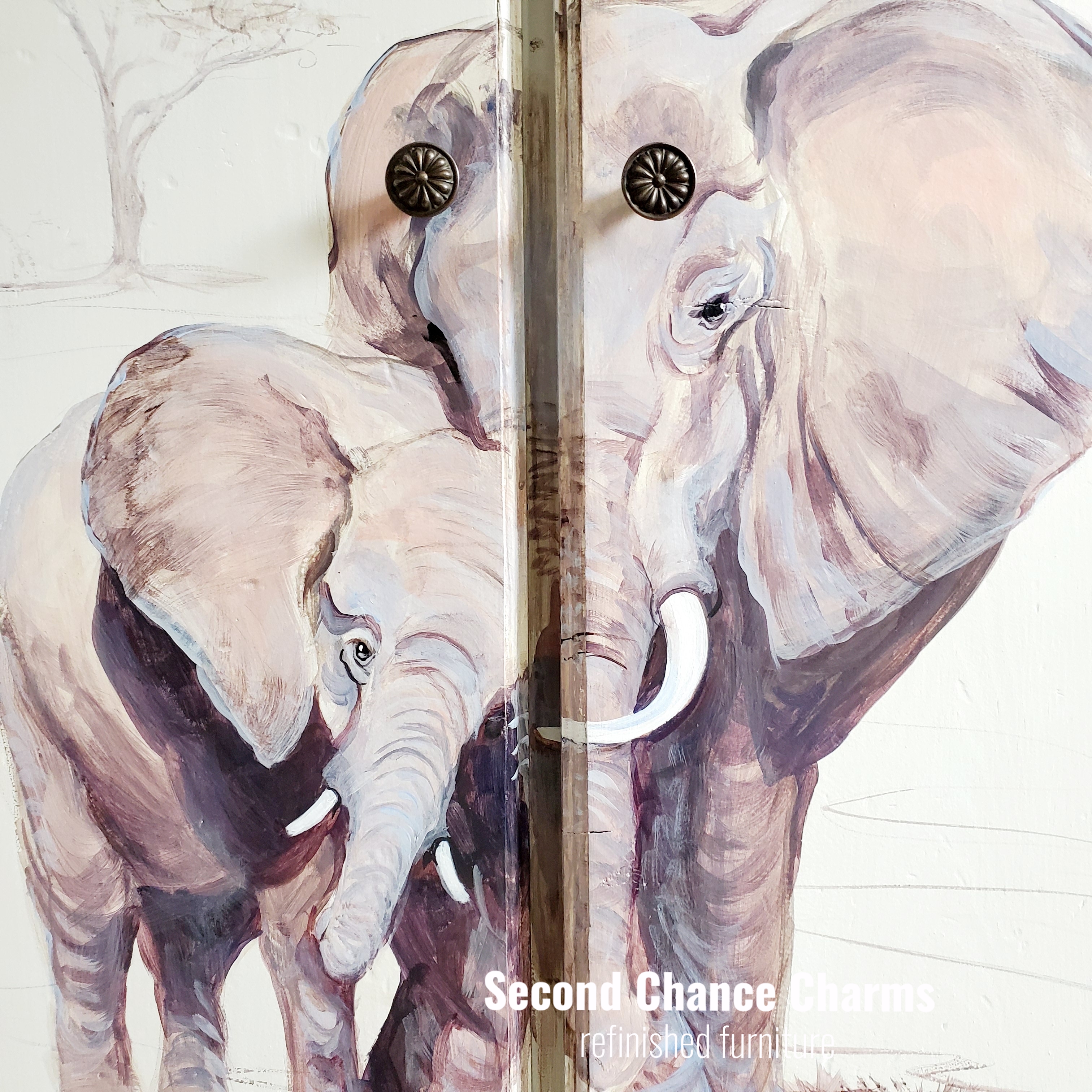 In love with how this cabinet turned out! My clients son built this cabinet when he was in High School many years ago. His mother enjoyed it and during a down size had the wonderful thought of getting this fellow refinished for her beloved daughter in law. Her son’s wife has a love for elephants so Maureen Flanigan handpainted both a mom and baby elephant on the face of the doors in acrylic paint.