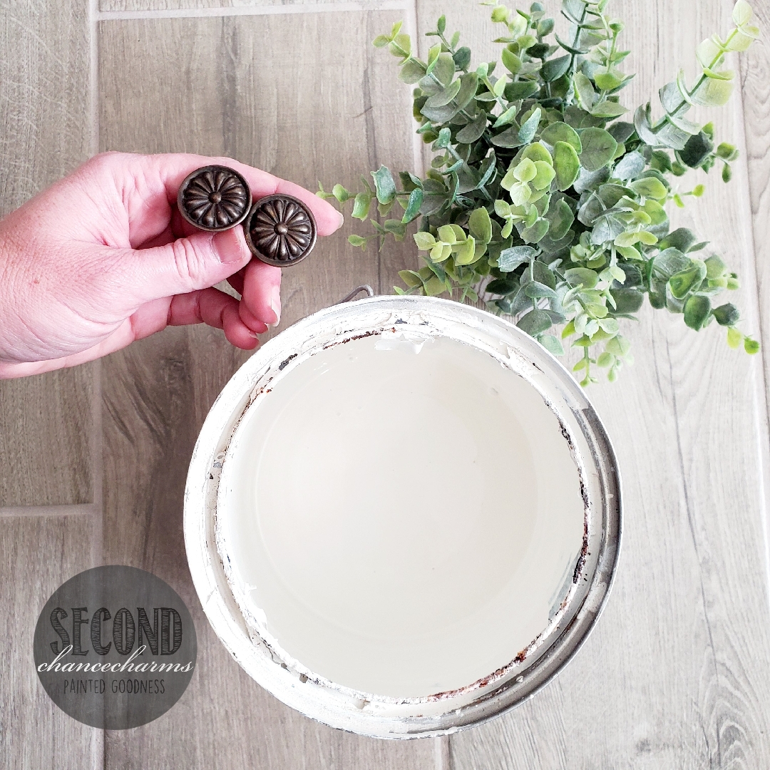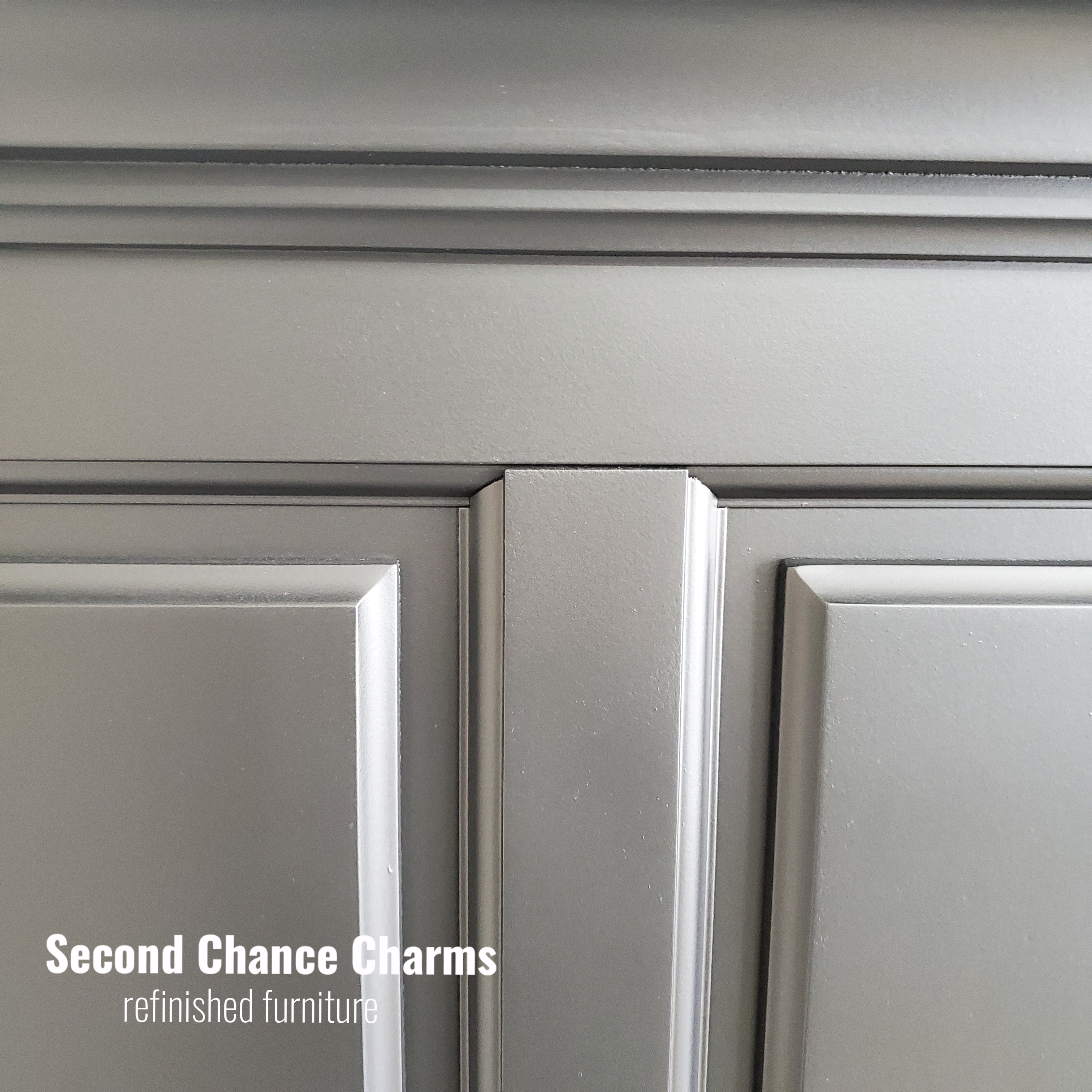 Refinished in Sherwin-Williams Greek Villa and glazed in brown. Hardware left in original state but cleaned up.