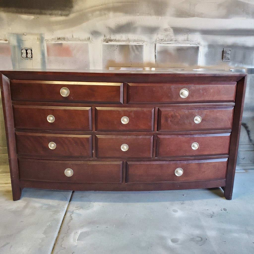 SOLD! A gorgeous farmhouse front bowed dresser! Perfect for any use such as a coffee bar, bedroom and or television unit.