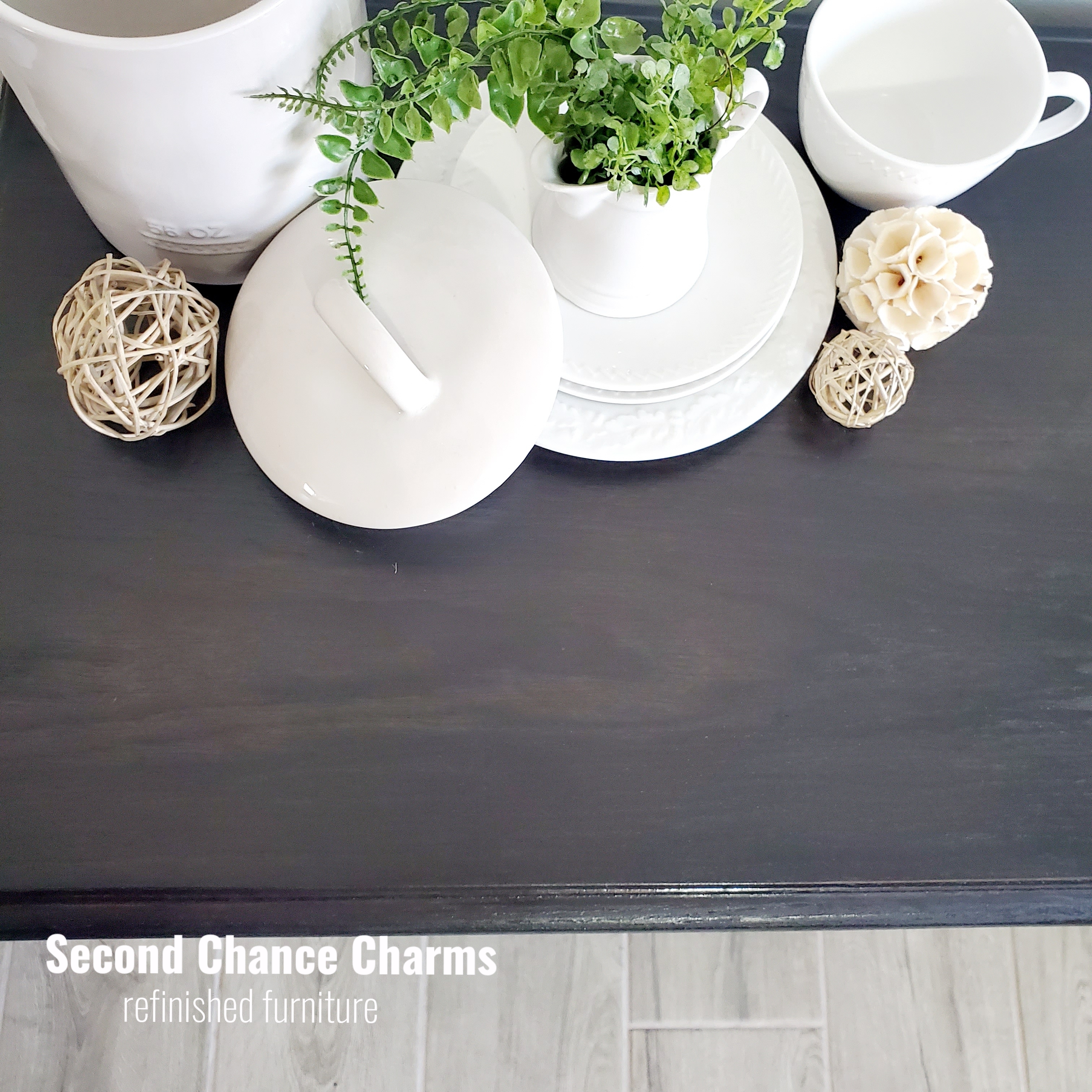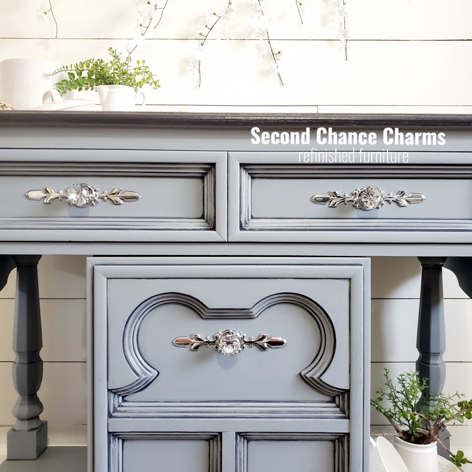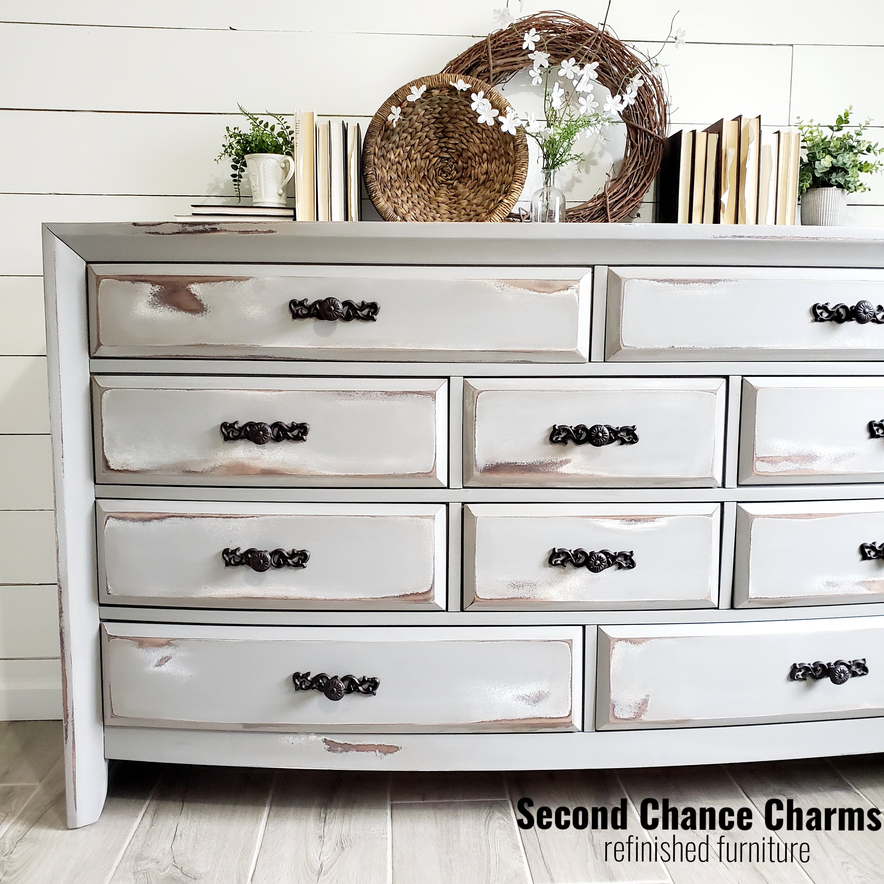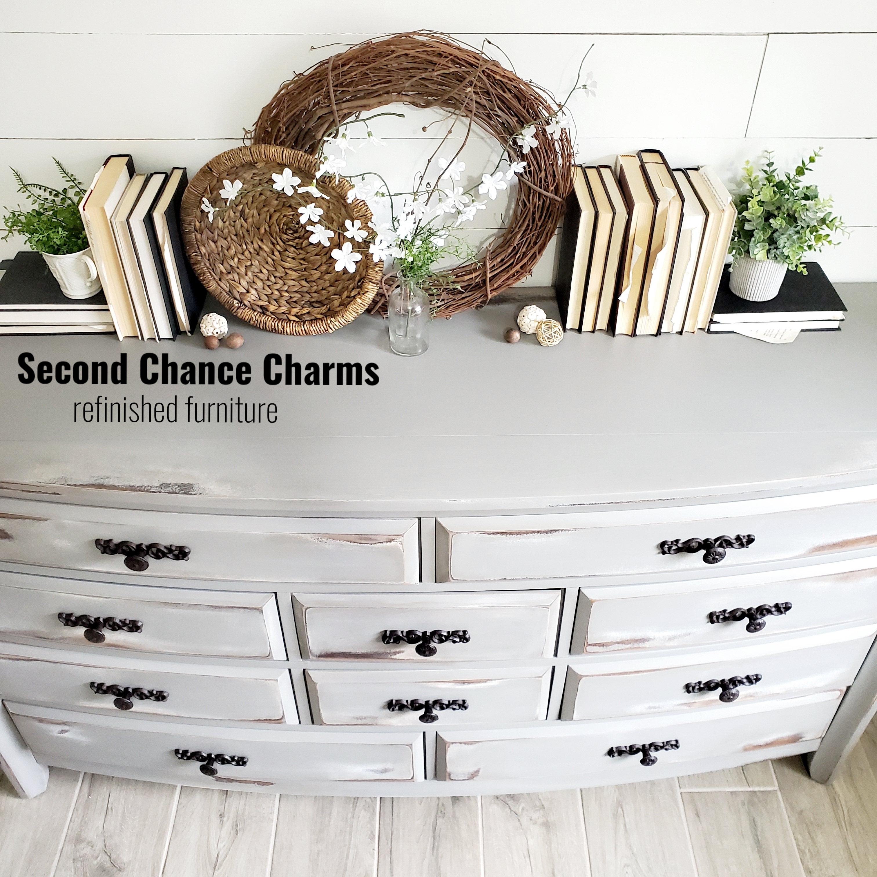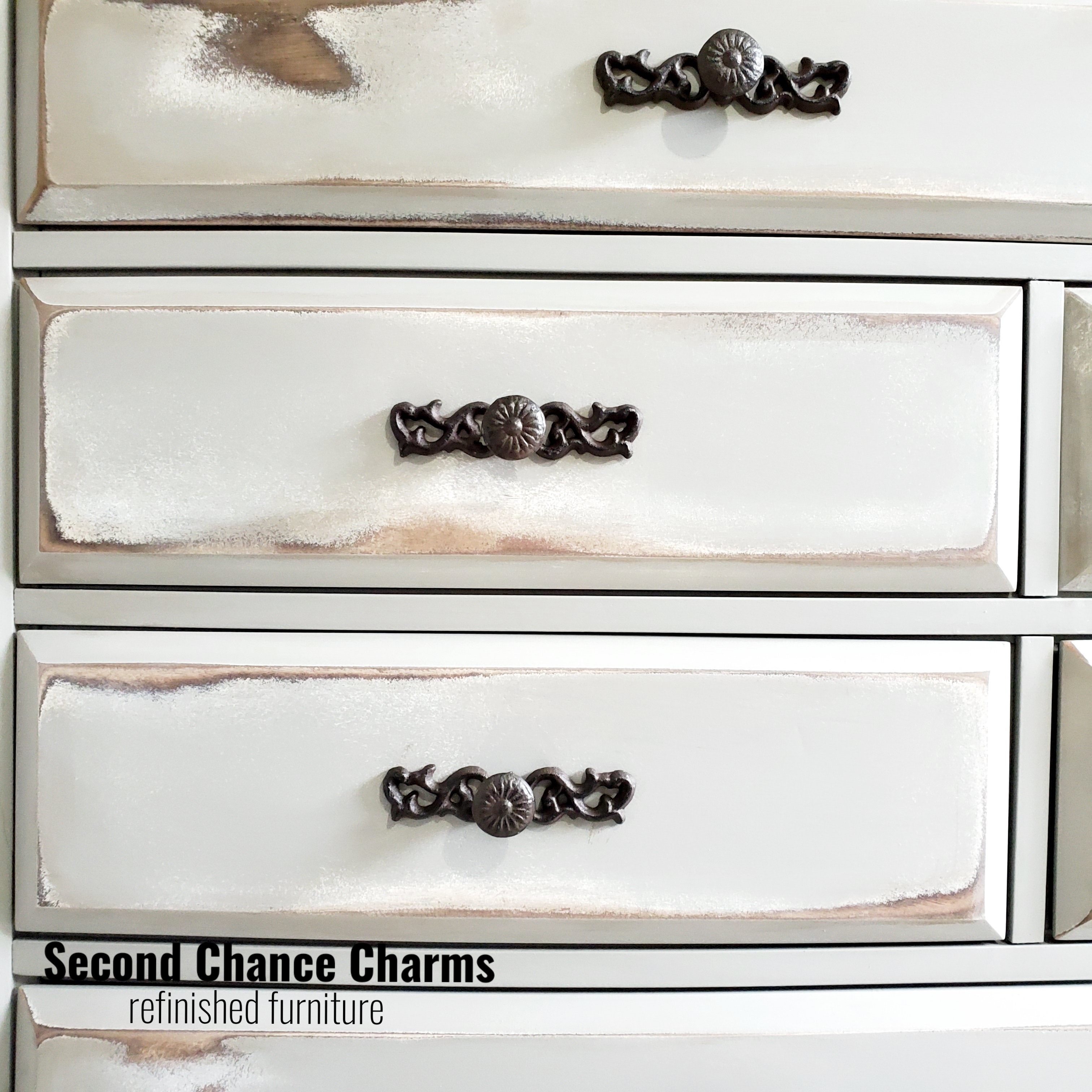 Refinished in Sherwin-Williams Dovetail and heavily distressed for a shabby look. Added new Brown Flourish Metal Knobs with Plates from Hobby Lobby to give her that lovely farmhouse charm. Perfect for any space!