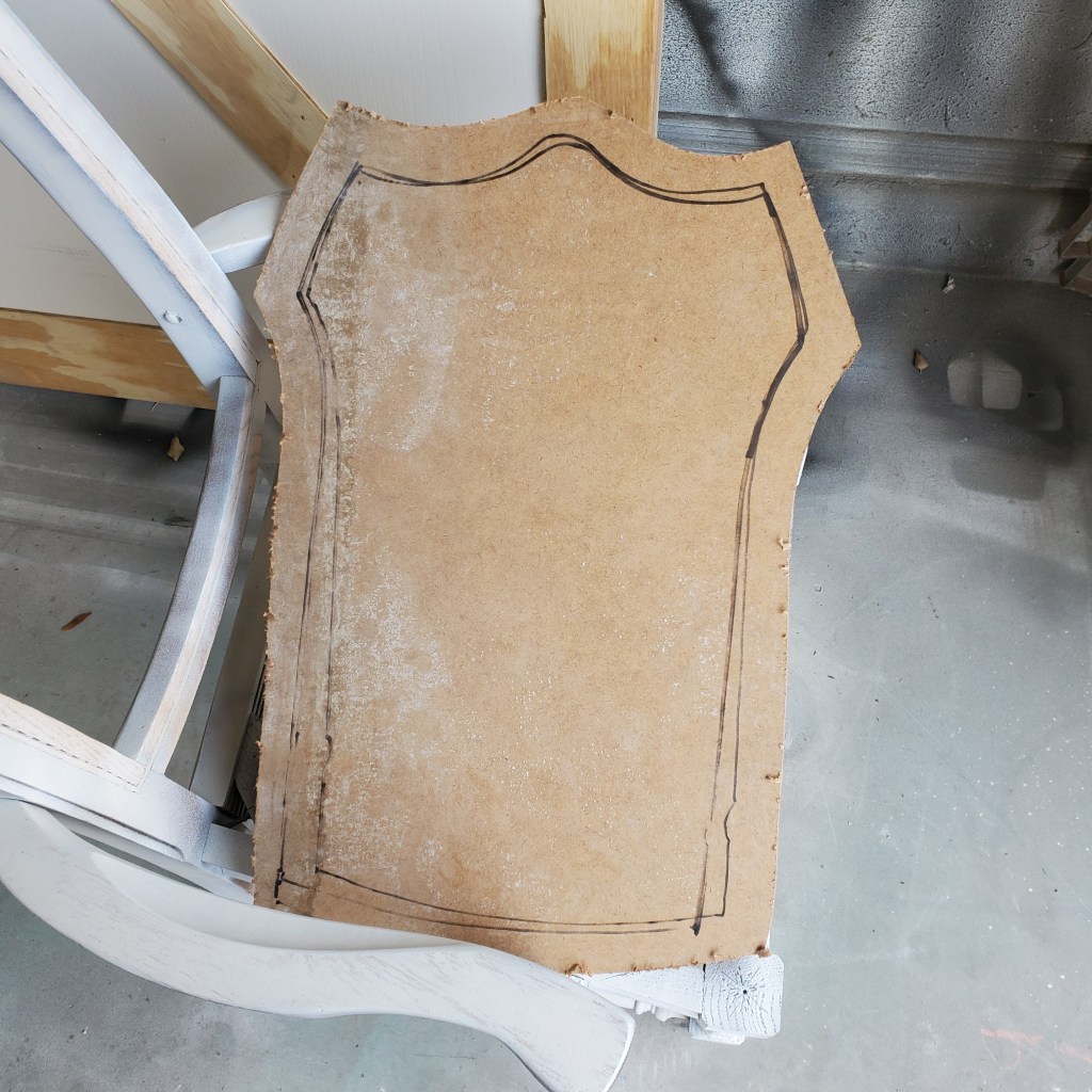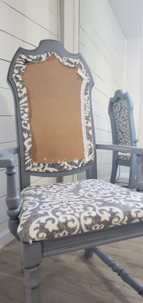 Back of chair. Fabric tightly pulled over the new wood section. Seat cushion reupholstering. I always remove the old. Love starting fresh!Doing each step helped me remain calm and had me realize how this was all going to work out