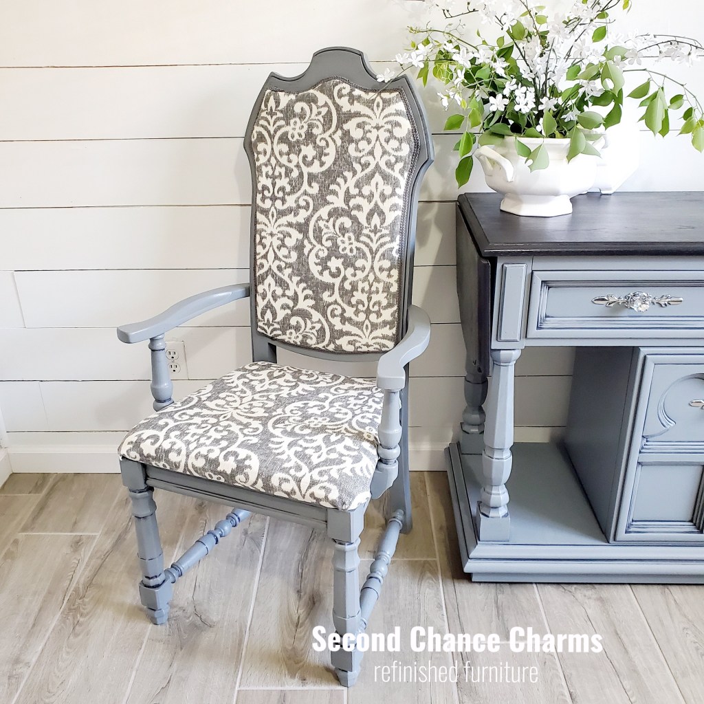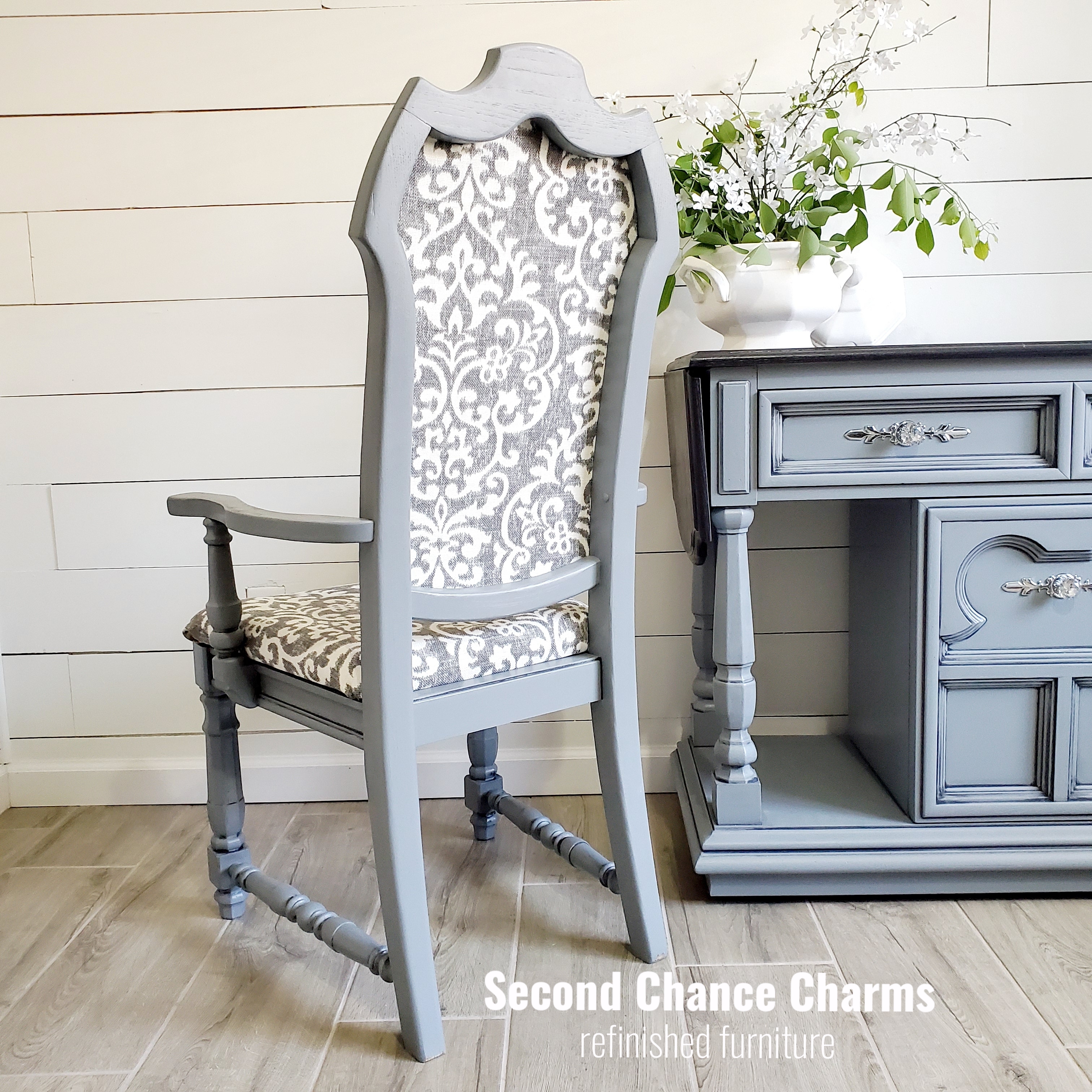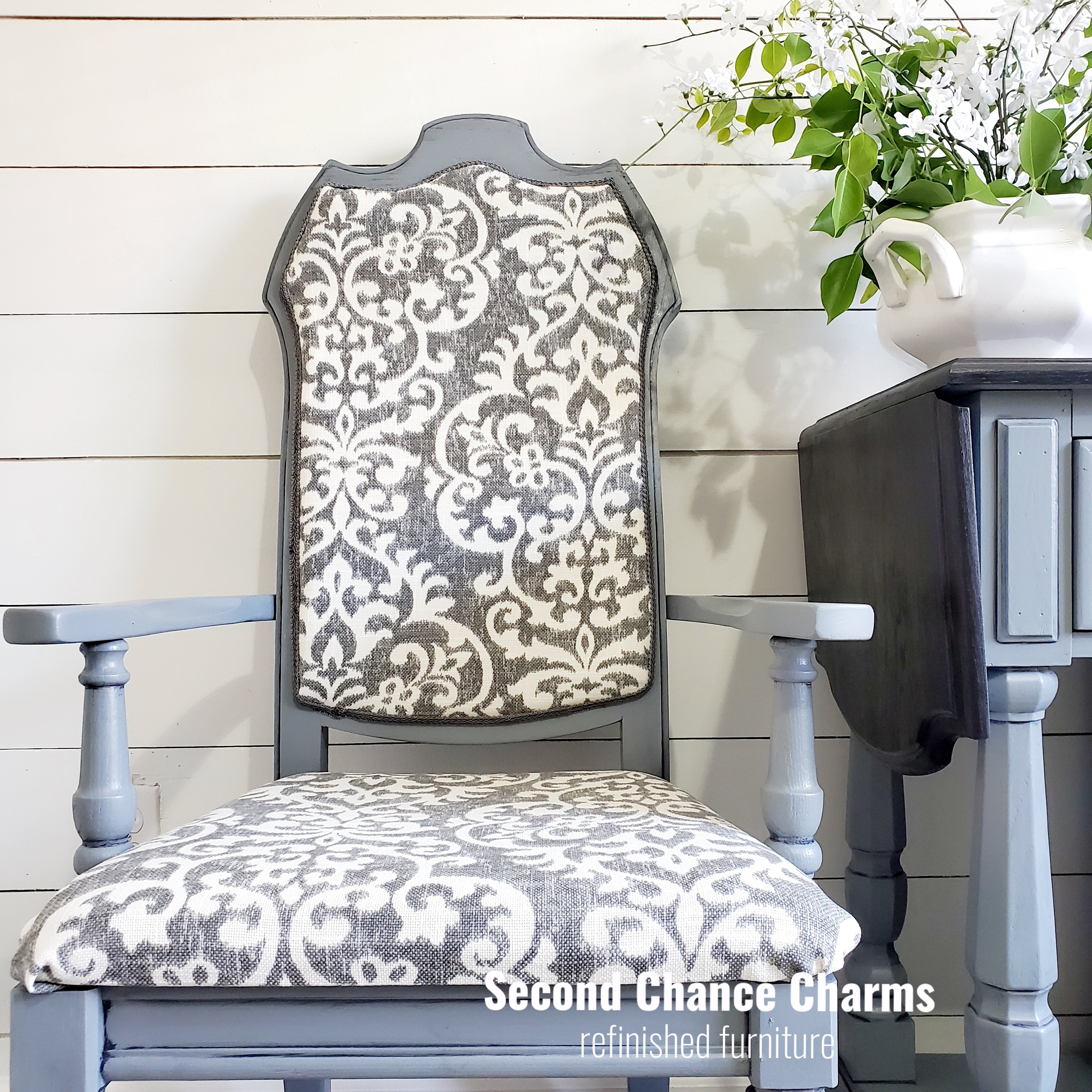 Refinished in Sherwin-Williams Software and Glazed in Cyberspace. Matching the buffet I recently finished. My client picked out a cream and grey damask fabric from Joanns. A dark grey cord to match and to finish her off!