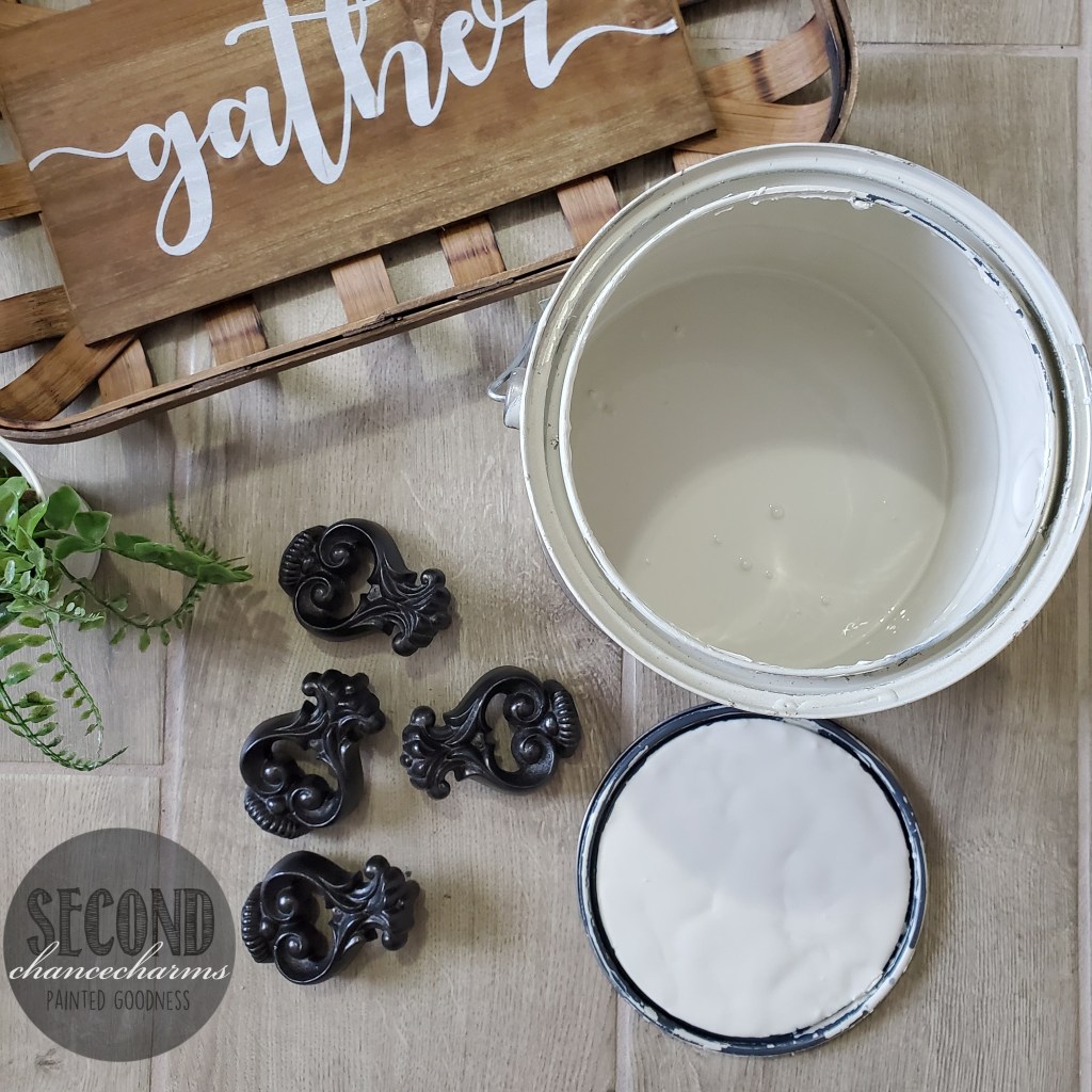 Refinished in Sherwin-Williams Useful Grey and blended with white. Distressed for a farmhouse charm and glazed in brown. Updated the original hardware in Oil Rubbed Bronze.